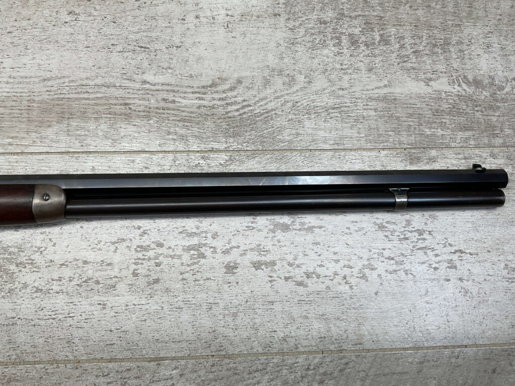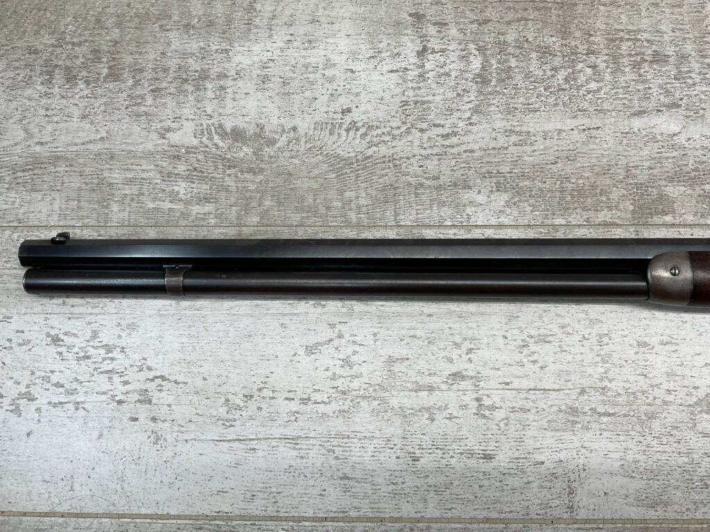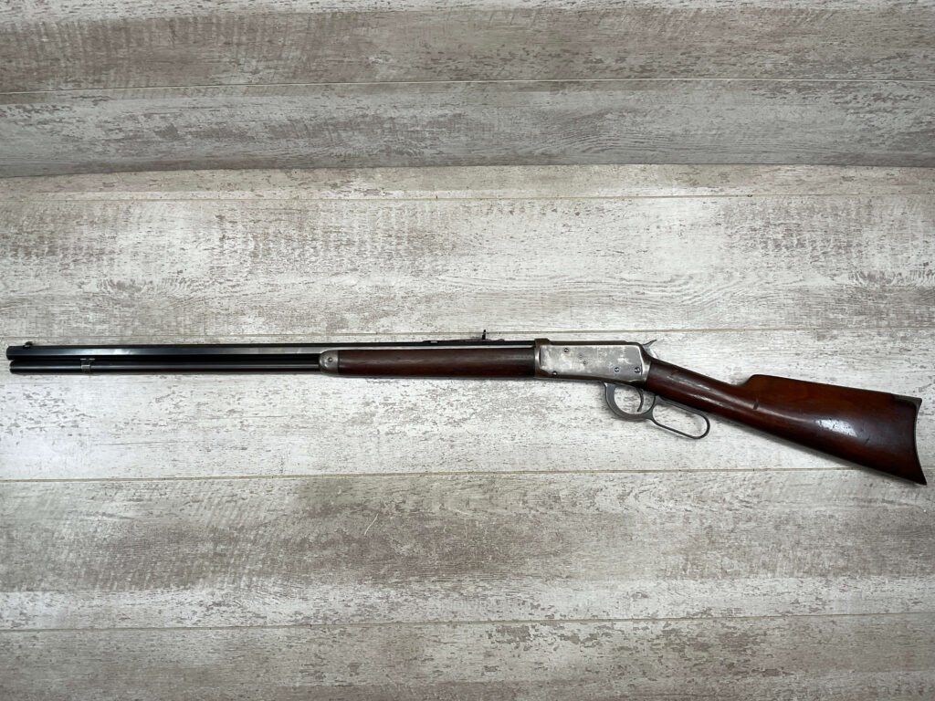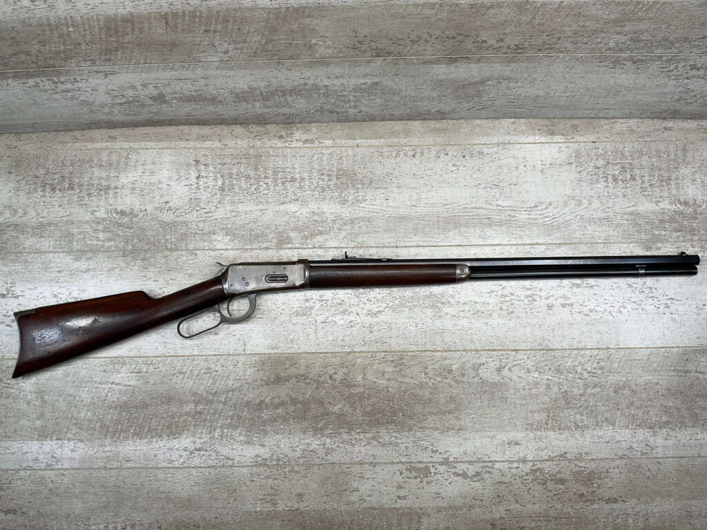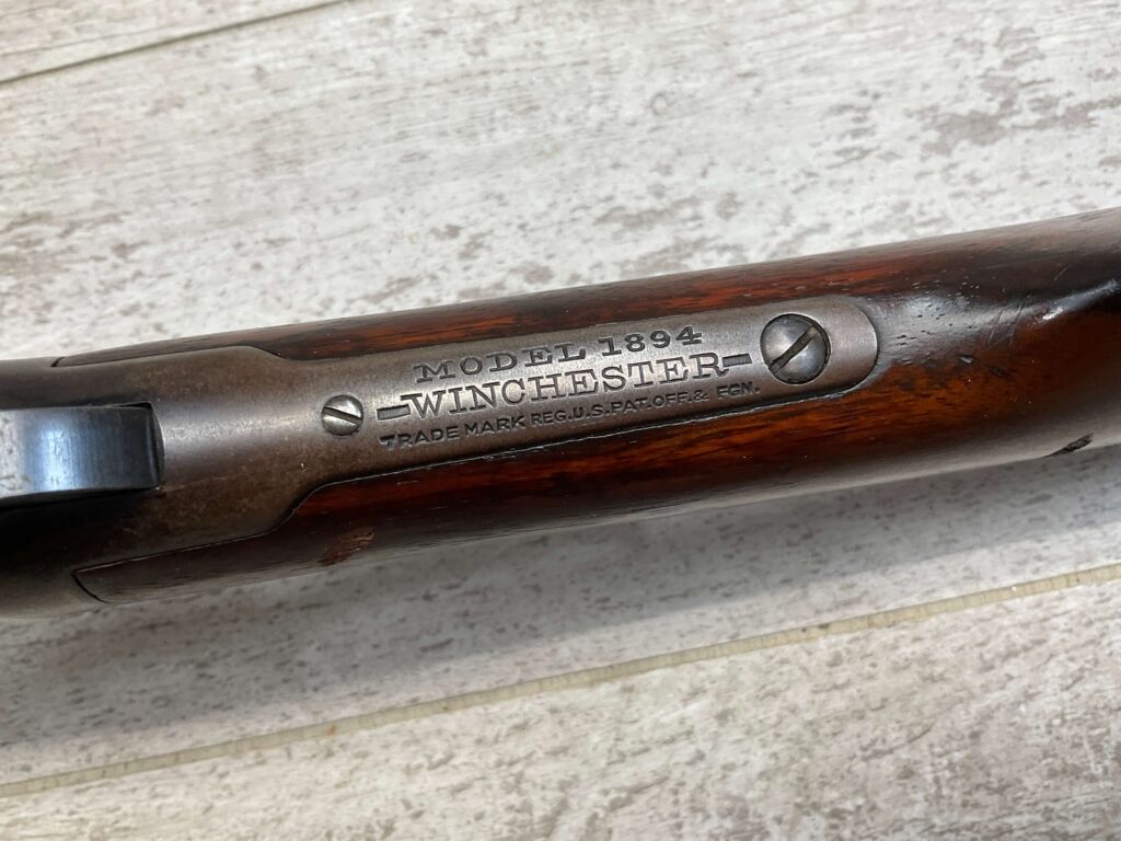 WINCHESTER MODEL 1894 .38-55 CAL LEVER ACTION RIFLE, 1919 MFR #894339, 26″ OCTAGON BARREL W/ EXC BORE & RIFLING, 80% ORIGINAL BLUE, RECEIVER TURNING GREY /Â BROWN PATINA, EXC STOCK W/ LIGHT IMPRESSIONS, CRESCENT BUTT STOCK W/ METAL PLATE, FULL LENGTH TUBE MAGAZINE, SMOOTH ACTION!