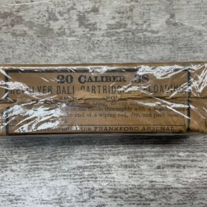 1905 FRANKFORD ARSENAL 20 CALIBER .38 AMMO, FULL BOX, VINTAGE, BOX IS IN FANTASTIC CONDITION FOR AGE AND IS COVERED WITH A PLASTIC WRAP, LOOKS POSSIBLY OPENED, MARKED ON THE TOP OF BOX ‘JUNE 21, 1905’