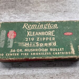 REMINGTON KLEANBORE 219 ZIPPER, 56GR. MUSHROOM BULLET, FULL BOX, BOX SHOWS EDGE WEAR.