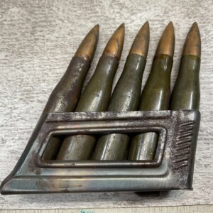 UNKNOWN MANUFACTURER 1942 MANNLICHER AMMO, 8X56MMR, VINTAGE, 5 ROUNDS ON A STRIPPER CLIP, HEADSTAMPED “M W/ L INSIDE / 42”, STRIPPER CLIP ALSO STAMPED WITH “M W/ L INSIDE” UNKNOWN STAMP, BOTH CLIP AND AMMO ARE A BIT RUSTY, OVERALL GOOD CONDITION.