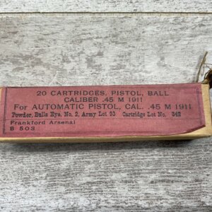 FRANKFORD ARSENAL .30 BLANK CARTRIDGES, FOR MODEL 1903 RIFLE, TOP OF BOX STAMPED “MAR. 19, 1918 LOADING MACHINE 26”, BOX IS IN GREAT CONDITION WITH TEAR ON AREA MARKED “OPEN HERE” WHERE BOX IS OPENED.