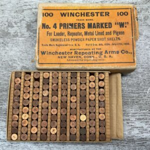 WINCHESTER 1900 NO.4 PRIMERS MARKED “W”, FULL BOX, RARE, VINTAGE, BOX IS SLIGHTLY DAMAGED, BUT FRONT IS CLEAR AND READABLE, BOX IS IN GREAT CONDITION FOR AGE
