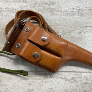 CHINESE IMPORT BOLO LEATHER HOLSTER W/ MAG POUCH, NO MARKINGS, LANYARD LOOP, LEATHER SHOULDER STRAP, CLEANING ROD, EXCELLENT OVERALL
