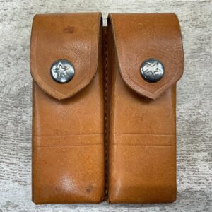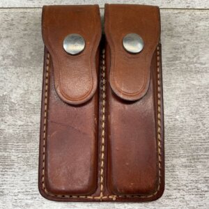 BIANCHI 20-C .22/9MM TWO MAG POUCH, BROWN LEATHER, POUCH IS IN VG-EXC CONDITION, GOOD STITCHING, BACK IS MARKED “BIANCHI / MONROVIA, CALIF. / 20-C / .22/9MM”.