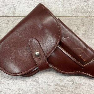 EAST GERMAN MAKAROV BROWN HOLSTER W/ LANYARD, INSIDE HOLSTER MARKED SEVERAL TIMES INCLUDING “MADE IN GERMANY” STAMP, “H.H” WRITTEN IN PEN, “HIRSCH” WRITTEN IN PEN, “1969”, “C3”, “TGL-105-54010”, AND OTHERS, OVERALL IN VERY GOOD-EXC CONDITION WITH SOME SCRATCHING AND WEAR MAINLY ON INSIDE OF HOLSTER, LANYARD FOUND INSIDE OF HOLSTER.