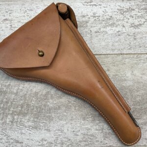 GERMAN NAVY LUGER TAN LEATHER HOLSTER, REPRODUCTION, W/ CLEANING ROD & LANYARD, HAS A FEW FAKE NAZI PROOFS ON BACK OF HOLSTER, LANYARD FOUND INSIDE HOLSTER ROLLED. OVERALL IN EXCELLENT CONDITION.