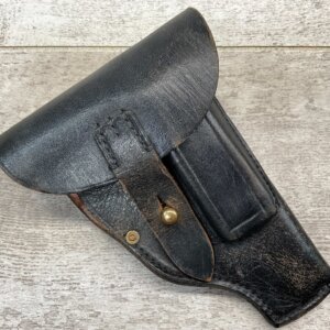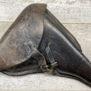 GERMAN P38 HARDSHELL “CWW 1943” MARKED BLACK LEATHER HOLSTER, LIFTING STRAP, EXC OVERALL