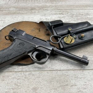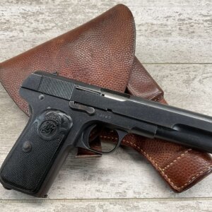 HUSQVARNA M1907 .380 POCKET HAMMERLESS PISTOL RIG , #14987, 1917-1940 MFR, .380 AUTO, 5″ BARREL, LEFT SIDE OF SLIDE MARKED “HUSQVARNA VAPENFABRIKS AKTIEBOLAG/SYSTEM BROWNINGâ€, LEFT SIDE OF FRAME MARKED “CAL 380” & UNIT MARK OF “K7No187”, RIGHT SIDE OF FRAME MARKED “14937”, REAR SIDE OF FRAME (TANG) MARKED “CROWN OVER TT HK.”, NO VISIBLE IMPORT MARKS, MILITARY LANYARD RING ON LEFT SIDE OF GRIP, EXC BAKELITE/PLASTIC GRIPS, EXC BORE W/EXC RIFLING, BROWN LEATHER HOLSTER, 1 MAG, SWEDISH ARSENAL REFINISHED, 95%+ OVERALL