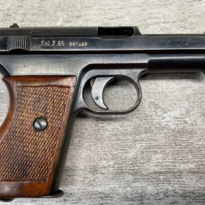 MAUSER MODEL 1934 NAZI MARKED 7.65 CAL PISTOL, ALL MATCHING #593862, VG ORIGINAL BLUE FINISH W/ LIGHT SPECKLING, EXC CHECKERED GRIPS, MAUSER BANNER MAGAZINE, EAGLE/N PROOF ON TOP OF SLIDE BEHIND REAR SIGHT, SERIAL MARKED NEAR LEFT SIDE OF BARREL “593862”, LEFT SLIDE MARKED “MAUSER-WERKE A.G. OBERNDORF A.N.” WITH MAUSER LOGO BELOW IT, WaA655 MARKED ON END OF LEFT SLIDE, RIGHT SLIDE MARKED “CAL 7.65 / D.R.P.u.A.P.”, “862” MARKED NEAR TRIGGER & ON BACK OF SLIDE ABOVE GRIP, REALLY NICE OVERALL