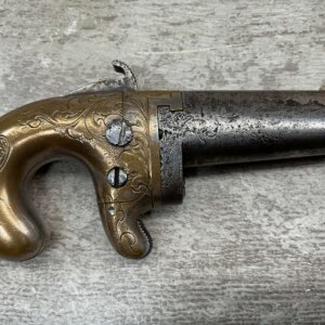 ORIGINAL CIVIL WAR ERA MOORE’S PATENT F.A. CO. NO.1 DERRINGER .41RF SINGLE SHOT PISTOL, ANTIQUE #1040, ALL MATCHING, GOOD NICKEL FINISH BARREL W/ PITTED AREAS, FAIR BORE W/ FROSTING & GOOD RIFLING, BRASS FRAME W/ ENGRAVING, SPUR TRIGGER, MOORE’S PATENT F.A. CO. BROOKLYN, N.Y. FAINTLY ON TOP OF BARREL, 2 1/2″ ROTATING BARREL, FULLY FUNCTIONING, NOT A REPRODUCTION, OVERALL CONDITION AS SEEN IN PHOTOS