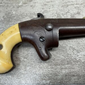 NATIONAL ARMS CO. NO 2 .41RF DERRINGER SINGLE SHOT PISTOL W/ IVORY GRIPS, ANTIQUE #10177, MATCHING, 2 1/2″ BARREL, POOR BORE W/ HEAVY FROSTING & FAIR RIFLING, METAL HAS ALL TURNED A VERY DARK BROWN PATINA, ORIGINAL IVORY GRIPS W/ SMALL CRACK ON LEFT GRIP & SMALL PIECE MISSING ON RIGHT GRIP, ACTION WORKS PERFECTLY, NOT A REPRODUCTION, OVERALL CONDITION AS SEEN IN PHOTOS.