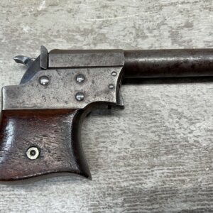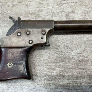 REMINGTON VEST POCKET SAW HANDLE .41RF SINGLE SHOT DERRINGER, ANTIQUE #4742, 4″ BBL OCTAGON TO ROUND BARREL, VG ORIGINAL BLUE FINISH W/ AREA THINNING & TURNING PATINA, VG ORIGINAL SMOOTH WALNUT GRIPS, FAIR BORE W/ LIGHT FROSTING & GOOD RIFLING, FULLY FUNCTIONING SPLIT BREECH ACTION, NOT A REPRODUCTION, OVERALL CONDITION AS SEEN IN PHOTOS