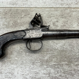 QUEEN ANNE FLINTLOCK PISTOL W/ CANNON BARREL & SILVER WIRE INLAY, #NSN, 3 1/2″ CANNON BARREL, .44 CAL, WORN FINISH W/ GREY PATINA, SILVER INLAY IN GRIPS W/ SOME LOSS, ENGRAVED RECEIVER W/ MAKER MARKS ON EACH SIDE (NOT LEGIBLE), NOT A REPRODUCTION, OVERALL CONDITION AS SEEN IN PHOTOS!!