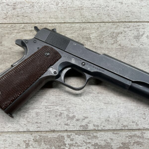 REMINGTON RAND M1911A1 .45CAL PISTOL, #919991, 1942 MFR, 1ST VARIATION, ALL MATCHING EXCEPT THE BARREL (WWII REPLACEMENT BARREL, PX-4/SP), PARKERIZED (DU-LITE) FINISH SHOWING LIGHT USE (SLIGHT TOUGH-UP POSSIBLE?), “UNITED STATES PROPERTY M1911A1 U.S. ARMY OVER SERIAL #” ON RIGHT SIDE OF FRAME, FAINT CROSS CANNONS BEHIND RIGHT GRIP, “FJA (FRANK J ATTWOOD)” ABOVE MAG RELEASE AND “P” BELOW, LEFT SIDE OF SLIDE “REMINGTON RAND INC.” OVER “SYRACUSE, NEW YORK”, EXC CHECKERED GRIPS, EXC BRIGHT BORE, ALL CORRECT SMALL PARTS, 95+% ONLY A HANDFUL OF REM RANDS PRODUCED IN 1942, THIS IS A REAL FIND AND GREAT ADDITION FOR ANY SERIOUS 1911 COLLECTOR!!