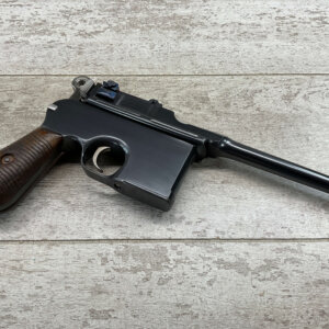 CHINESE TAKU NAVAL DOCKYARD C96 LARGE RING FLATSIDE PISTOL RIG, MATCHING #2105, 5.5″ BARREL, 98%+ BLUE, VG WOODEN GRIPS (UNMARKED) W/19 GROOVES, 50-1000 GRADUATED REAR SIGHT W/FIXED FRONT SIGHT, CHAMBER MARKED “TAKU NAVAL/DOCKYARD”, NO WAVES IN FINISH & HAS BEEN PROFESSIONALLY RESTORED, DARKER BORE W/ LIGHT FROSTING, 7.63mm, MAUSER BANNER MARKED WOODEN STOCK IN EXC CONDITION & FITS THE FIREARM PERFECTLY, LEATHER ALSO EXCELLENT, ORIGINAL CLEANING ROD INCLUDED, LANYARD RING, NOT SURE YOU’LL FIND ANOTHER IN THIS CONDITION!! GREAT INVESTMENT PIECE