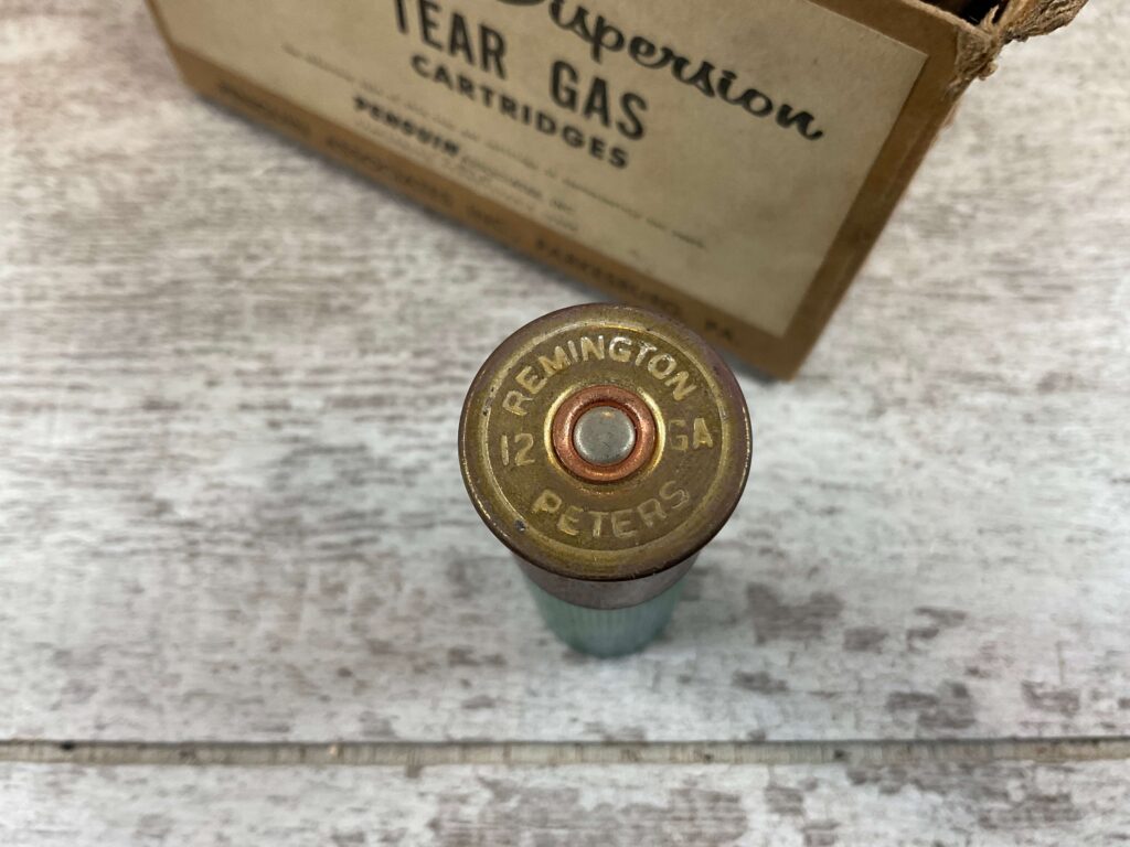 12 GAUGE REMINGTON MUZZLE DISPERSION SHORT RANGE TEAR GAS, HEADSTAMP REMINGTON NO. 12 PETERS 5 ROUNDS/BOX