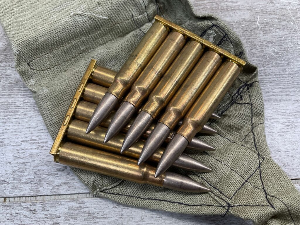 8MM MAUSER TURKISH SURPLUS 70RD BANDOLIER ON CLIPS, EXC CONDITION, 70RD BRASS 8MM AMMO ON 5RD STRIPPER CLIPS, 14 STRIPPER CLIPS, 70ROUNDS TOTAL, GREAT FOR DISPLAY OR SHOOTING, CORROSIVE AMMO