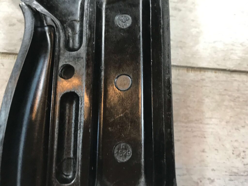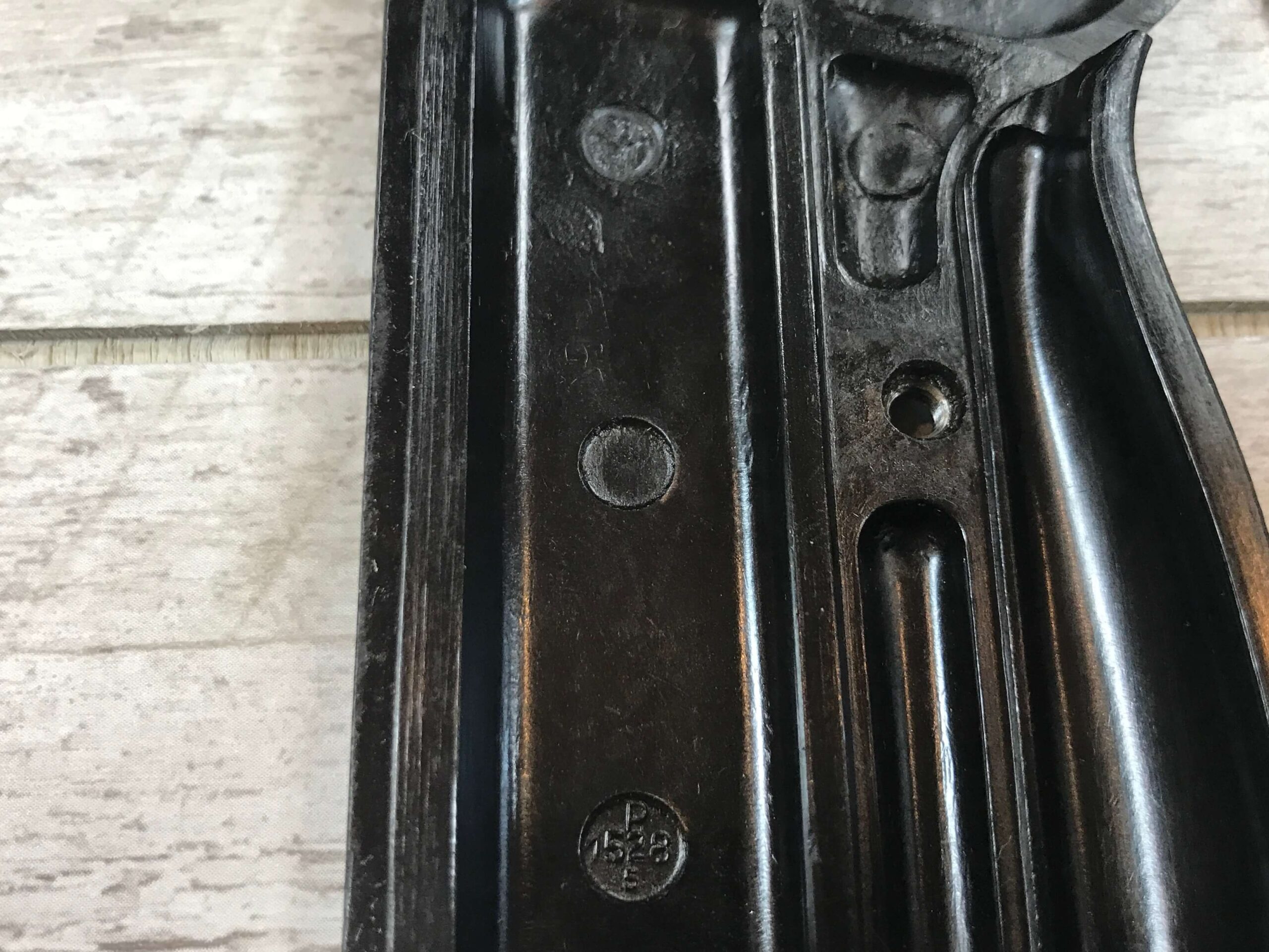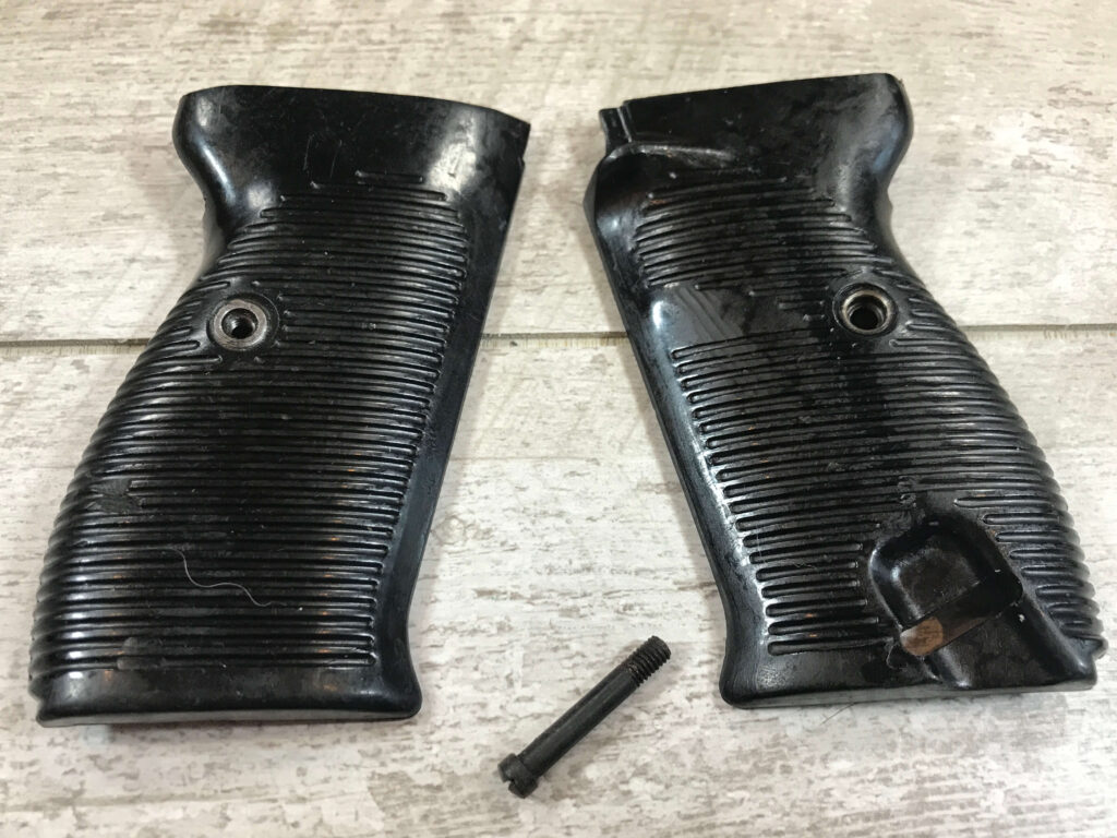 SKU#7901 AEG BLACK P38 GRIPS, BAKELIT, 38 OVER MPD OVER Z3 TOP CIRCLE, P OVER 1529 OVER 5 ON LEFT GRIP P OVER 1528 OVER 5 ON THE RIGH BOTTOM CIRCLE. EXC CONDITION