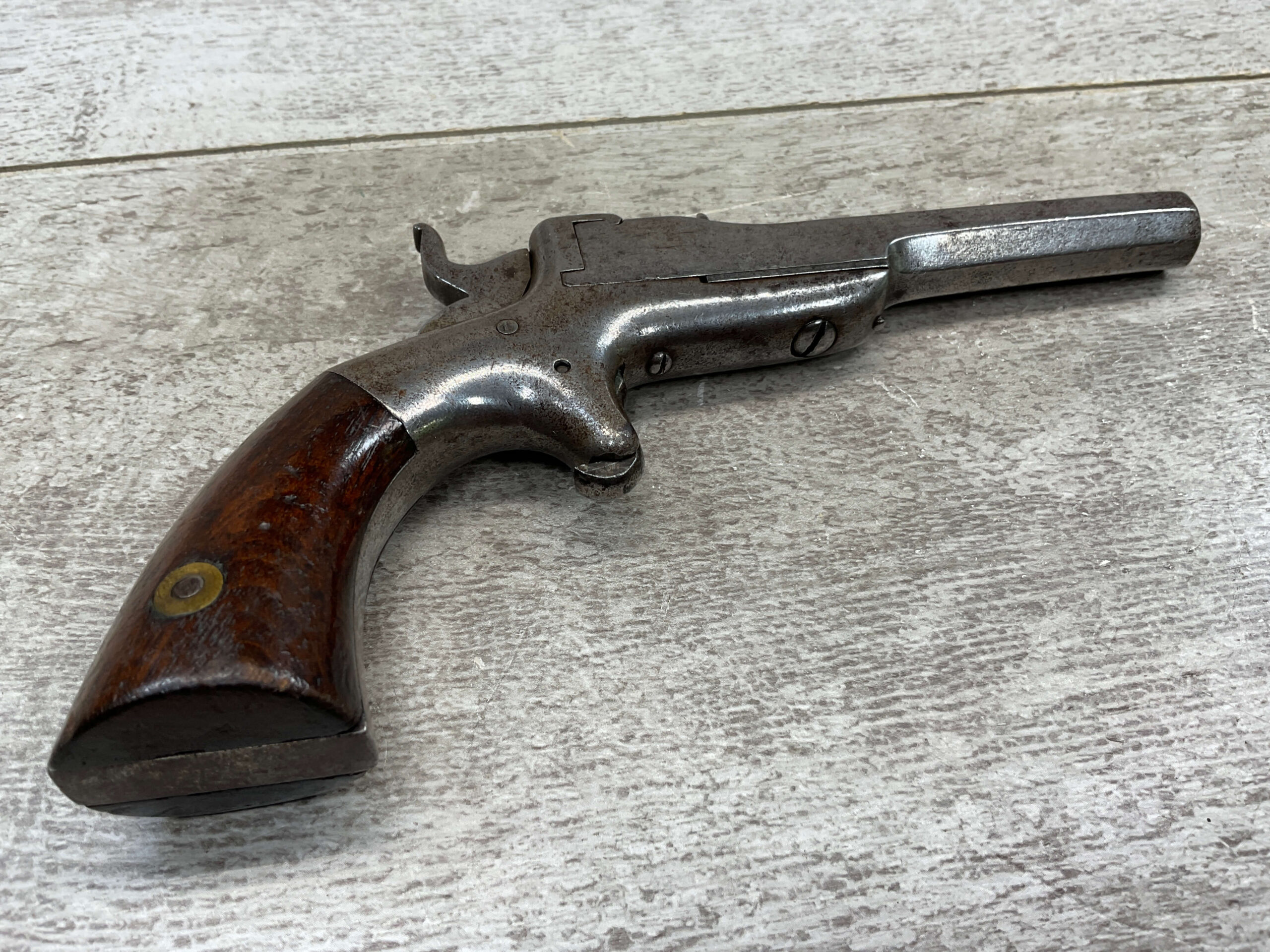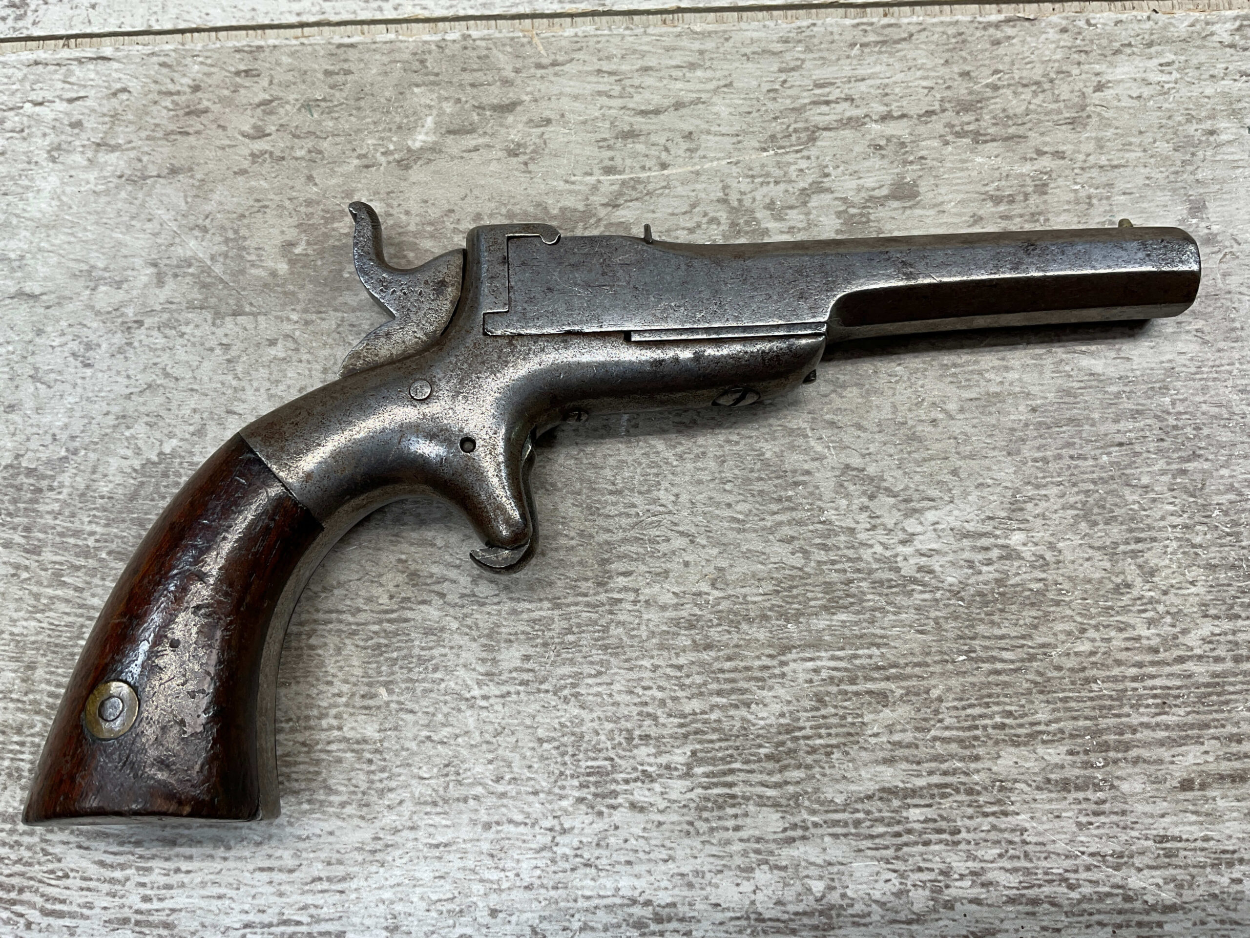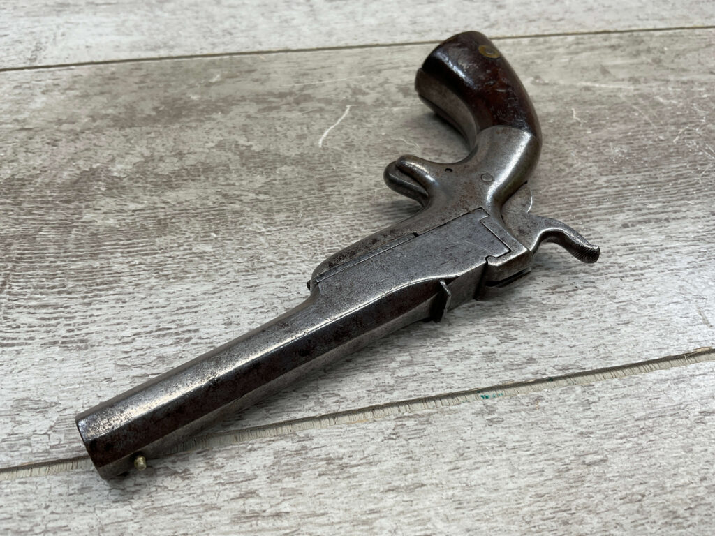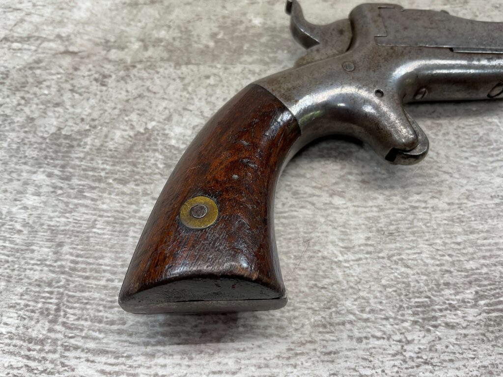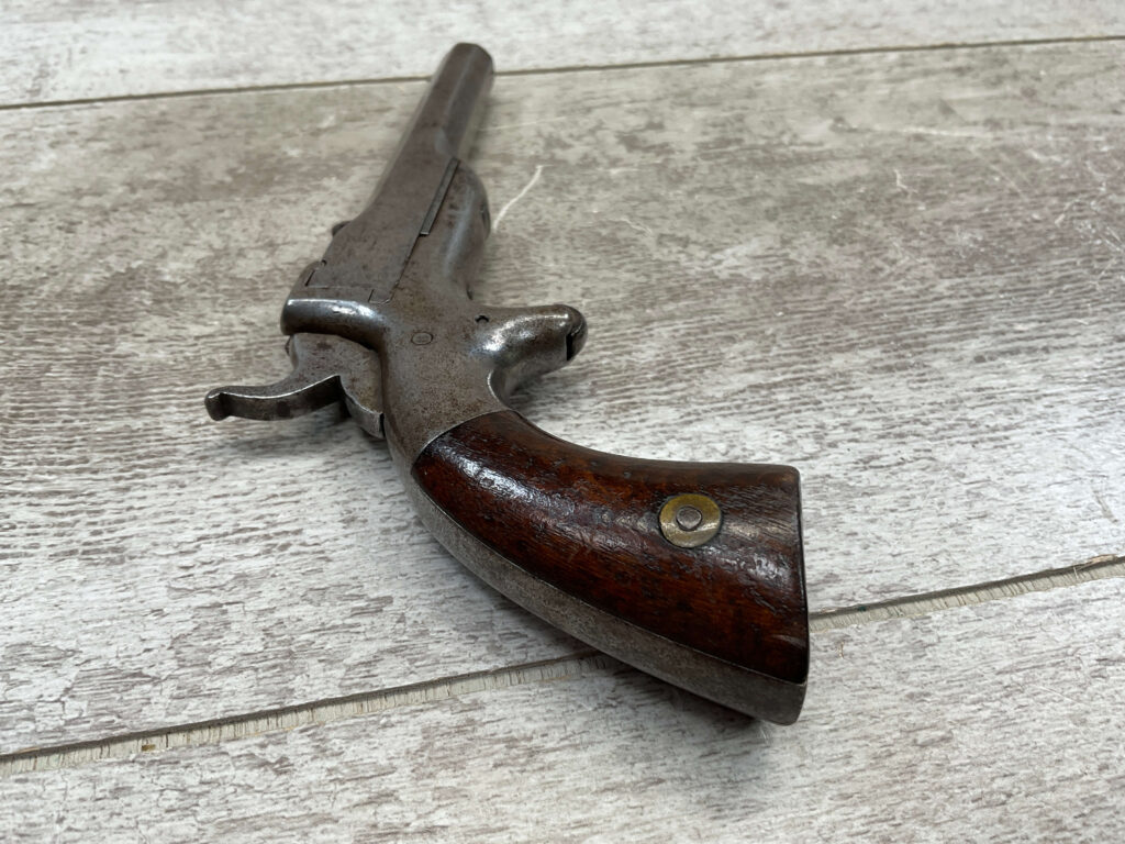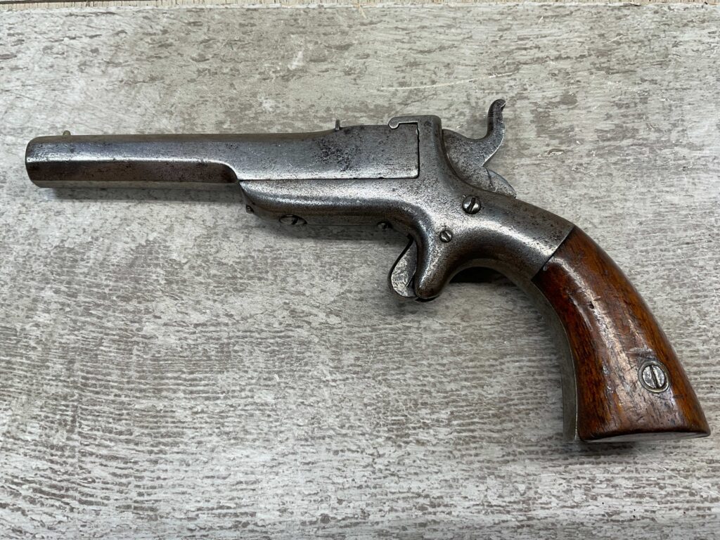 ALLEN & WHEELOCK SIDE-SWING .32RF SINGLE SHOT PISTOL, ANTIQUE #100 .32 RIMFIRE, POOR HEAVILY FROSTED 4″ OCTAGON BARREL, SIDE SWING, FINISH TURNED GREY PATINA, ORIGINAL SMOOTH WALNUT GRIPS W/ SERIAL STAMPED, CURRENTLY NON-FUNCTIONING, NOT A REPRODUCTION, OVERALL CONDITION AS SEEN IN PHOTOS.