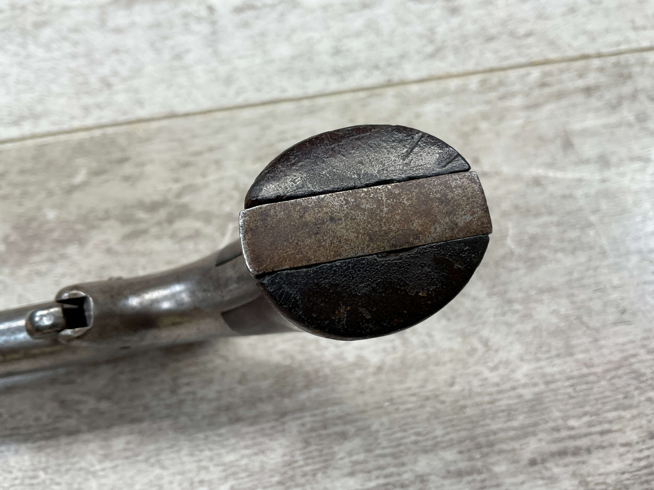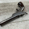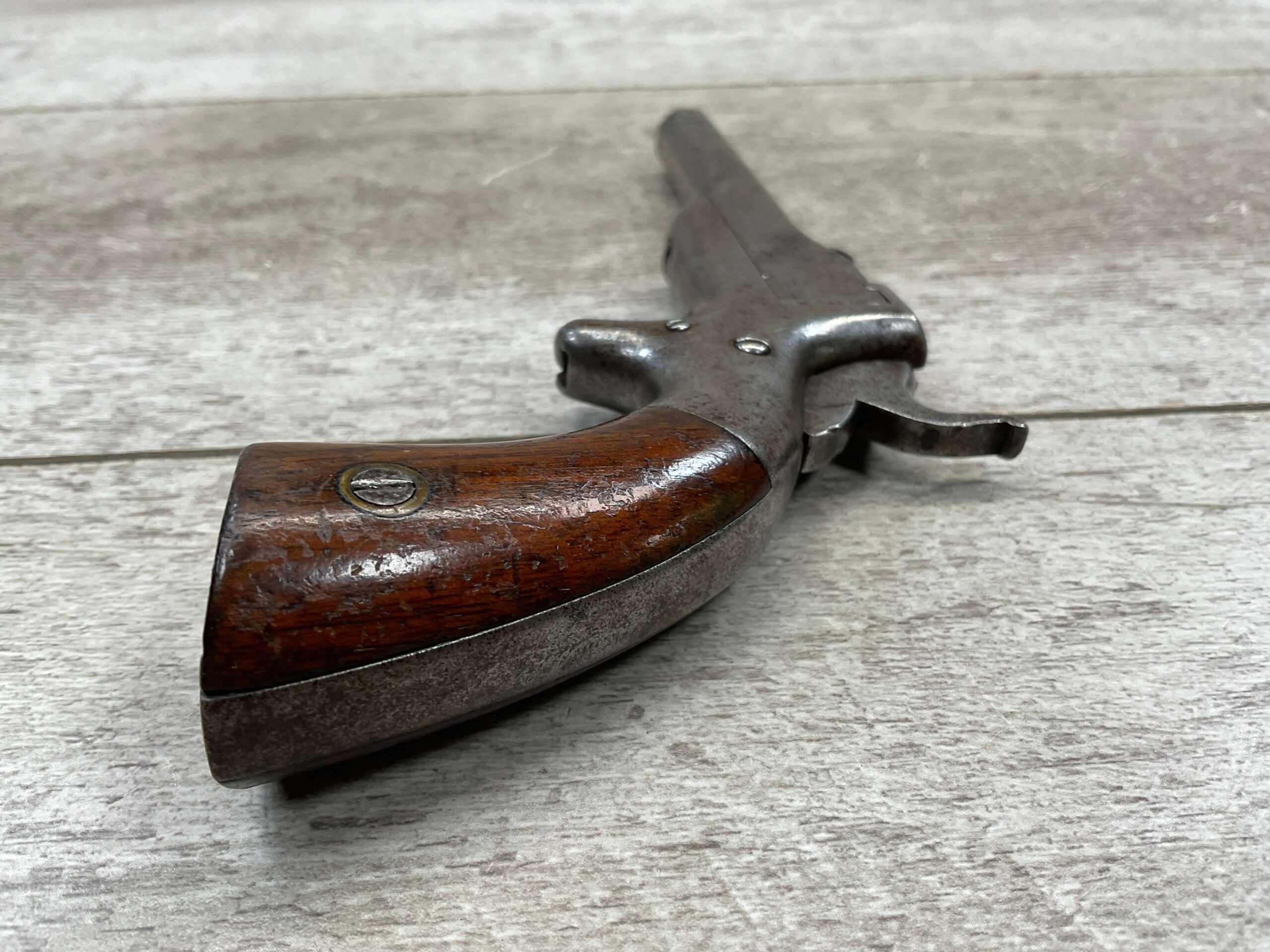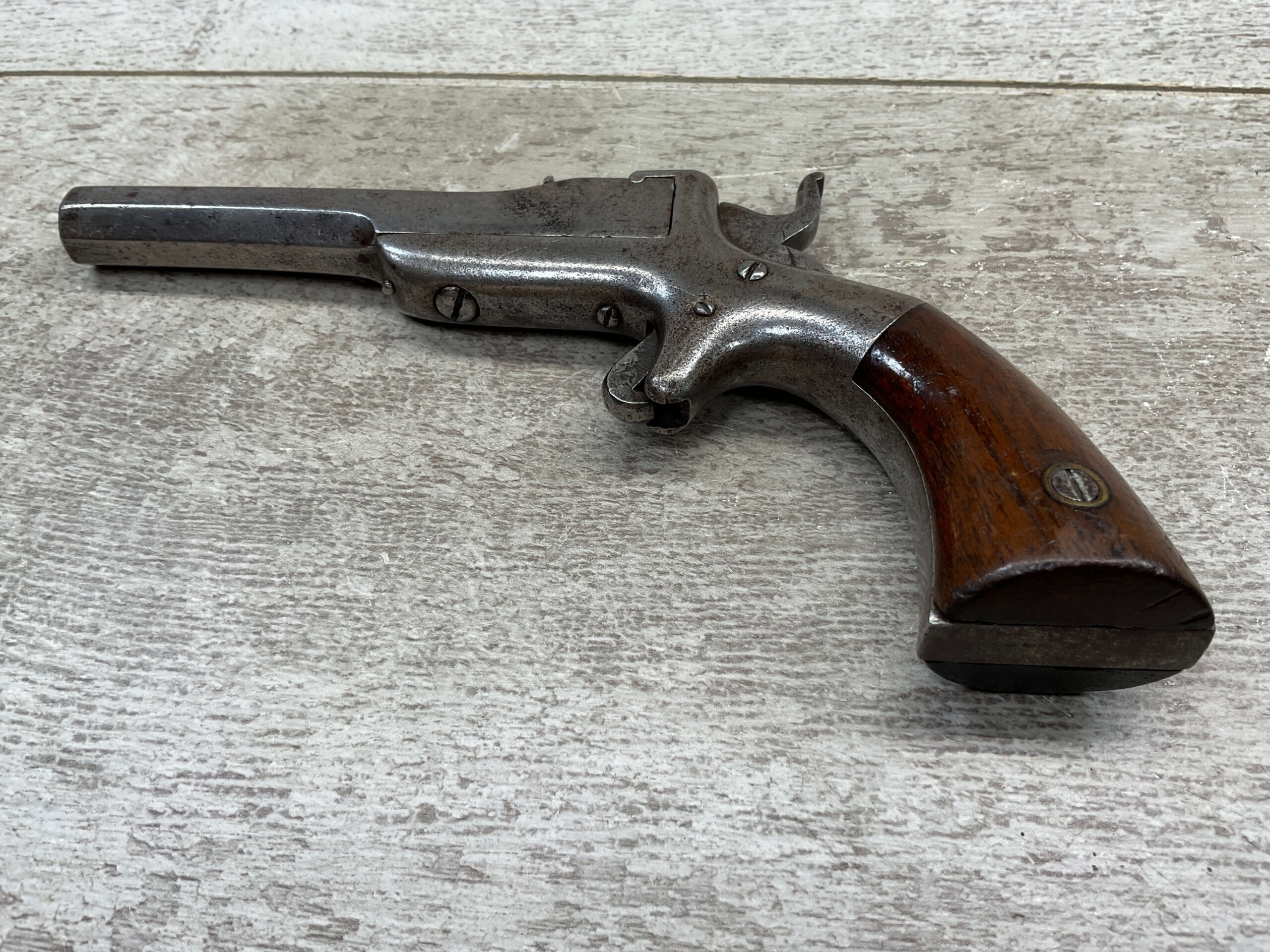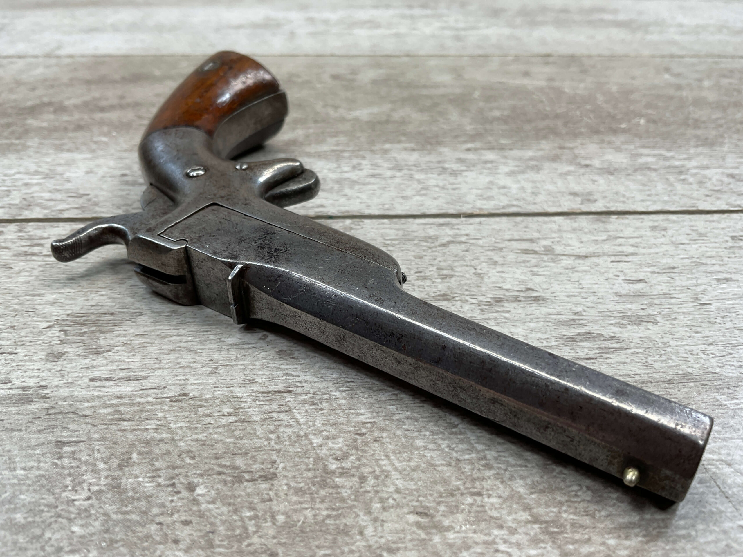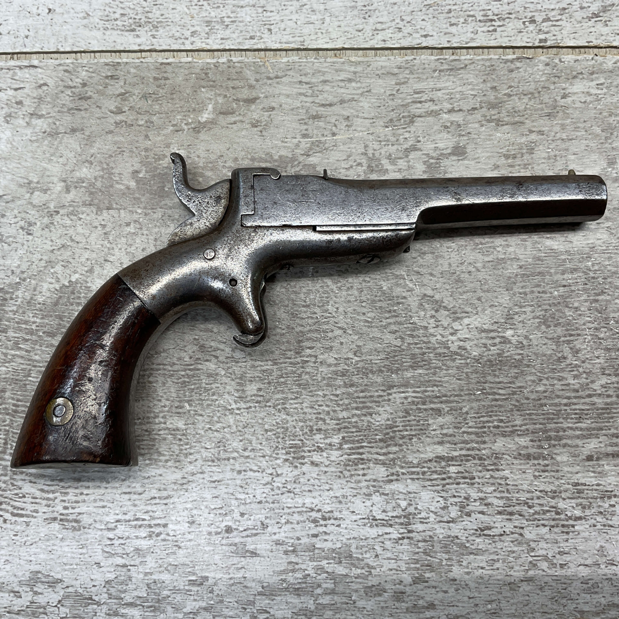 ALLEN & WHEELOCK SIDE-SWING .32RF SINGLE SHOT PISTOL, ANTIQUE #100 .32 RIMFIRE, POOR HEAVILY FROSTED 4″ OCTAGON BARREL, SIDE SWING, FINISH TURNED GREY PATINA, ORIGINAL SMOOTH WALNUT GRIPS W/ SERIAL STAMPED, CURRENTLY NON-FUNCTIONING, NOT A REPRODUCTION, OVERALL CONDITION AS SEEN IN PHOTOS.