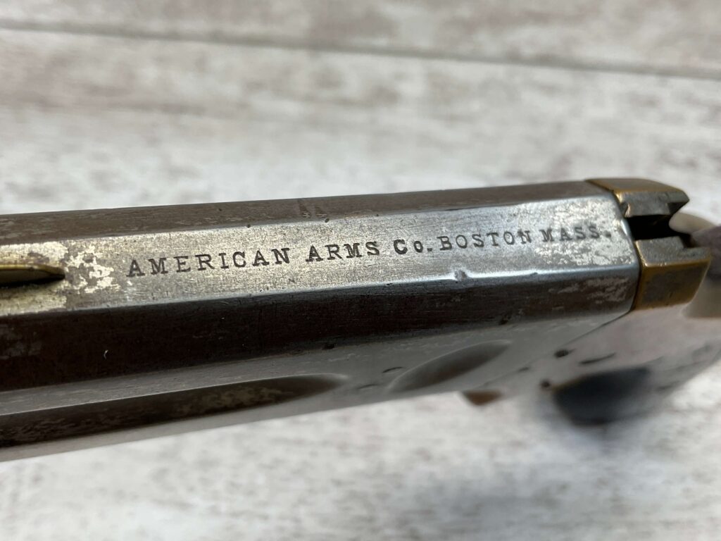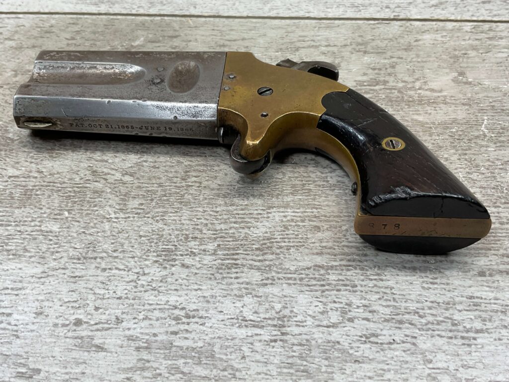 AMERICAN ARMS CO. .41RF DOUBLE BARREL O/U PIVOT DERRINGER, ANTIQUE #878, 2 5/8″ BARREL W/ FINISH TURNED GREY PATINA & LIGHT PITTING IN AREAS & VG BORE & RIFLING W/ ONLY LIGHT FROSTING IN A COUPLE OF AREAS, VG BRASS FRAME W/ NICKS & DINGS FROM AGE/USE, VG SMOOTH GRIPS W/ LIGHT DINGS/DENTS, BLADE FRONT SIGHTS W/ “AMERICAN ARMS CO. BOSTON, MASS” ON ONE TOP FLAT AND “PAT. OCT 31, 1865-JUNE 19, 1866” ON OTHER TOP FLAT, CHECKERED HAMMER & SPUR TRIGGER, MECHANICALLY VERY GOOD, NOT A REPRODUCTION, OVERALL CONDITION AS SEEN IN PHOTOS, VERY NICE & VERY RARE!!
