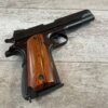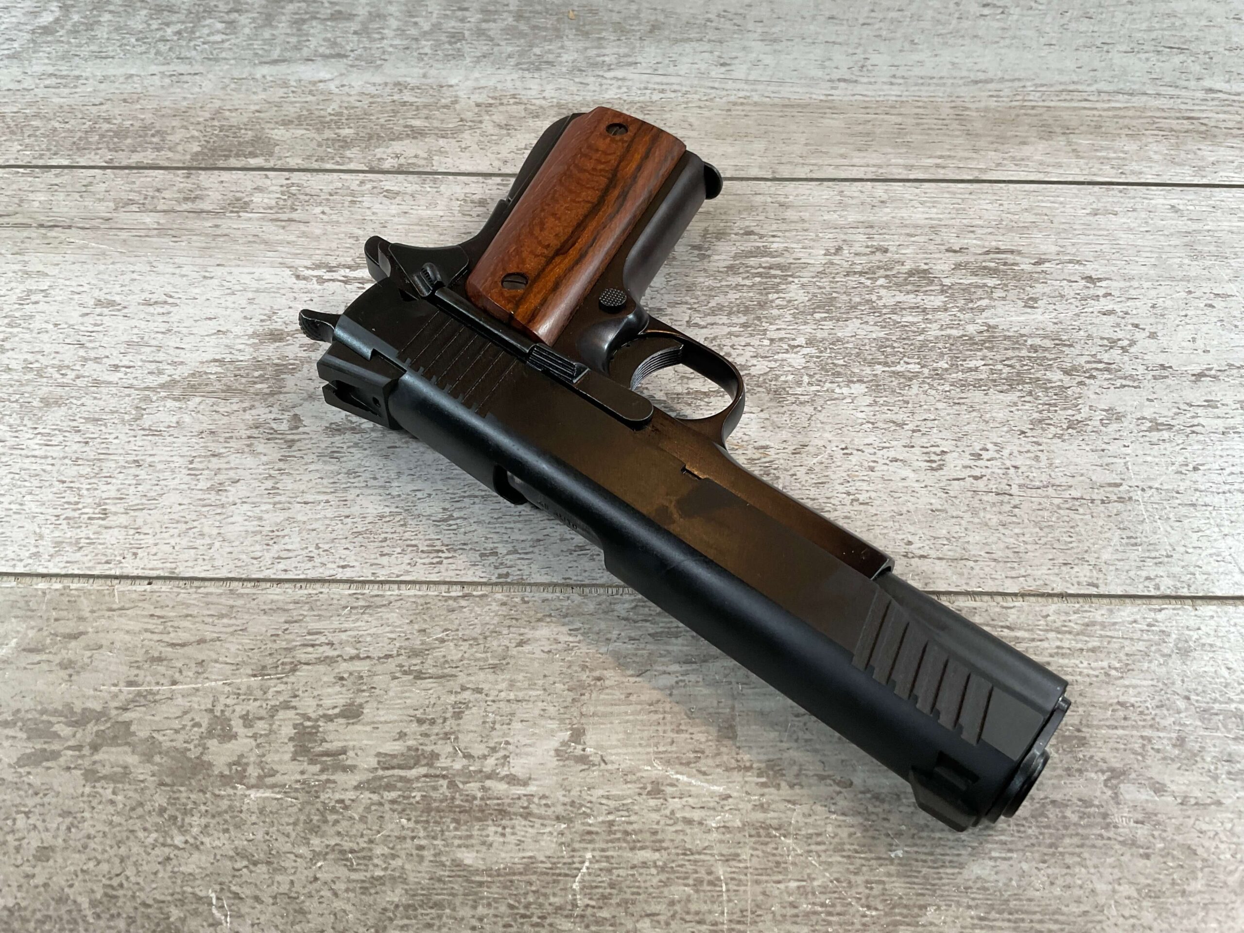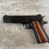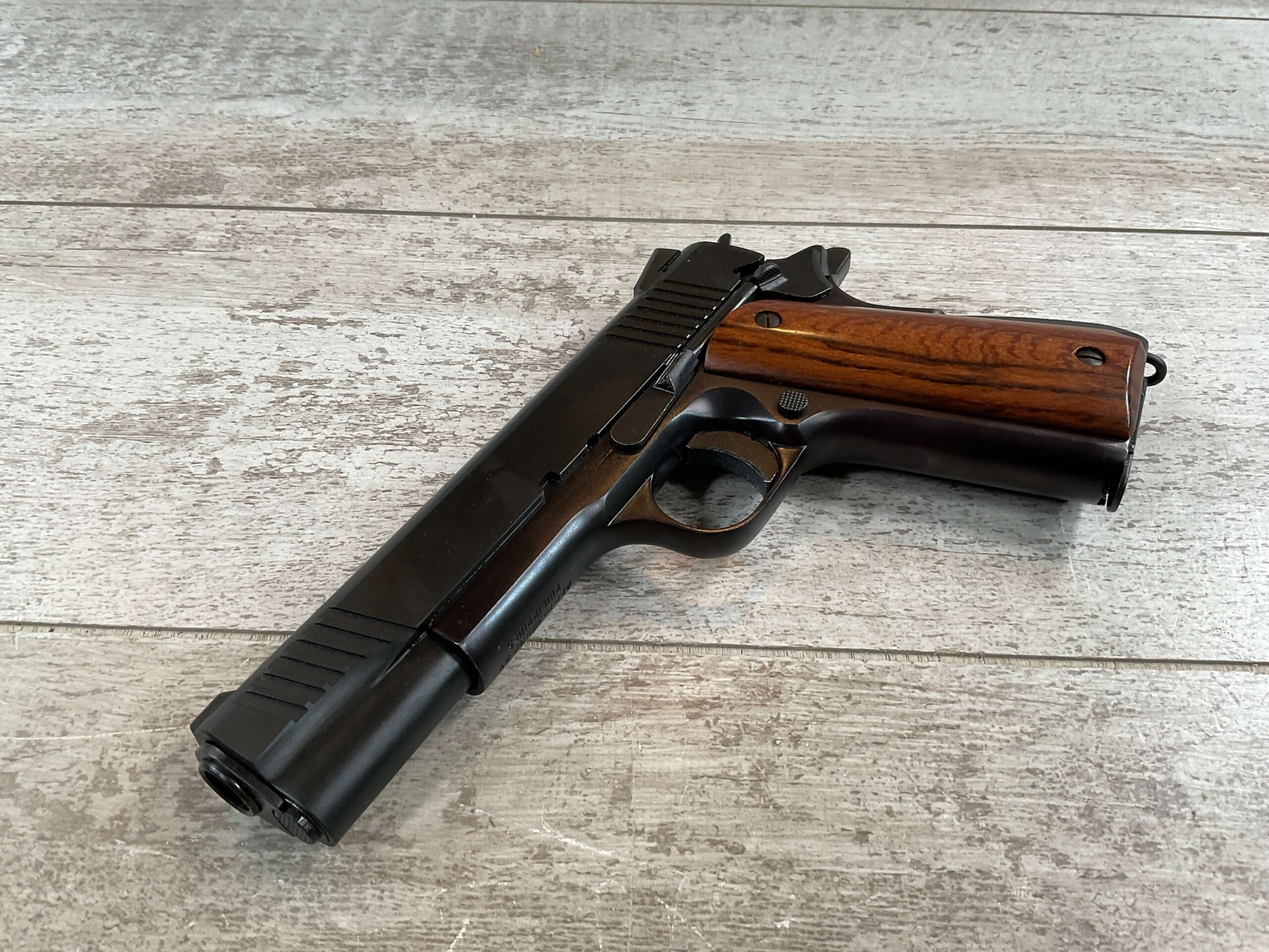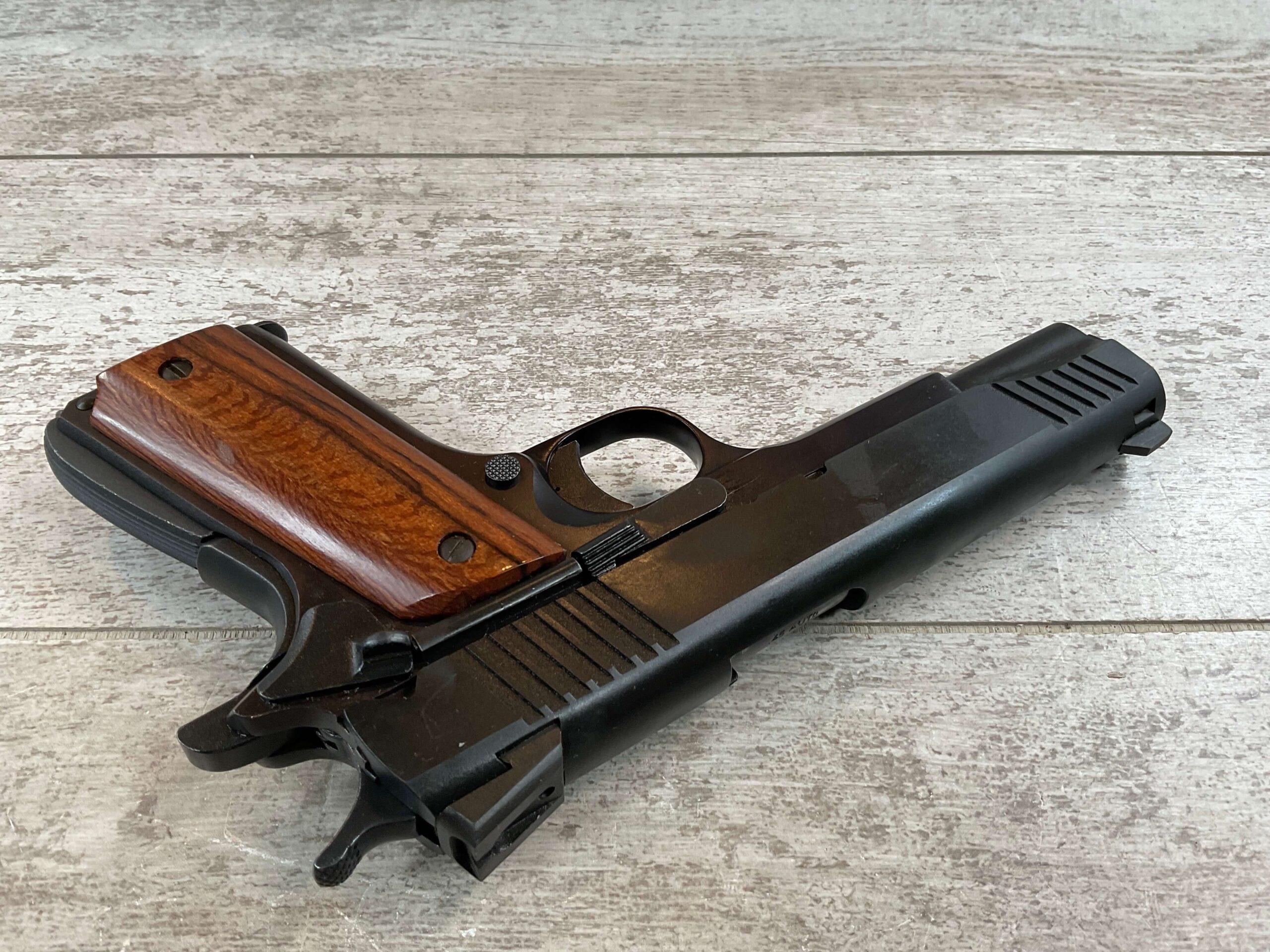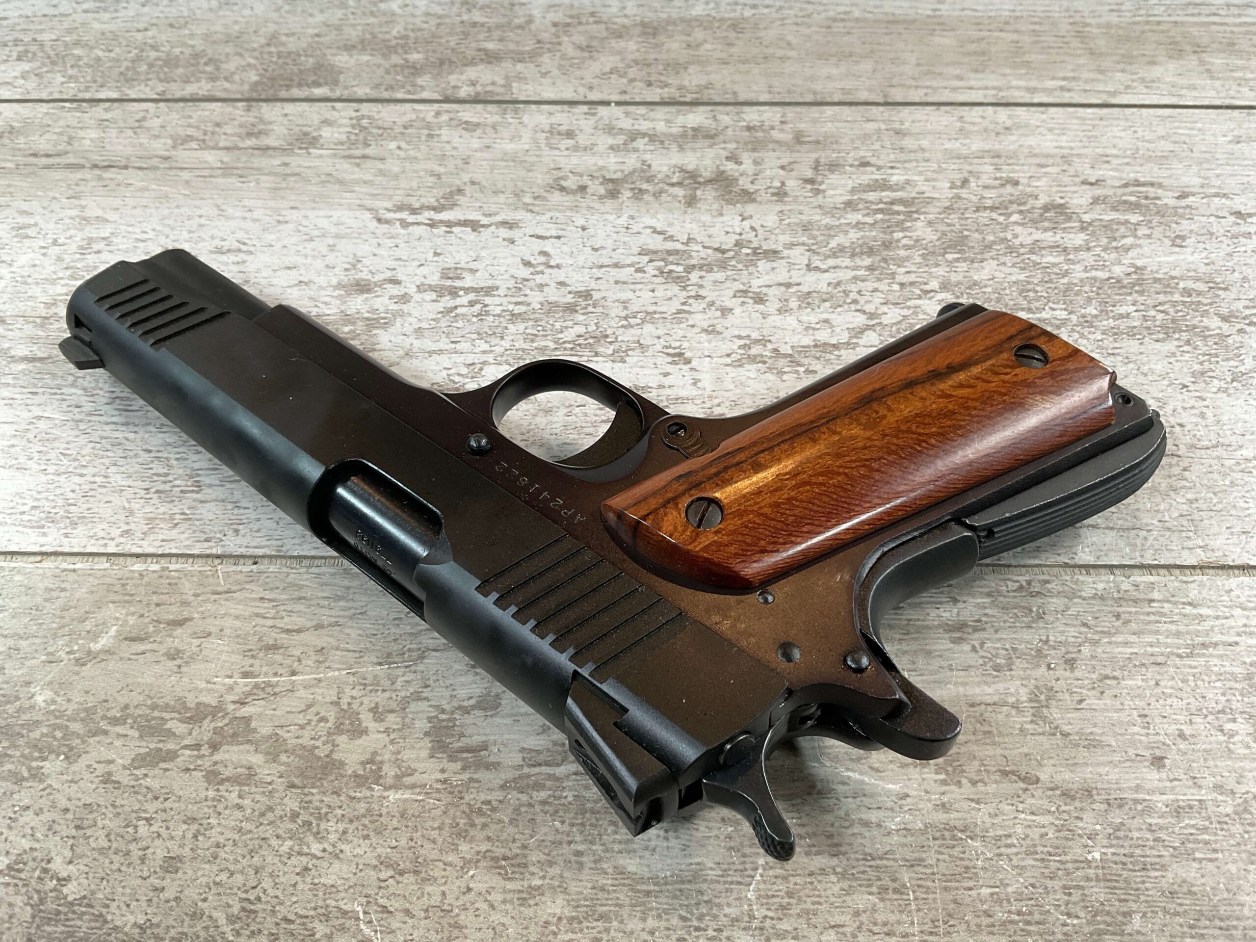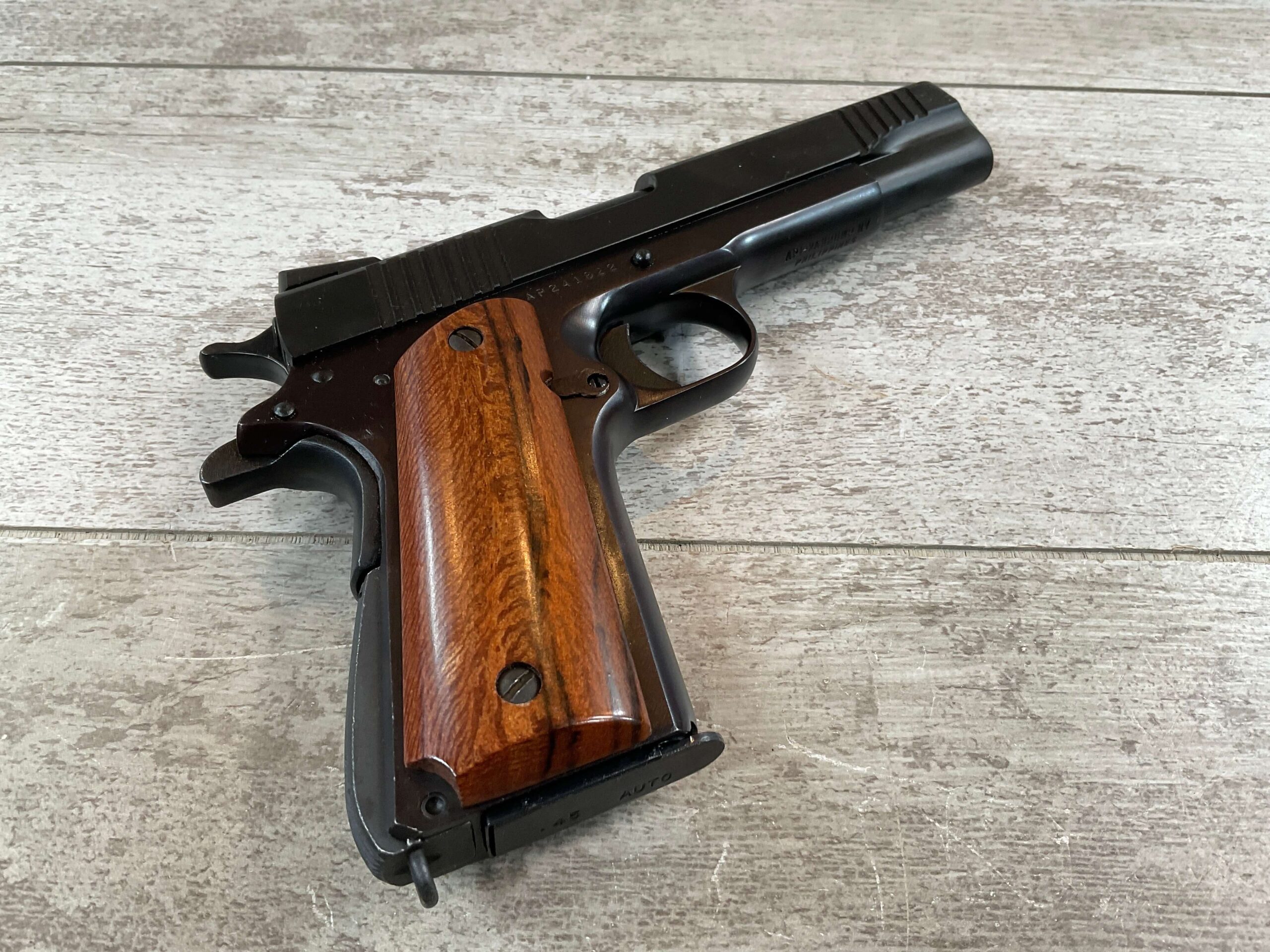 ARMSCOR ROCK ISLAND ARMORY M1911-A1 45 ACP SEMI-AUTO PISTOL, #AP241822, PATTERNED AFTER COLT GOVT. MODEL, 5″ BBL, TWO-TONE PARKERIZED SLIDE FINISH AND BLUE FINISHED FRAME IN EXC CONDITION, EXC SMOOTH WOOD GRIPS, SLIDE, TRIGGER, AND HAMMER HAVE TIGHT ACTION AND FUNCTION AS THEY SHOULD, BRIGHT SHINY BORE & EXC RIFLING SHOW THIS GUN WAS NOT SHOT VERY MUCH, LIGHT SLIDE WEAR ON THE TOP OF THE MAGAZINE, EXCELLENT & LIKE NEW OVERALL