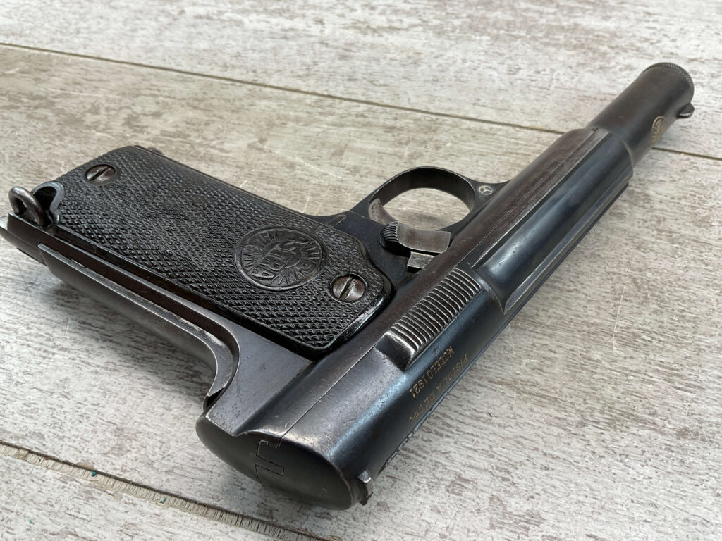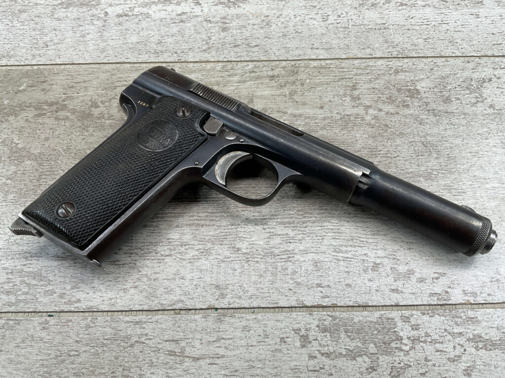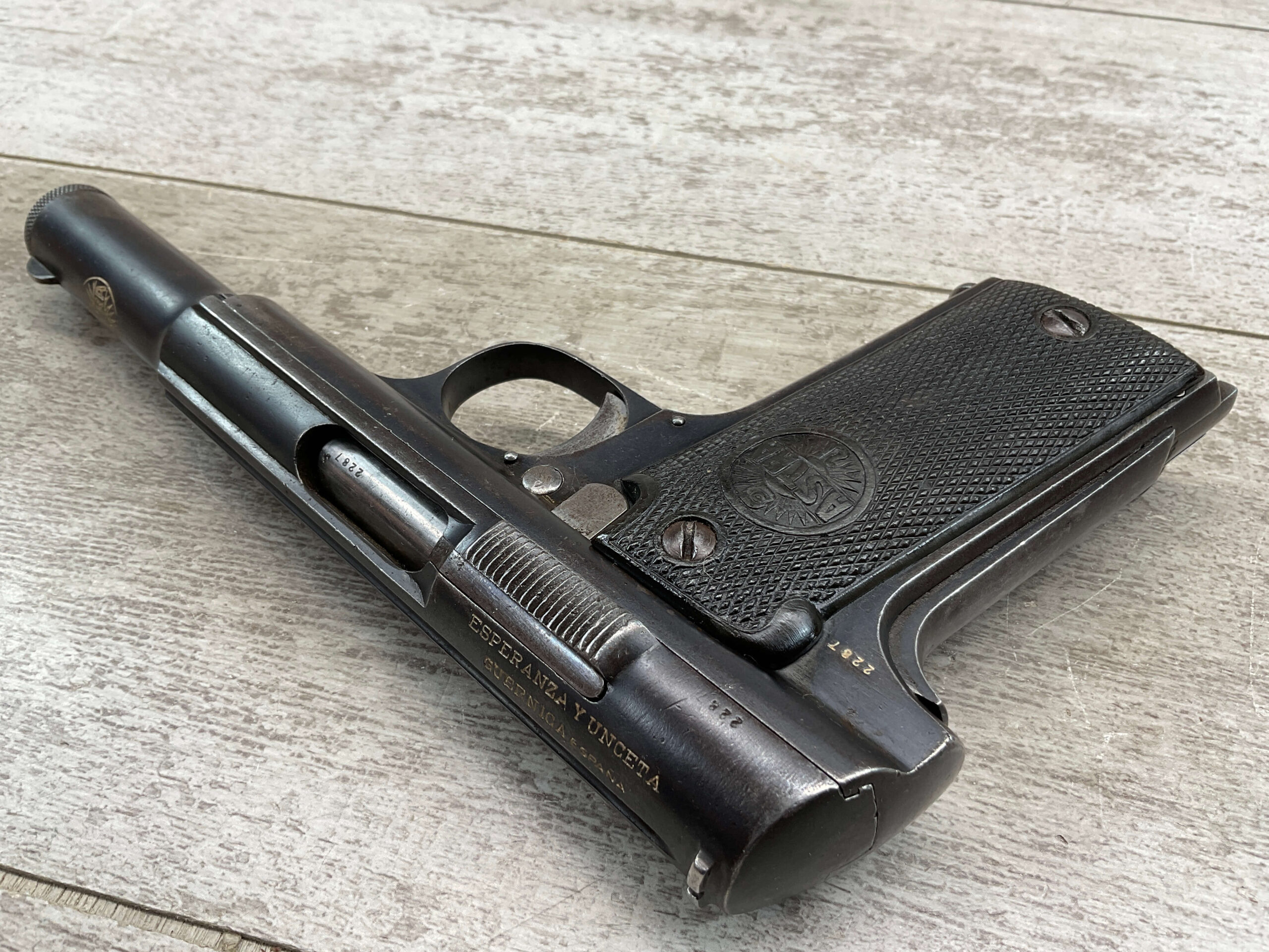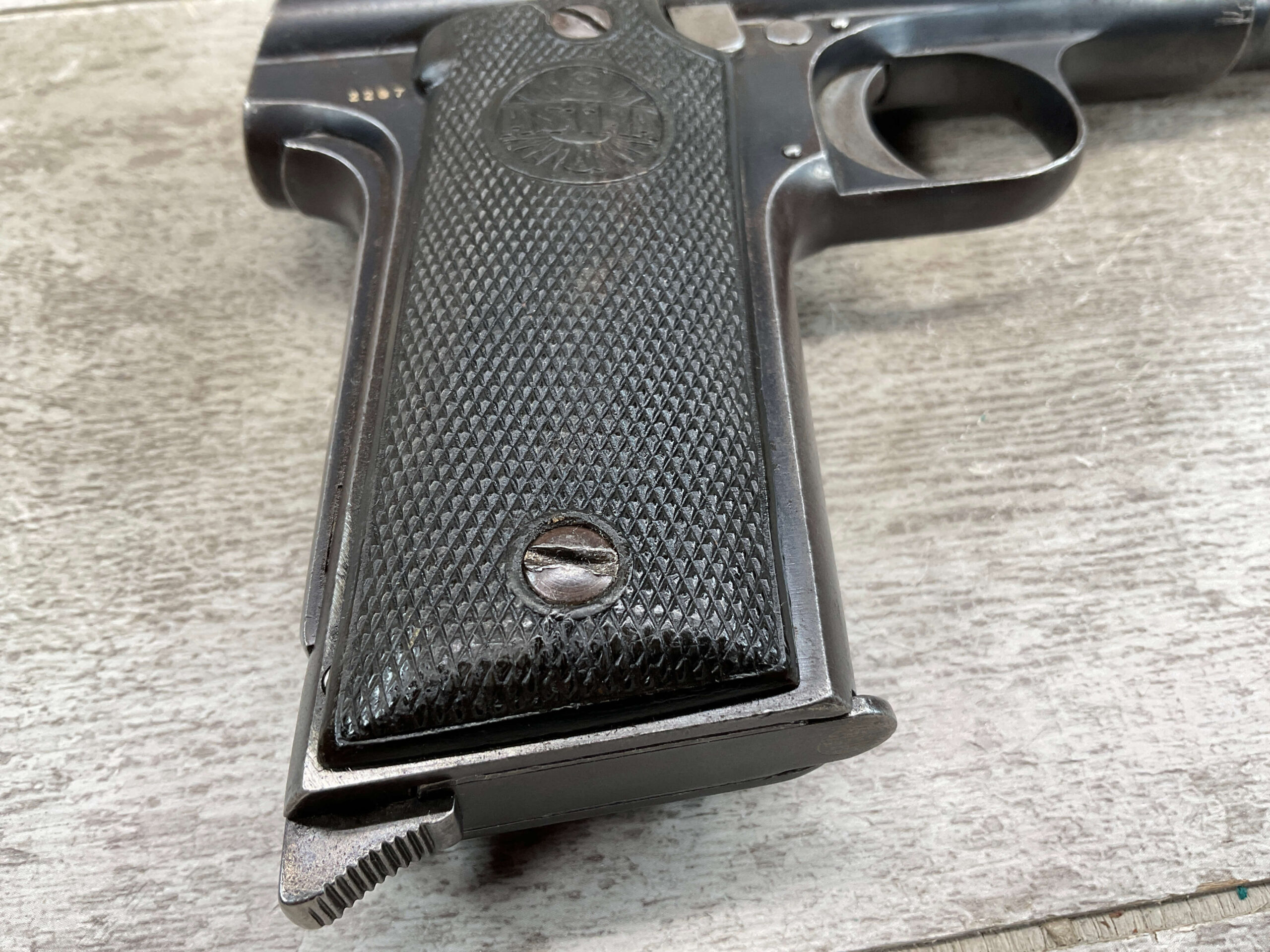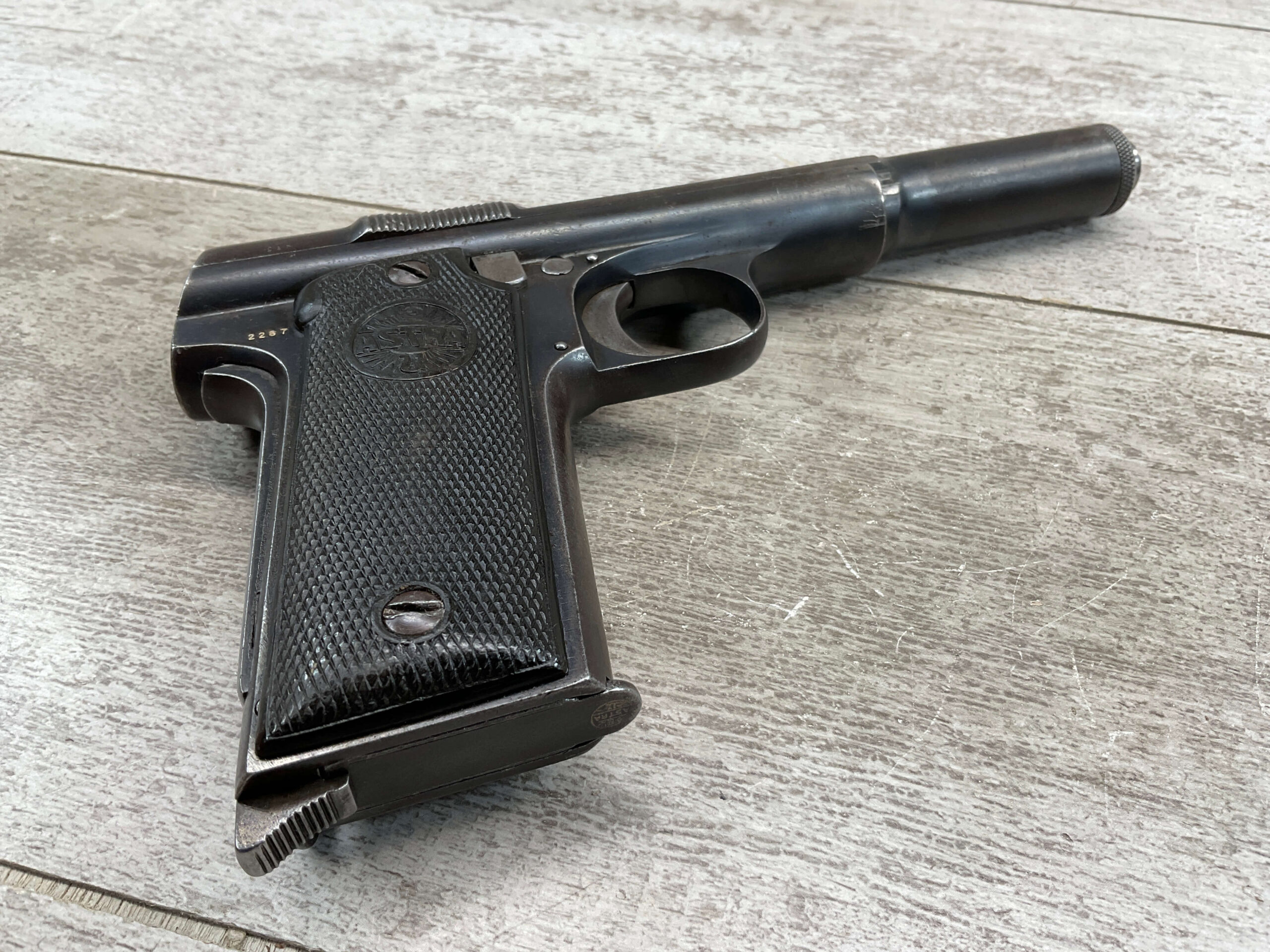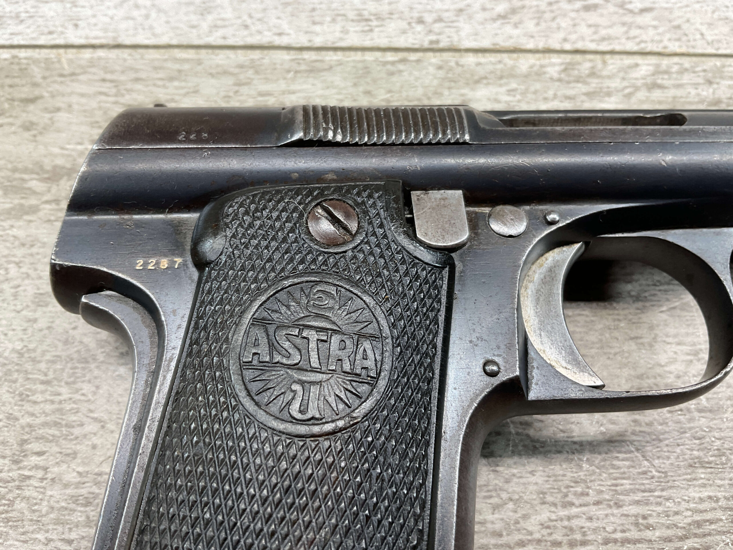 ASTRA MODELO 1921 (400) SEMI-AUTO PISTOL #2287, 9MM LARGO/9×23, GOOD SOLID DIAMOND CHECKERED WOODEN GRIPS, LIGHT HIGH EDGE WEAR W/ AREAS TURNING GREY PATINA, FAIR BORE W/OK RIFLING & FROSTING IN THE GROOVES, ALL MATCHING, ORIGINAL FACTORY MAGAZINE, OVERALL 85%+