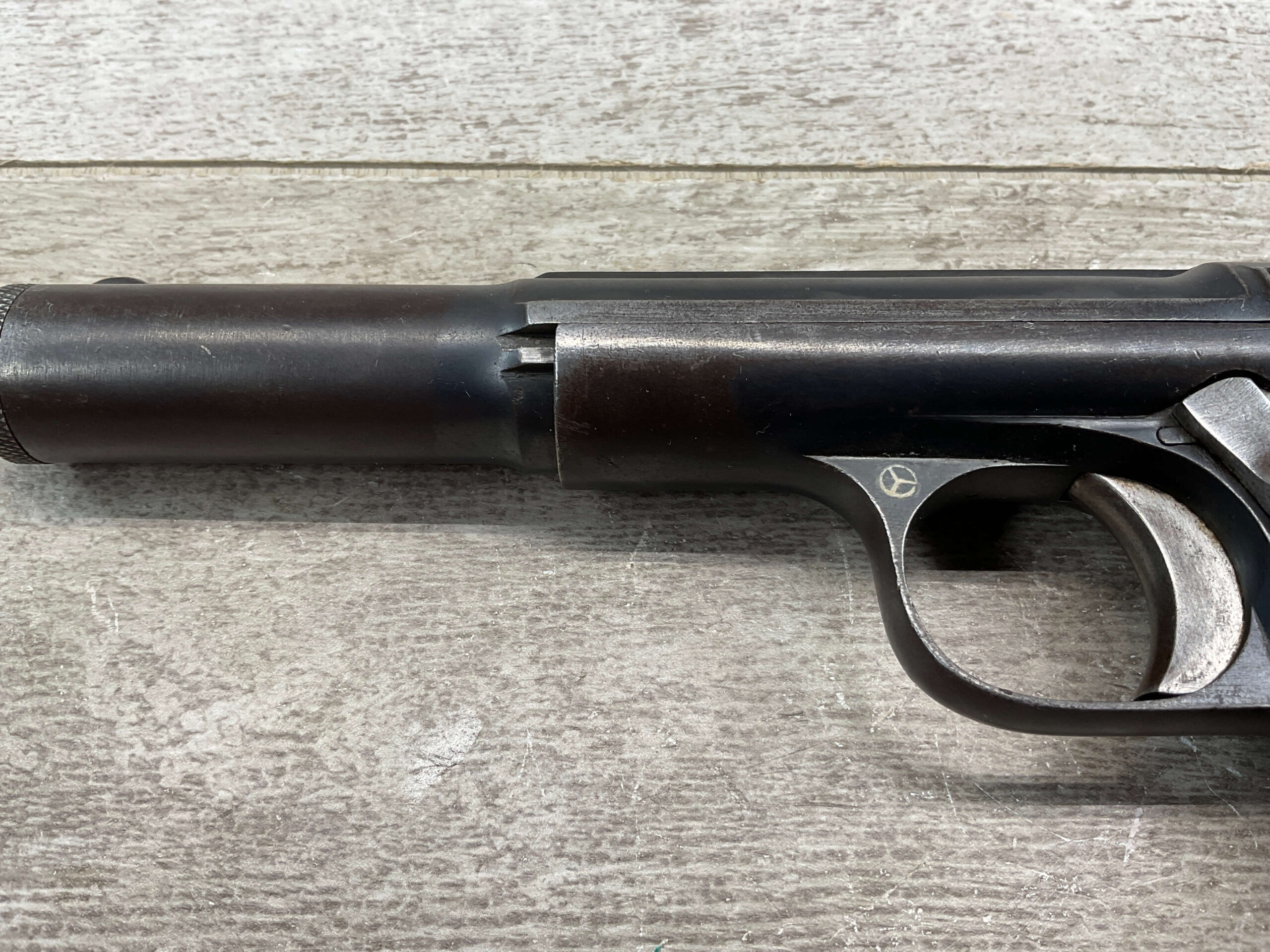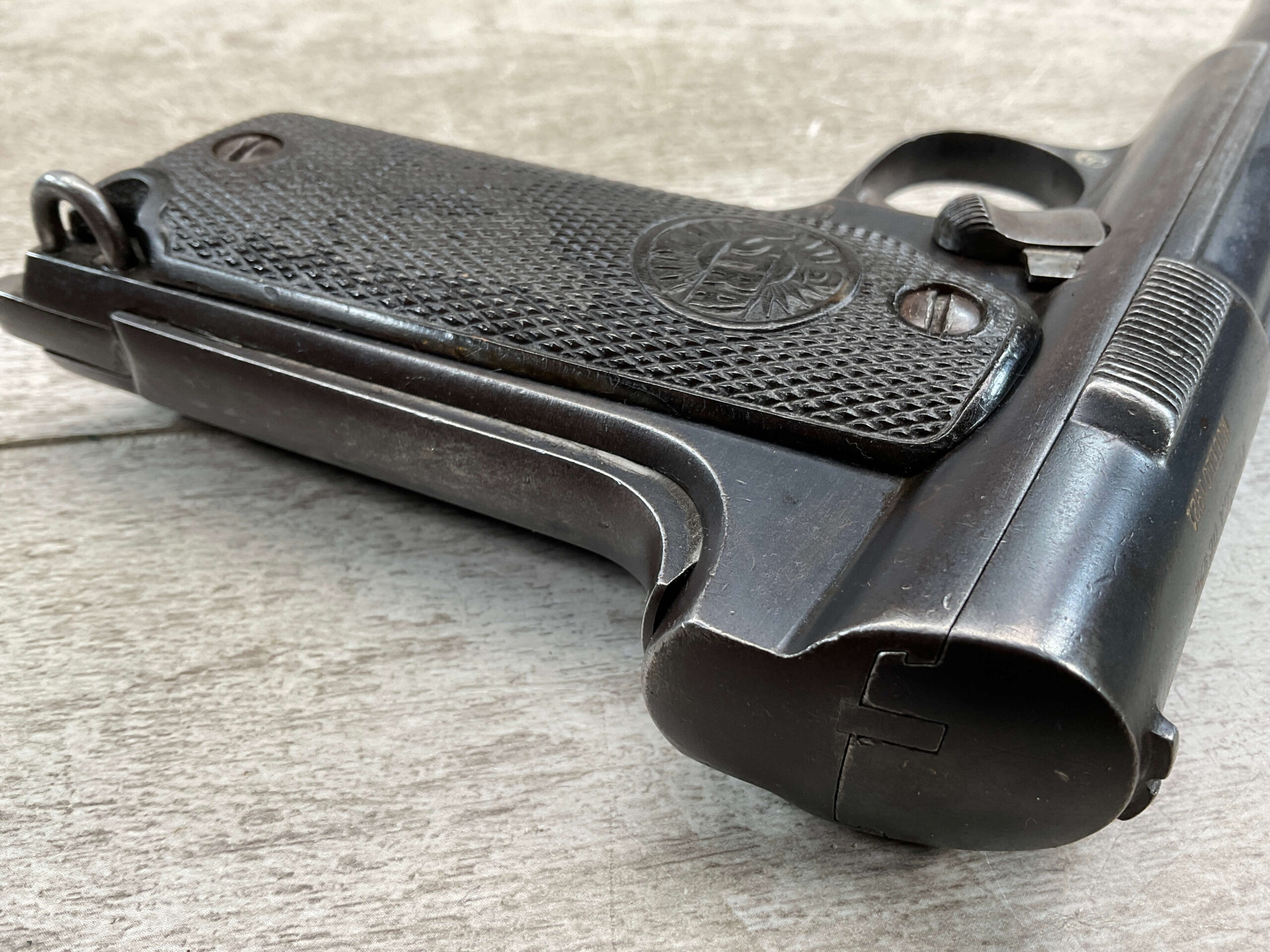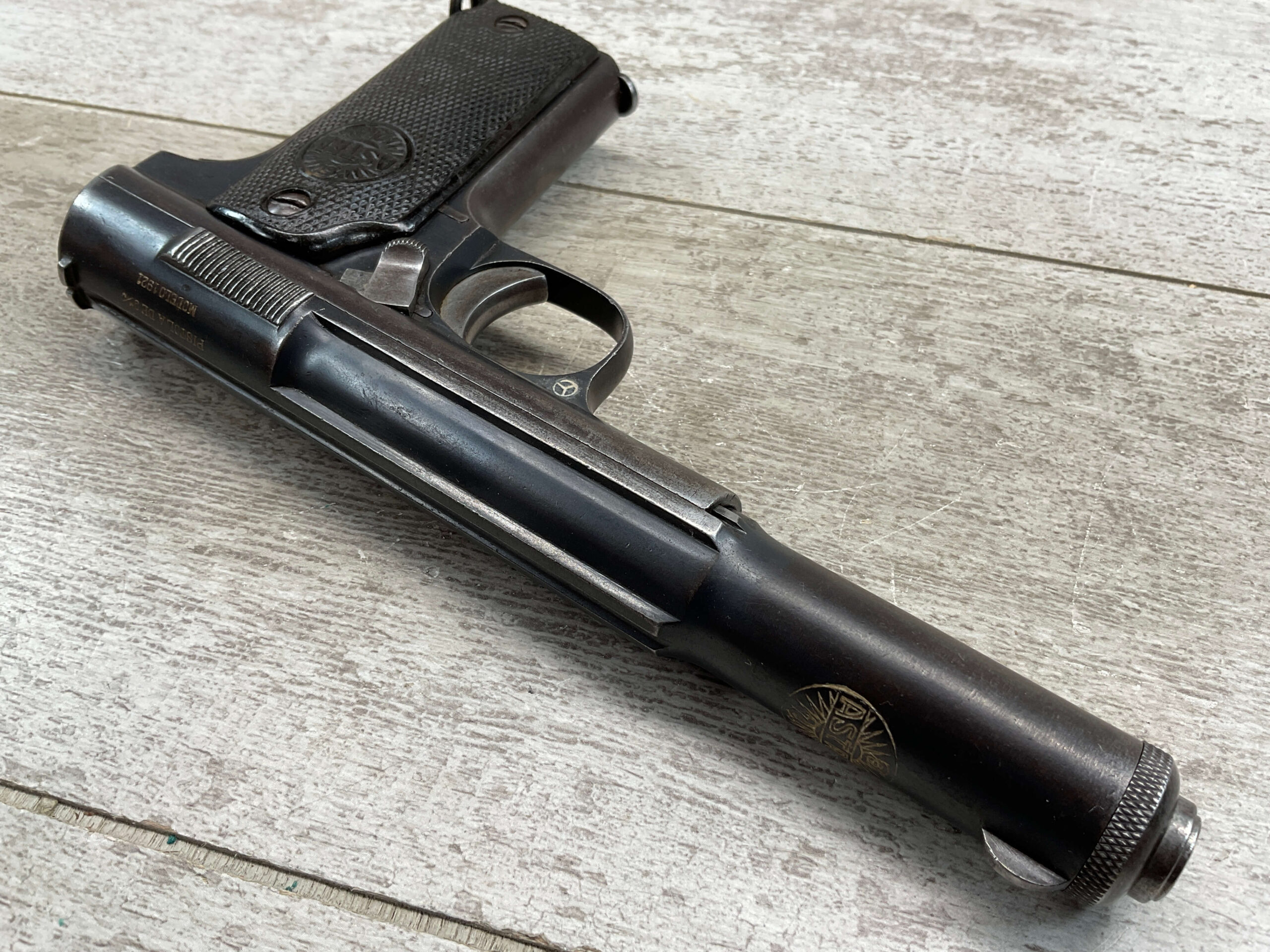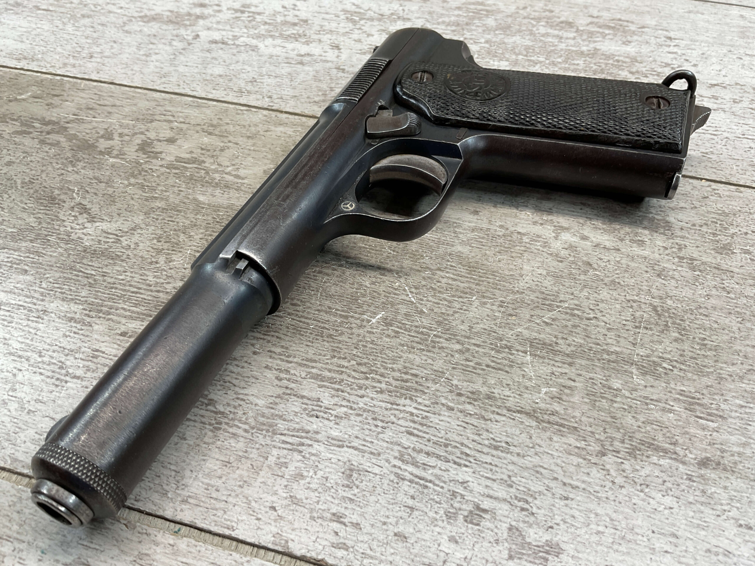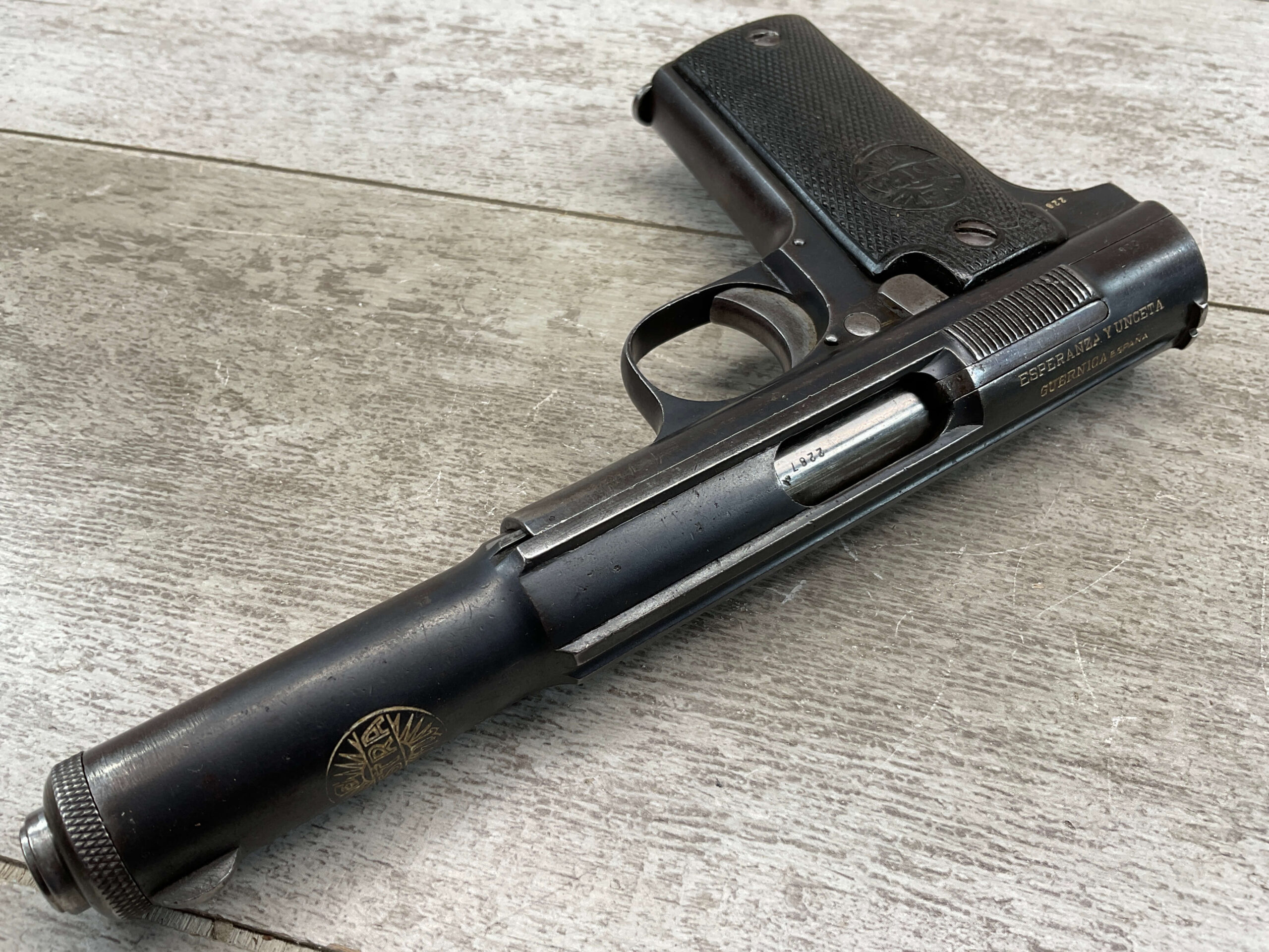 ASTRA MODELO 1921 (400) SEMI-AUTO PISTOL #2287, 9MM LARGO/9×23, GOOD SOLID DIAMOND CHECKERED WOODEN GRIPS, LIGHT HIGH EDGE WEAR W/ AREAS TURNING GREY PATINA, FAIR BORE W/OK RIFLING & FROSTING IN THE GROOVES, ALL MATCHING, ORIGINAL FACTORY MAGAZINE, OVERALL 85%+
