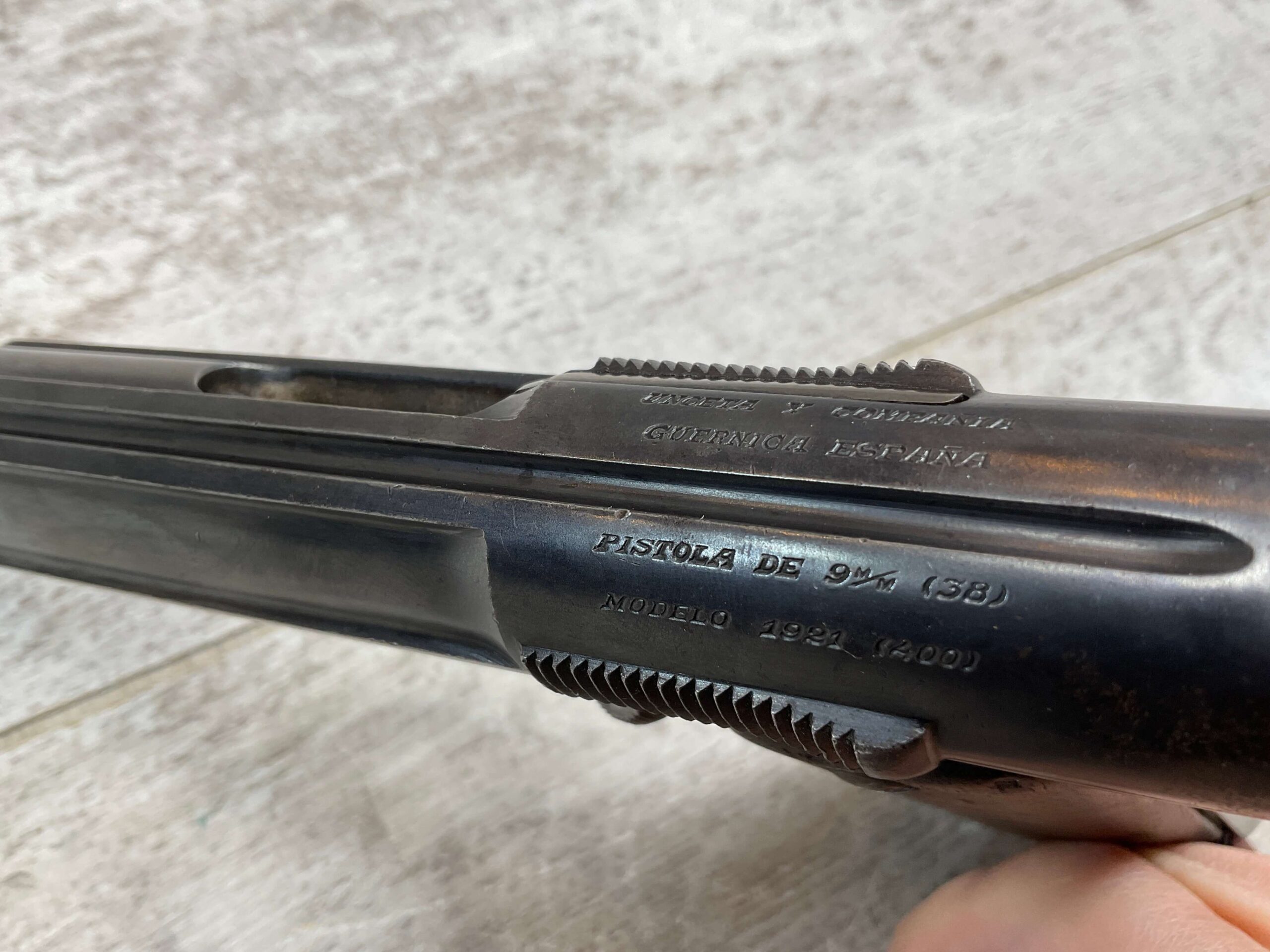 ASTRA MODELO 1921 (400) SEMI-AUTO PISTOL #72946, 1937-38 MFR, 1 OF 15,350 THAT WENT TO VARIOUS SPANISH ARMORIES, 9MM & 38 MARKED BBL (.38ACP), VG SMOOTH WALNUT GRIPS, NORMAL WEAR AND W/VERY LIGHT OXIDATION AROUND REAR SIGHT, LIGHT HIGH EDGE WEAR, DARKER BORE W/GOOD RIFLING & FROSTING THROUGHOUT, ALL MATCHING, 1 UNMARKED MAGAZINE, OVERALL 80+%