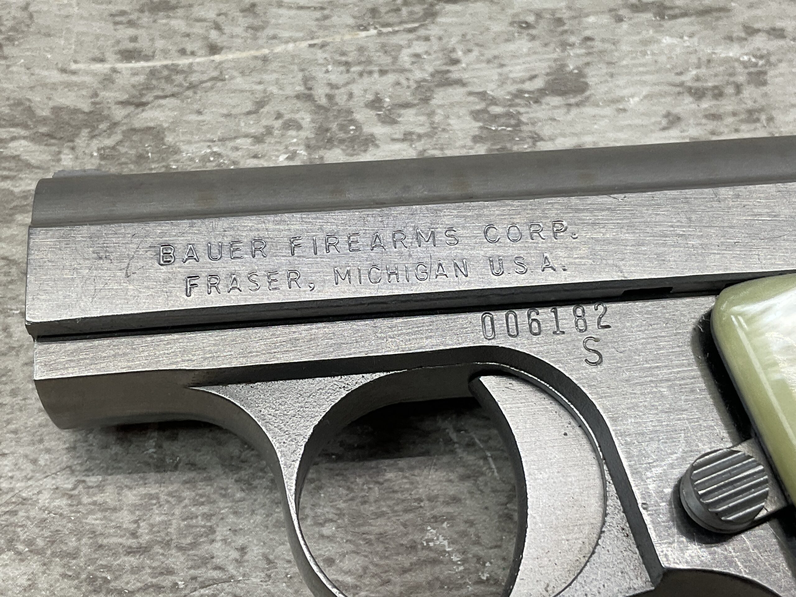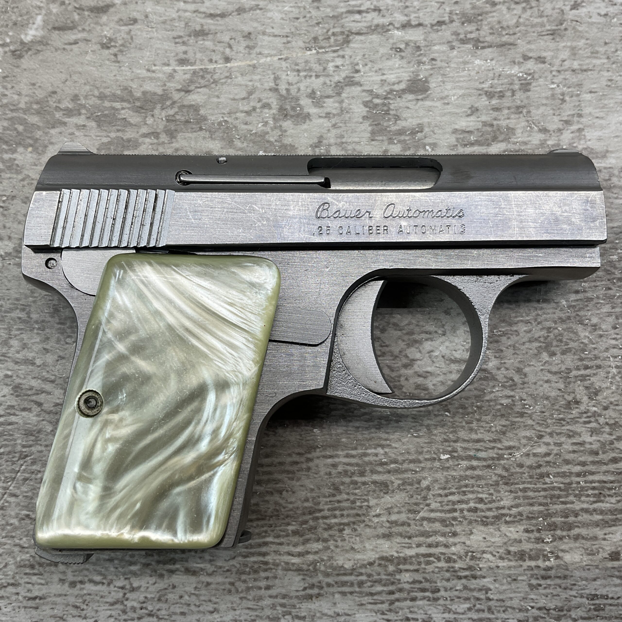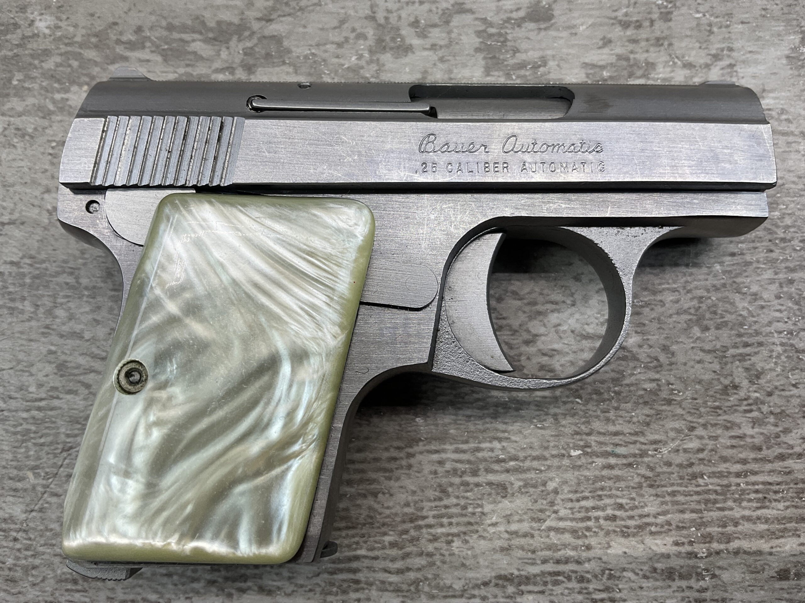 BAUER “BABY” .25 ACP STAINLESS SEMI AUTO POCKET PISTOL, BROWNING CLONE, #006182, 2.5″ BARREL, EXC BORE & RIFLING, 6-ROUND MAGAZINE, EXC MOTHER OF PEARL GRIPS, EXC POLISHED STAINLESS STEEL FRAME & SLIDE, LOADED CHAMBER INDICATOR, FIXED FRONT & REAR SIGHTS, LEFT SLIDE MARKED “BAUER FIREARMS CORP. / FRASER, MICHIGAN U.S.A.”, LEFT SIDE ABOVE TRIGGER GUARD MARKED WITH SERIAL “006182 / S”, RIGHT SLIDE MARKED “BAUER AUTOMATIC / .25 CALIBER AUTOMATIC”, MAG FOOT MARKED “.25 CAL. AUTO”, EXC OVERALL CONDITION!