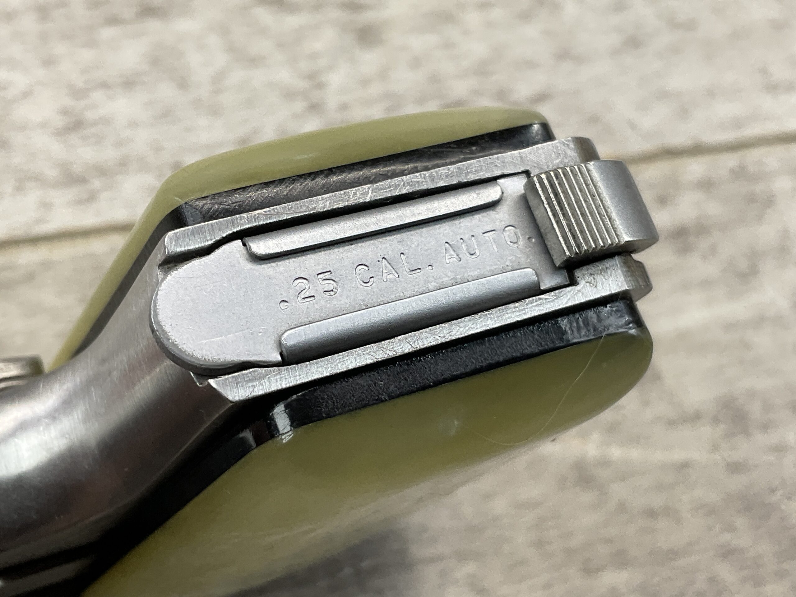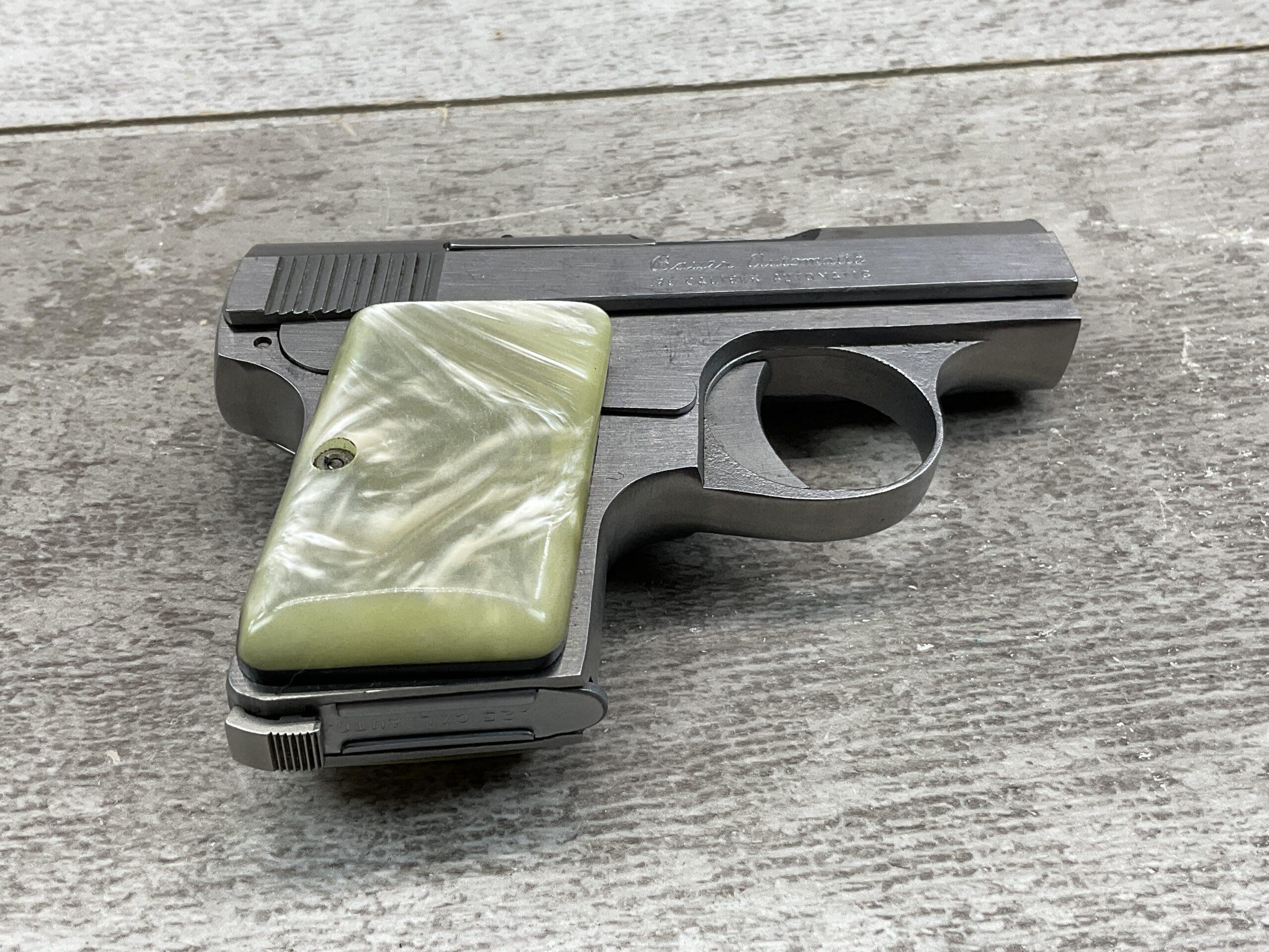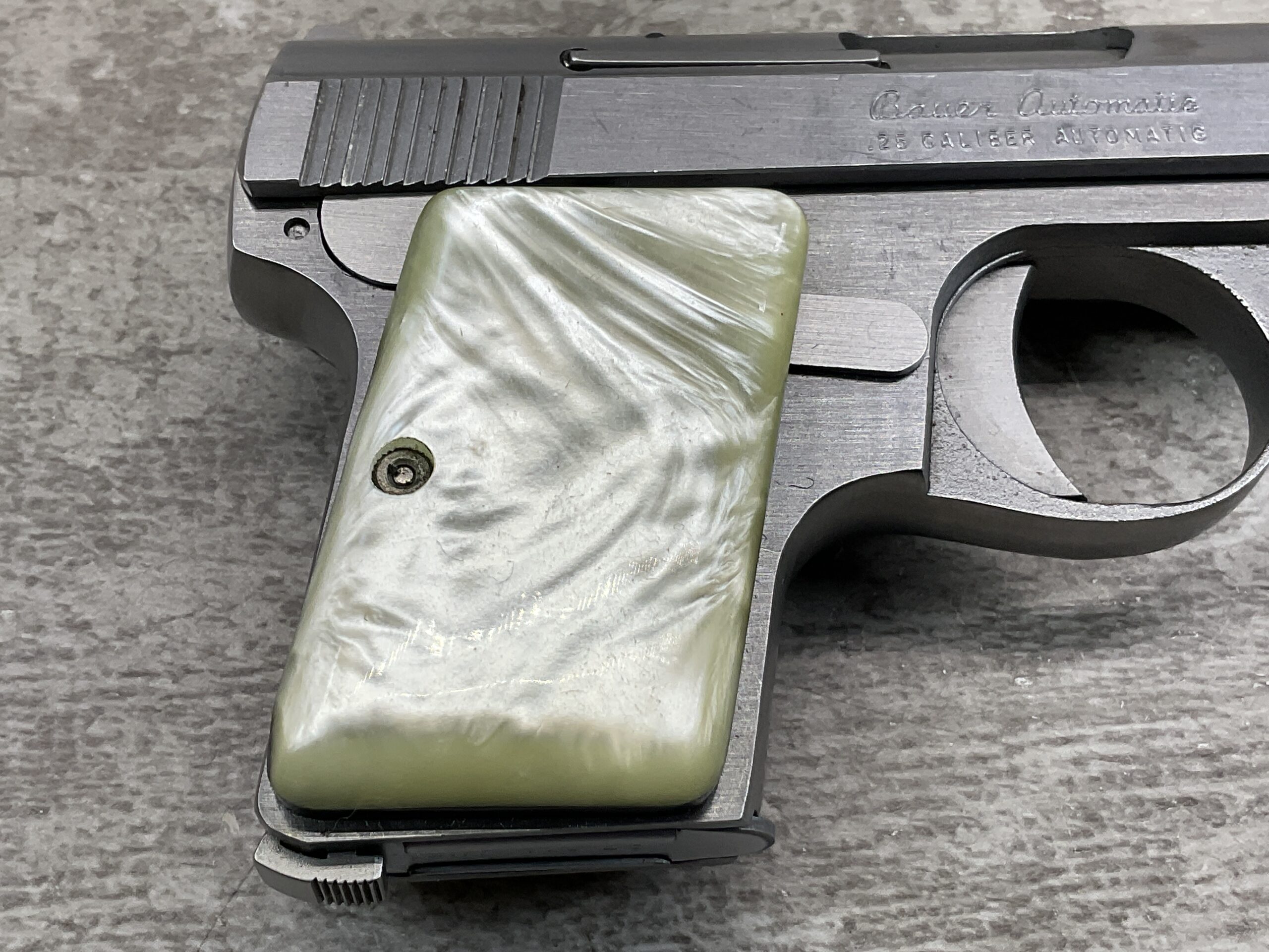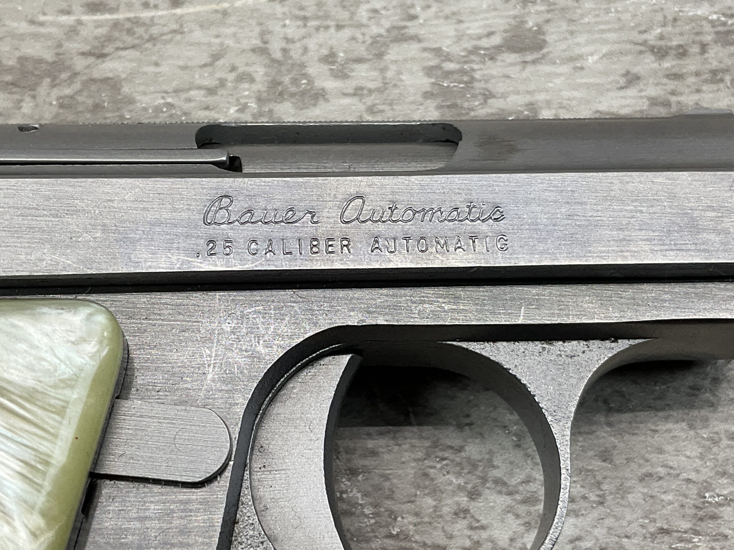 BAUER “BABY” .25 ACP STAINLESS SEMI AUTO POCKET PISTOL, BROWNING CLONE, #006182, 2.5″ BARREL, EXC BORE & RIFLING, 6-ROUND MAGAZINE, EXC MOTHER OF PEARL GRIPS, EXC POLISHED STAINLESS STEEL FRAME & SLIDE, LOADED CHAMBER INDICATOR, FIXED FRONT & REAR SIGHTS, LEFT SLIDE MARKED “BAUER FIREARMS CORP. / FRASER, MICHIGAN U.S.A.”, LEFT SIDE ABOVE TRIGGER GUARD MARKED WITH SERIAL “006182 / S”, RIGHT SLIDE MARKED “BAUER AUTOMATIC / .25 CALIBER AUTOMATIC”, MAG FOOT MARKED “.25 CAL. AUTO”, EXC OVERALL CONDITION!