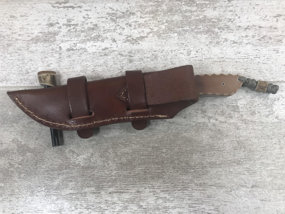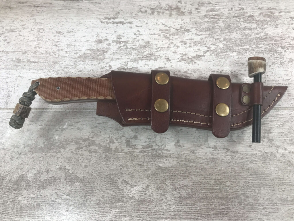 SKU#088 BELT KNIFE WITH 8670 HAND FORGED STEEL BLADE, SCALPED MATURAL MICARTA HANDLE, KNIFE SPINE LEFT HAMMERED TO MATCH THE SCALPED HANDLE, ANTLER AND NATURAL MICARTA FERRO FIRE ROD W/MATCHING ANTLER LANYARD BEAD, LEATHER SCOUT STYLE CARRY SHEATH, THE QUALITY IS AMAZING!!
