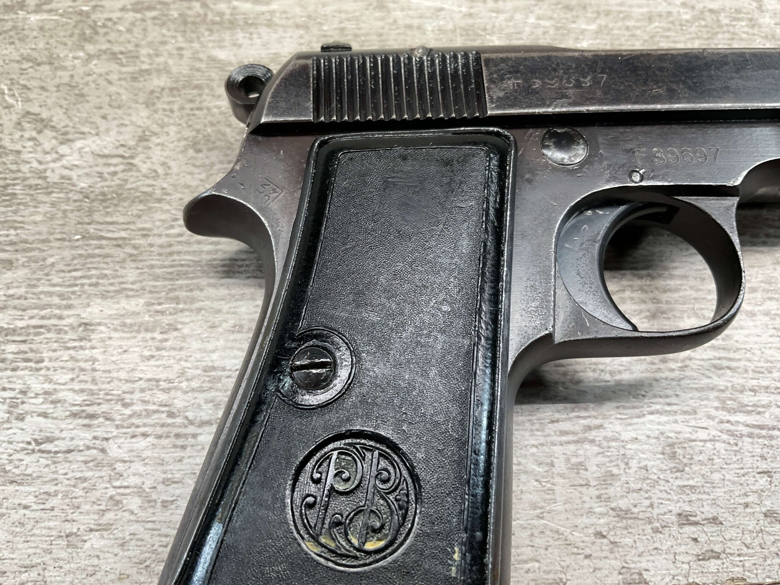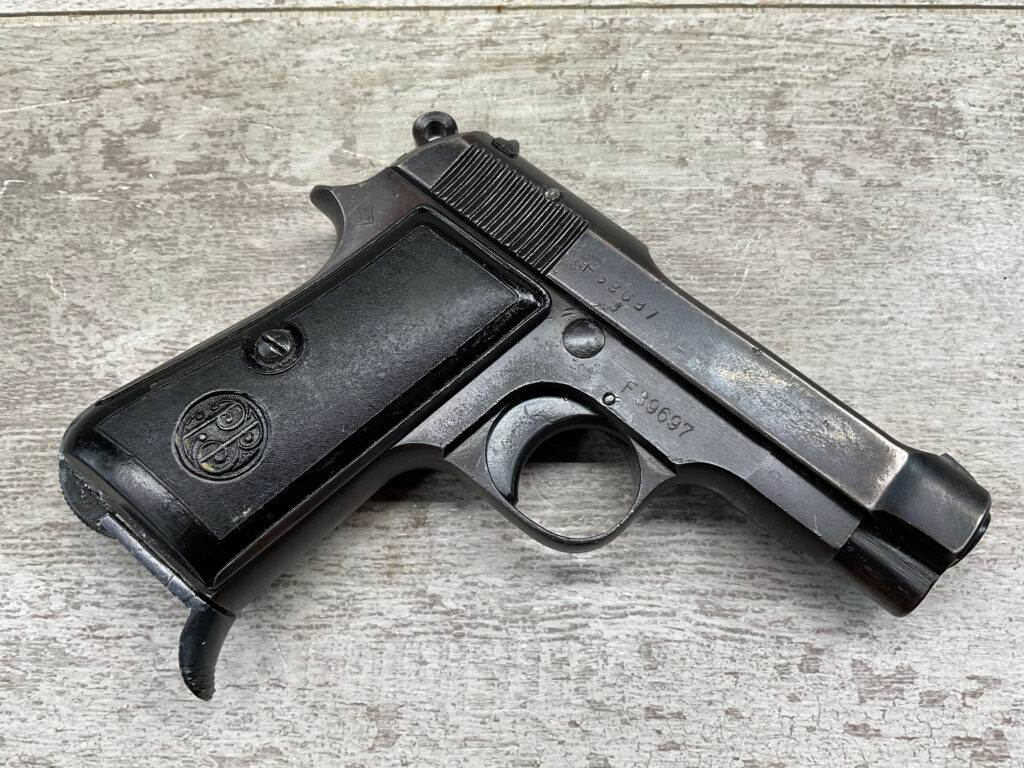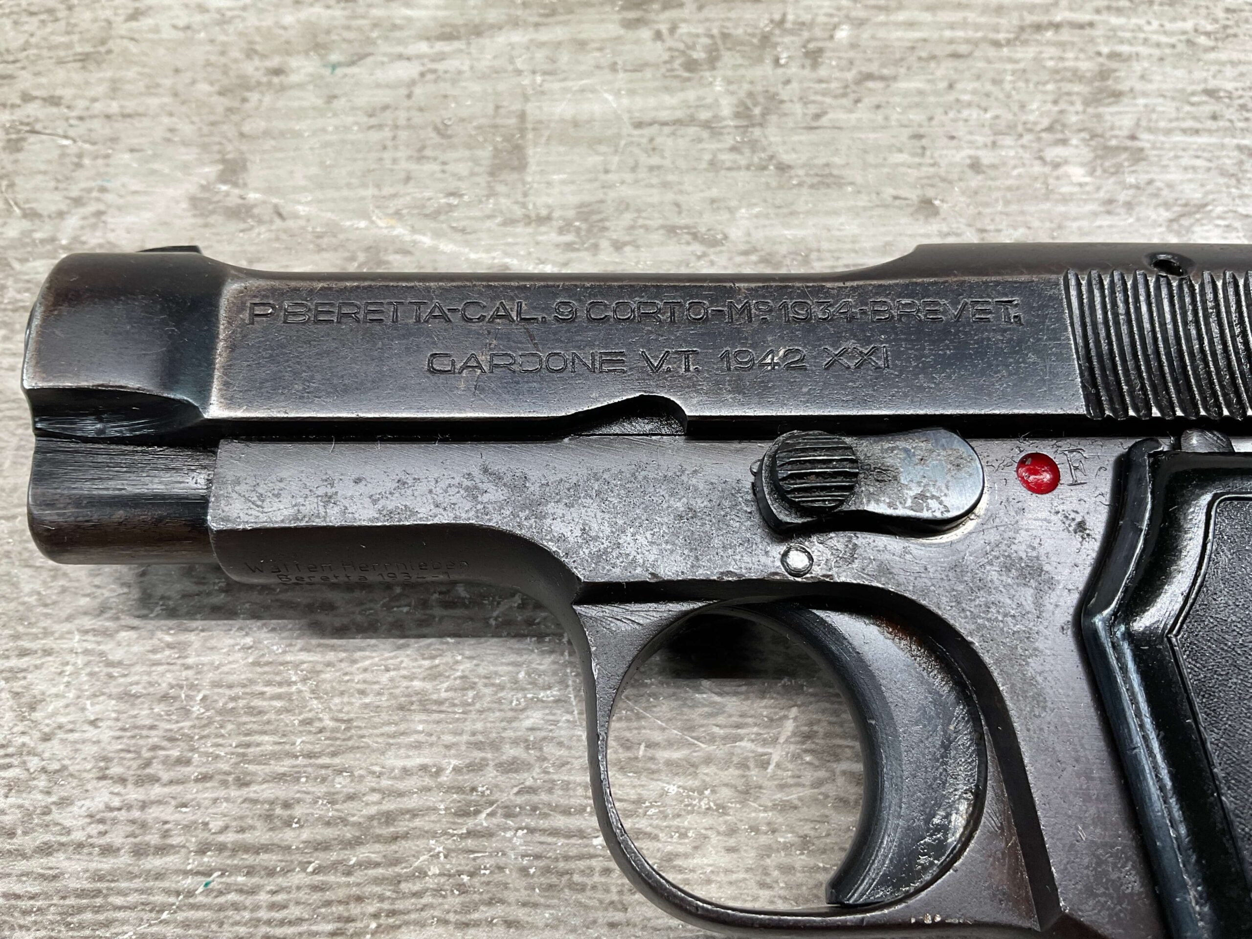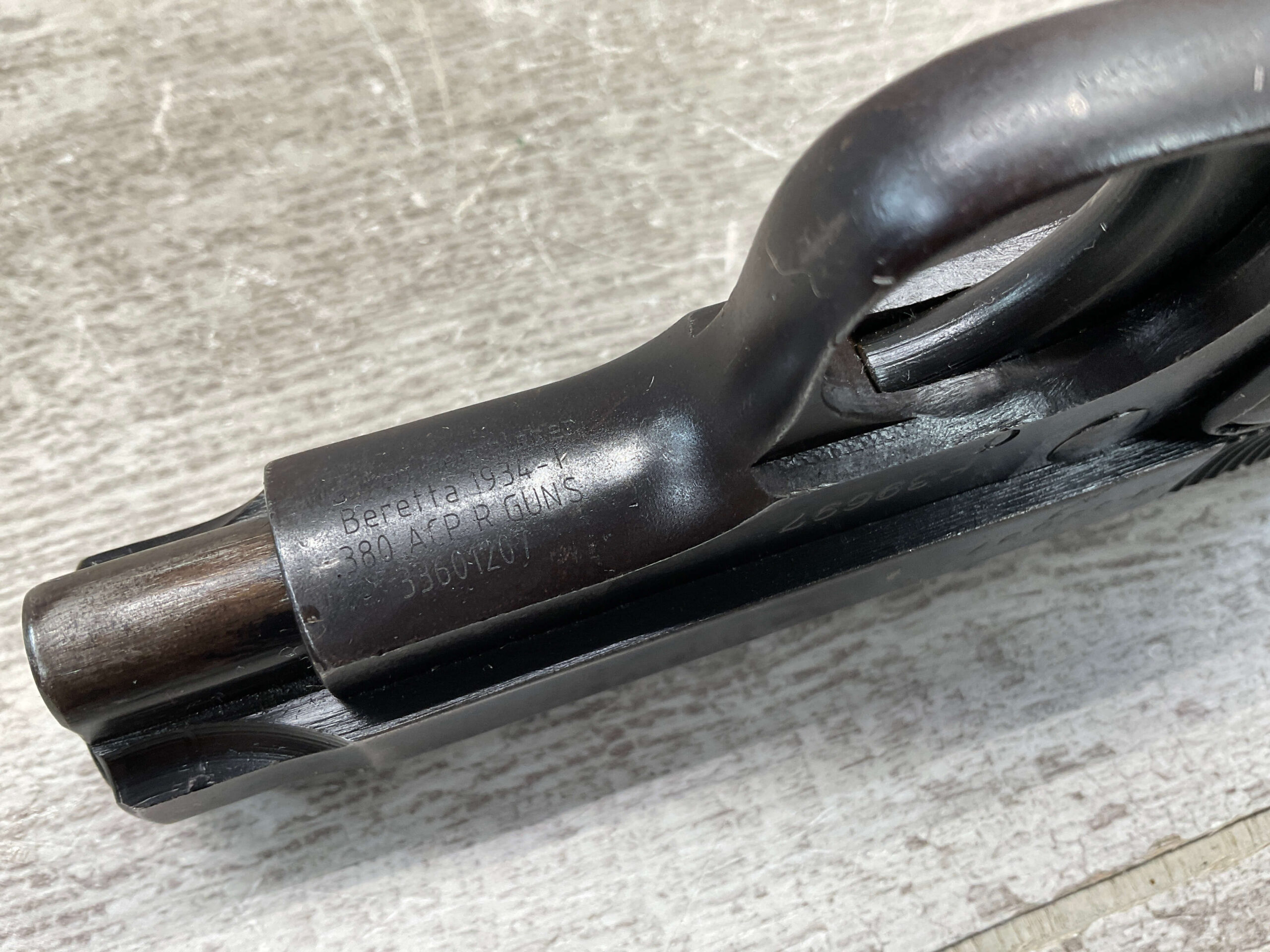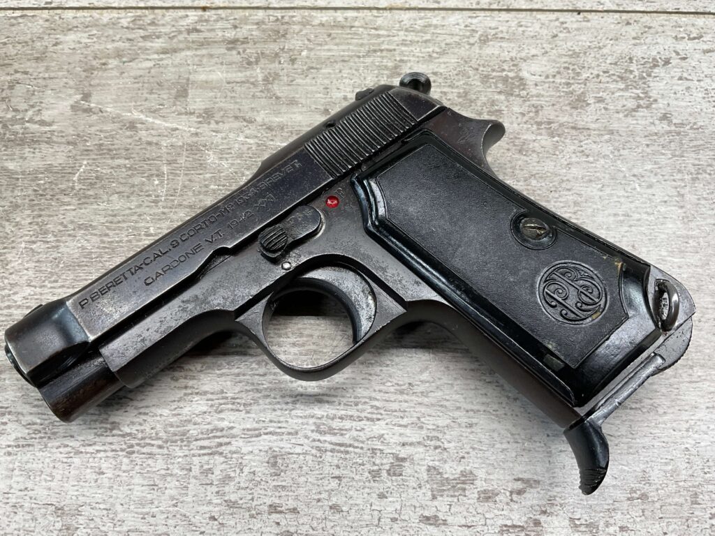 BERETTA M1934 .380 SEMI AUTO PISTOL, 3 1/8″ BBL, VG-EXC CONDITION, ALL 1942 DATED, EAGLE/AM (AIR FORCE MARKED) STAMPED ON LEFT REAR FRAME, VG-EXC BLACK PLASTIC GRIPS, “R GUN” IMPORT ON UNDERSIDE OF FRAME IN FRONT OF TRIGGER GUARD, 1 ORIGINAL MAGAZINE, 7 ROUND CAPACITY, STRONG BORE, MANY AVAILABLE, MECHANICALLY FINE.