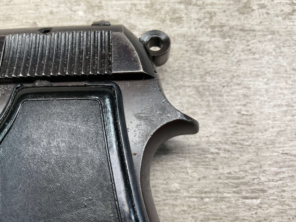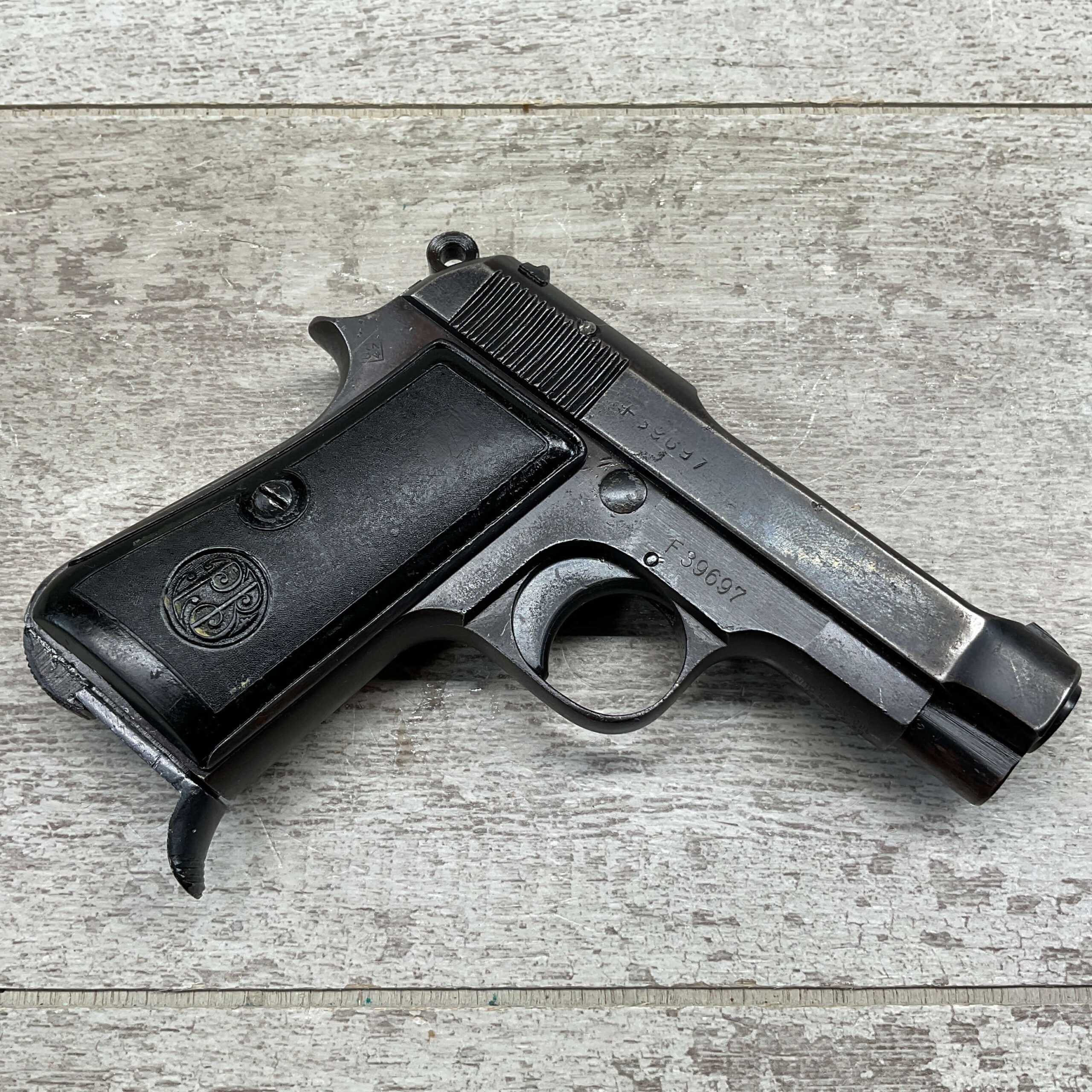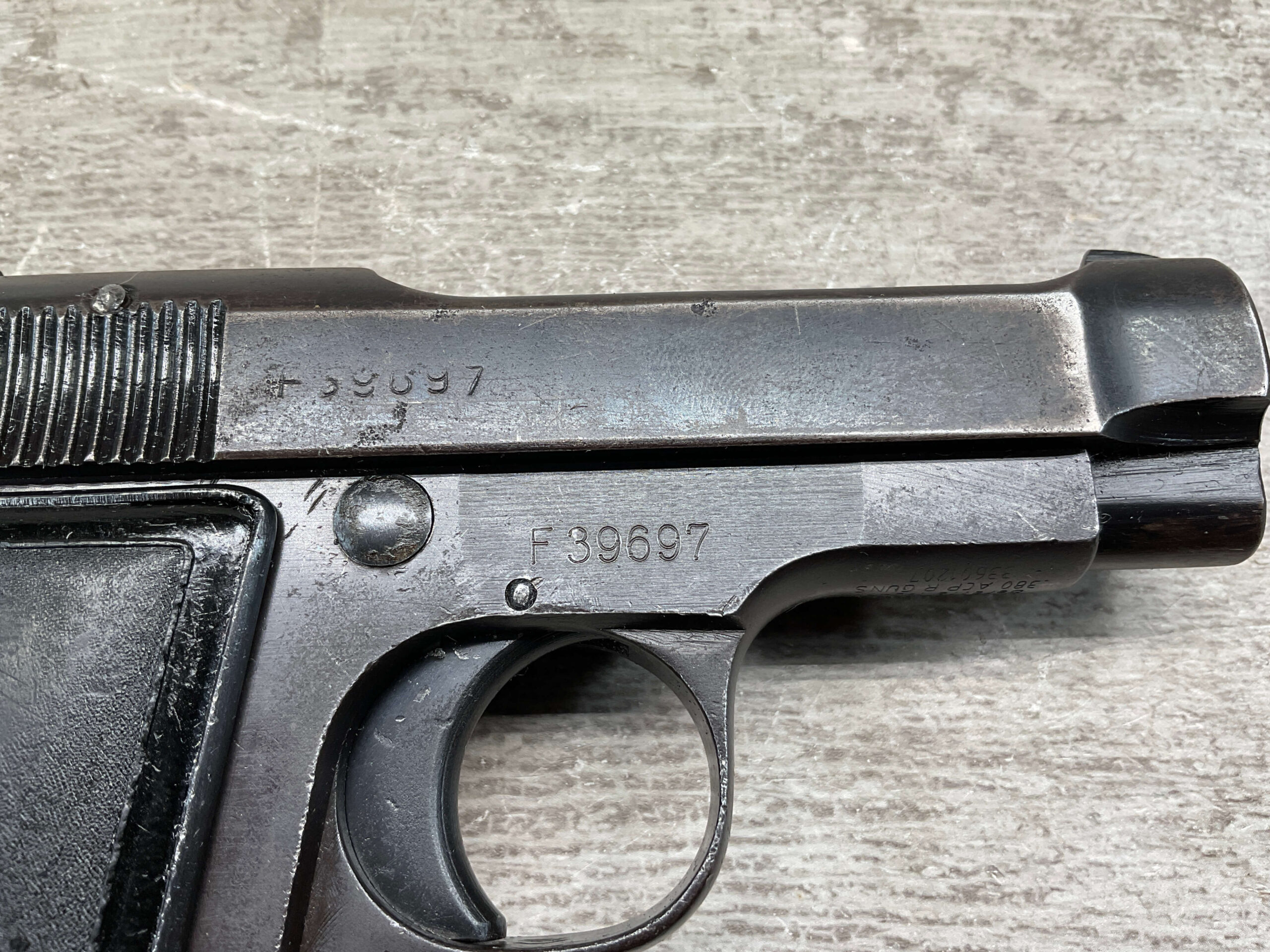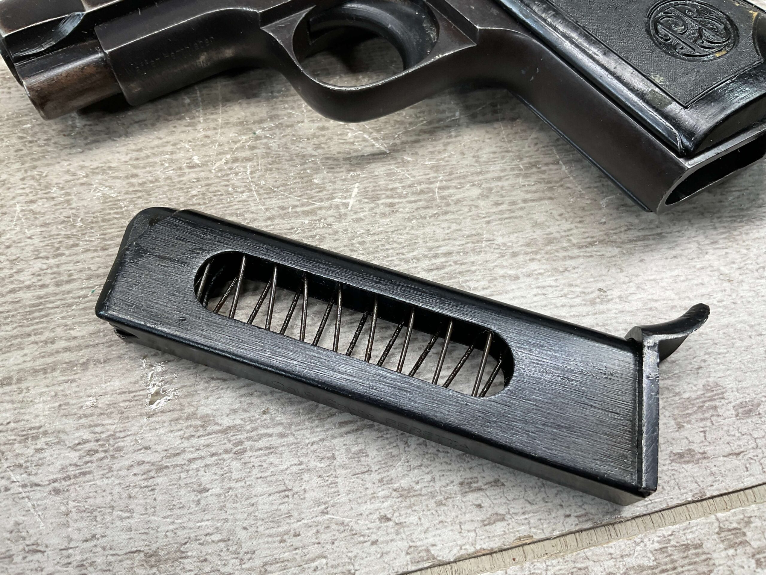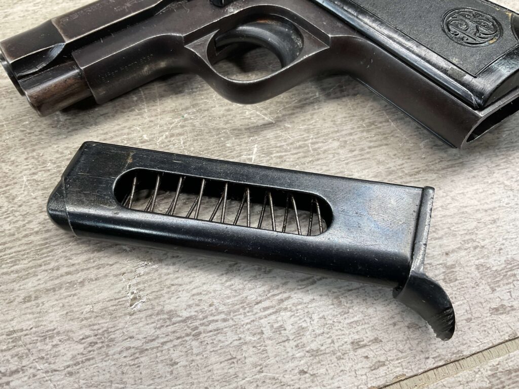 BERETTA M1934 .380 SEMI AUTO PISTOL, 3 1/8″ BBL, VG-EXC CONDITION, ALL 1942 DATED, EAGLE/AM (AIR FORCE MARKED) STAMPED ON LEFT REAR FRAME, VG-EXC BLACK PLASTIC GRIPS, “R GUN” IMPORT ON UNDERSIDE OF FRAME IN FRONT OF TRIGGER GUARD, 1 ORIGINAL MAGAZINE, 7 ROUND CAPACITY, STRONG BORE, MANY AVAILABLE, MECHANICALLY FINE.