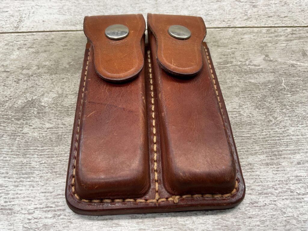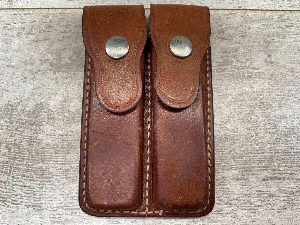 BIANCHI 20-C .22/9MM TWO MAG POUCH, BROWN LEATHER, POUCH IS IN VG-EXC CONDITION, GOOD STITCHING, BACK IS MARKED “BIANCHI / MONROVIA, CALIF. / 20-C / .22/9MM”.