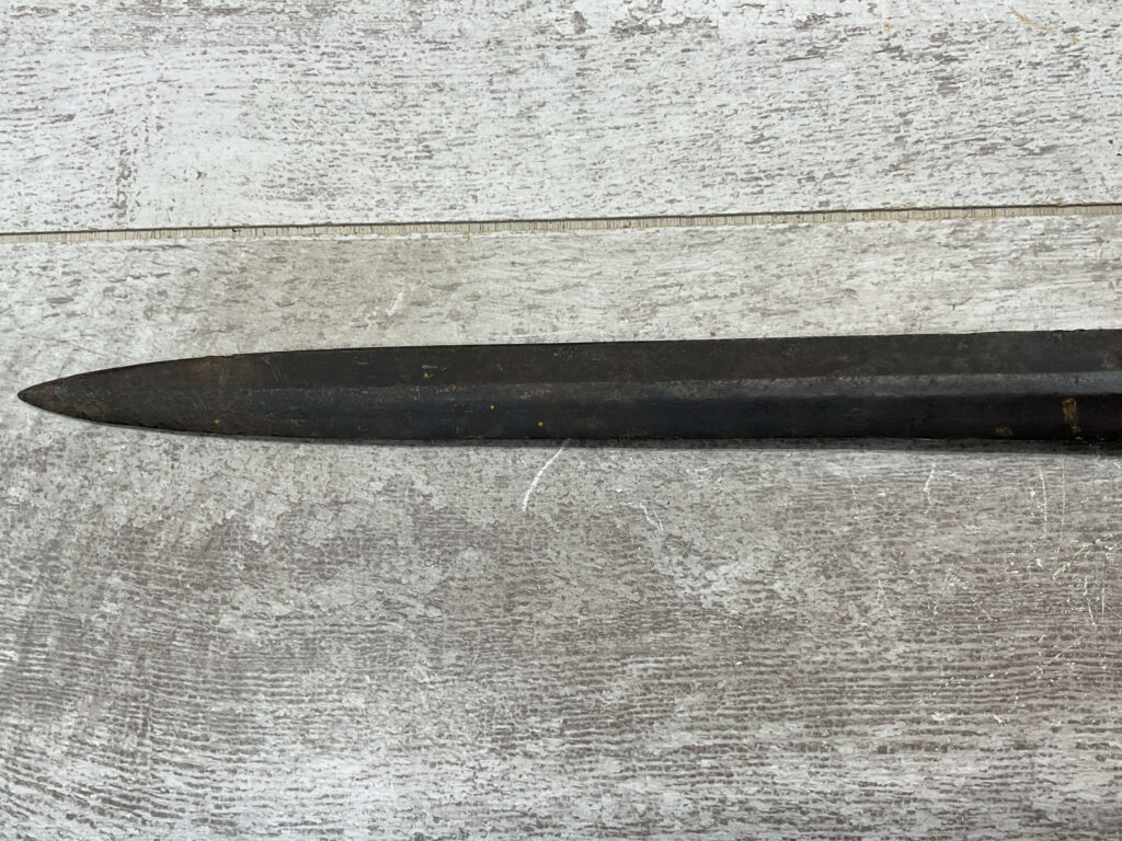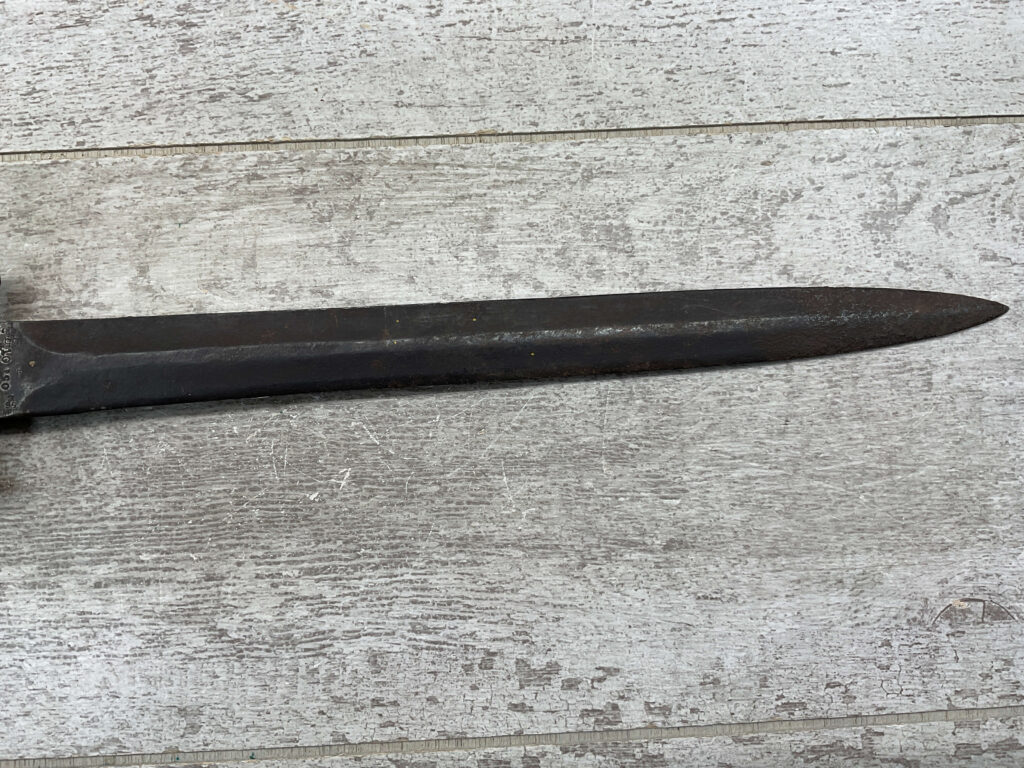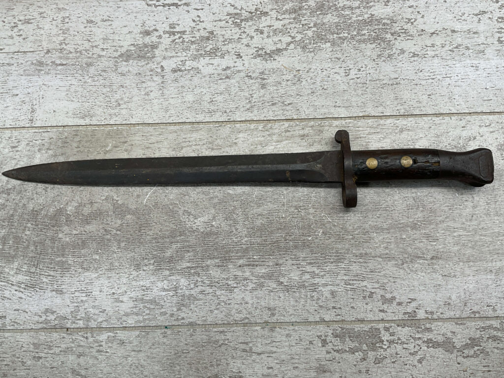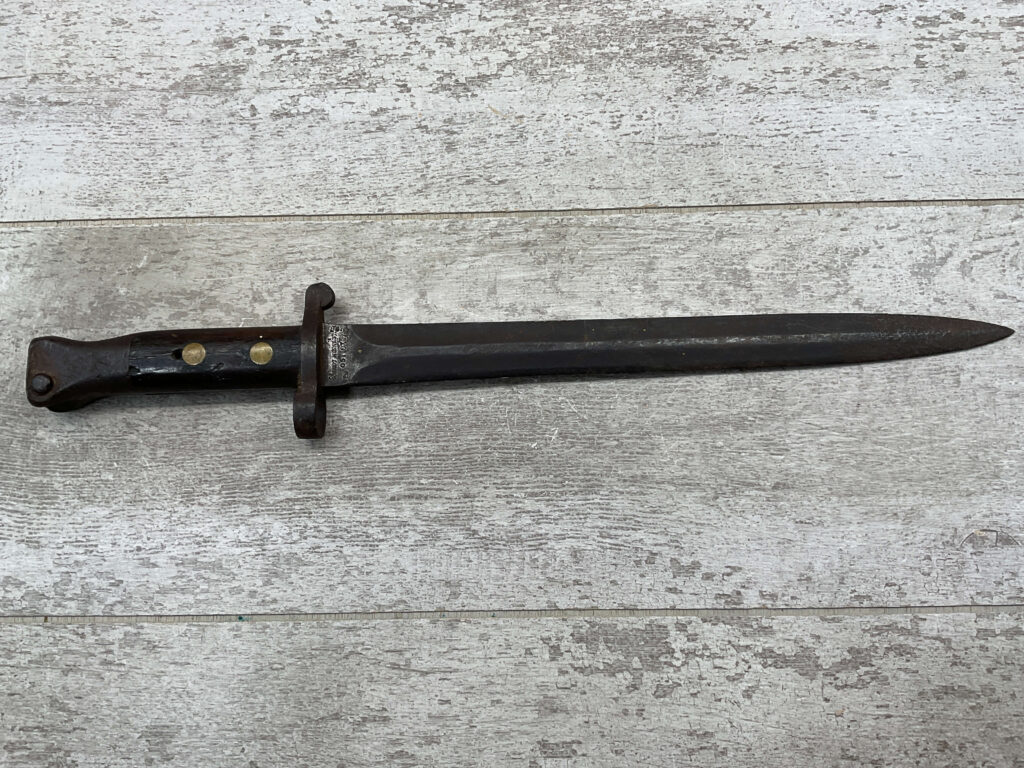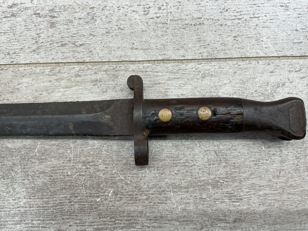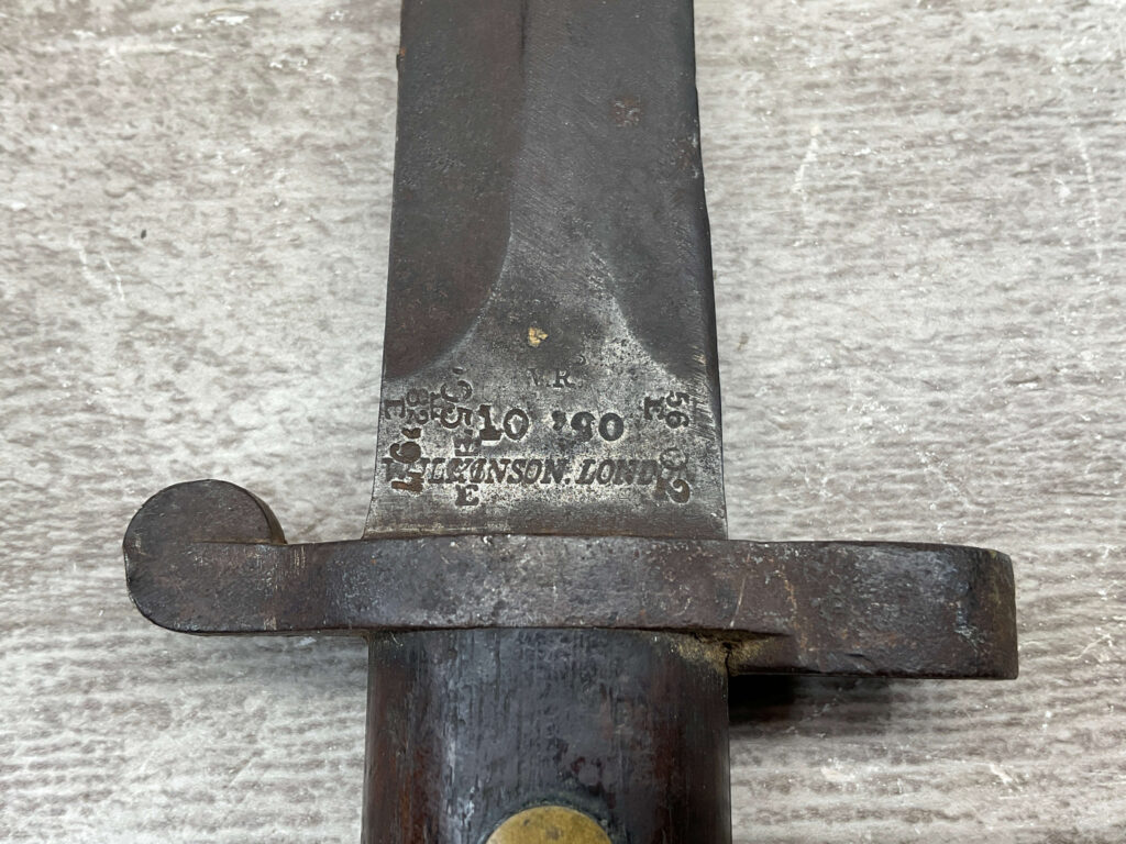BRITISH 1888 PATTERN BAYONET, 16 15/16″ OVERALL LENGTH, 11 11/16″ BLADE LENGTH, BLADE MARKED “WILKINSON LONDON” WITH OTHER MARKINGS & BRITISH PROOFS, PRESS STUD DOESN’T DEPRESS, FAIR OVERALL