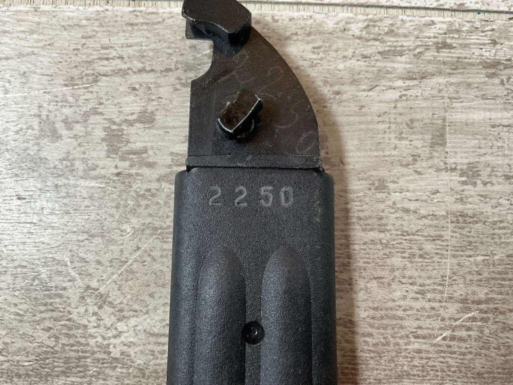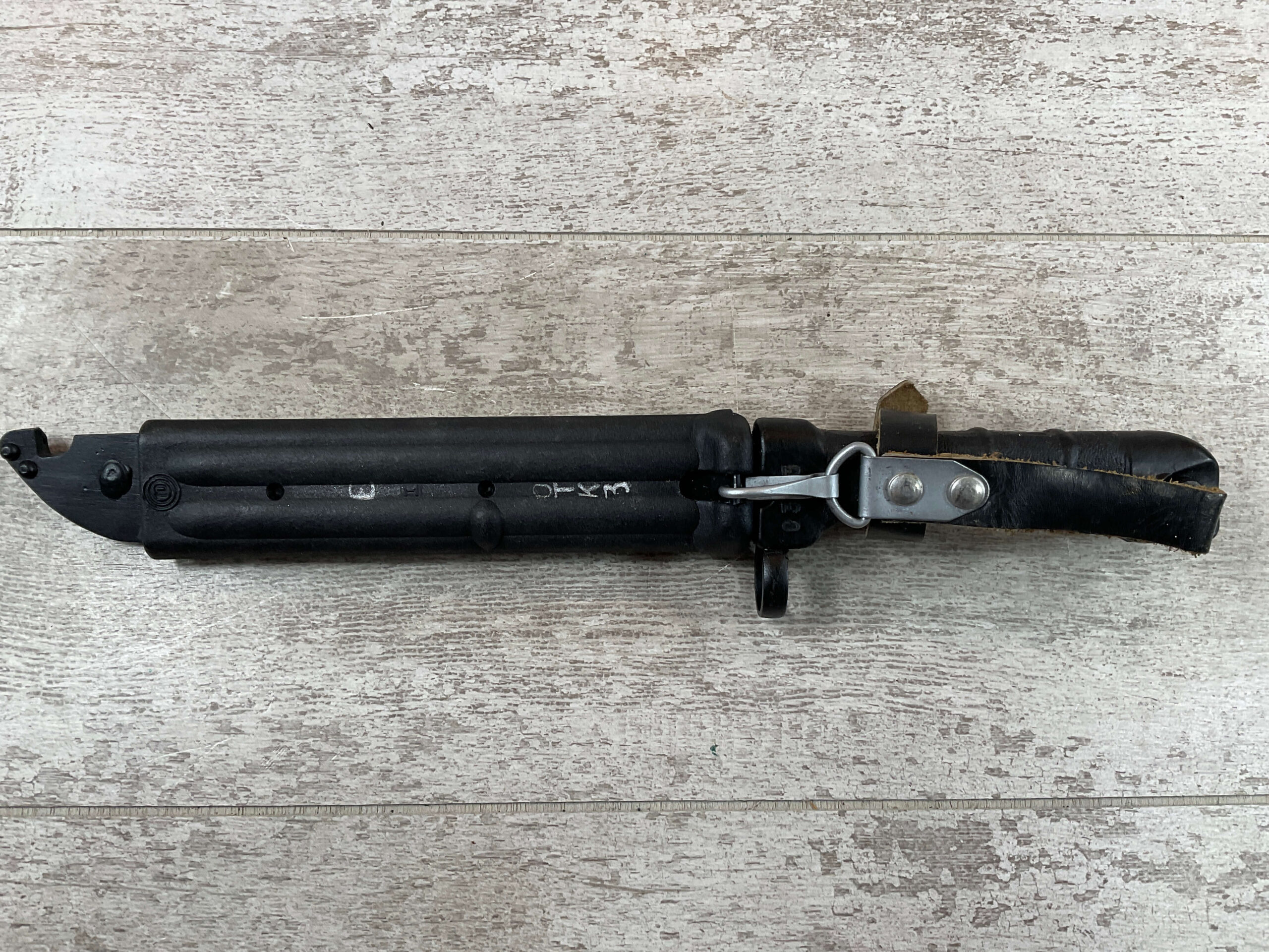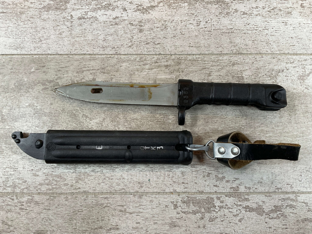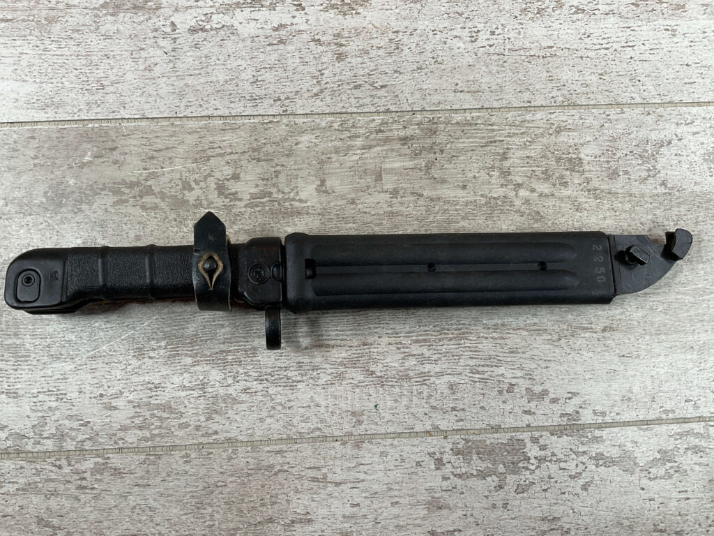 BULGARIAN AK74 KNIFE BAYONET/TYPE I SCABBARD W/BELT HANGER, SCABBARD BLACK PLASTIC IN EXC CONDITION MARKED “2250” AND “DOUBLE CIRLE 10” ON OTHER SIDE, LEATHER BELT HANGER, COSMOLINE STILL PRESENT ON BLADE, NEVER ISSUED, EXC OVERALL CONDITION