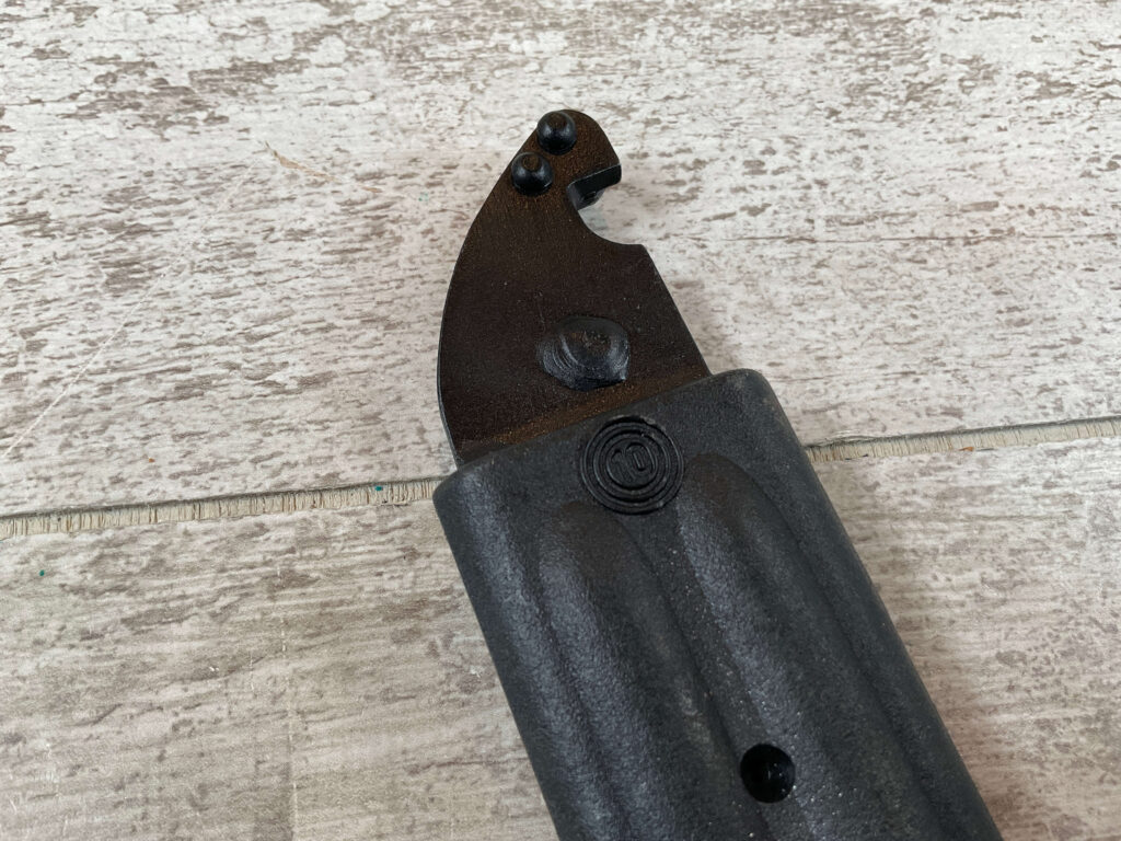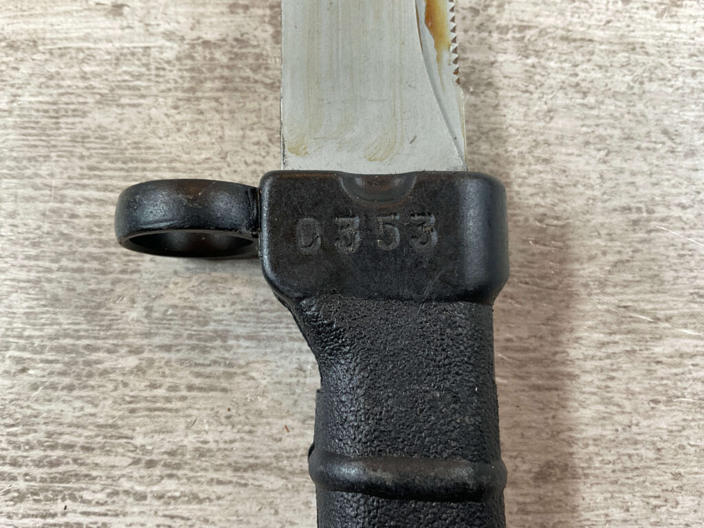INTRODUCED IN 1986, THE AK74 BAYONET REPRESENTS A FURTHER REFINEMENT OF THE AKM BAYONET. CONTINUED IMPROVEMENTS IN PLASTICS TECHNOLOGY ENABLED A RETURN TO THE ONE-PIECE MOLDED PLASTIC GRIP. THE AK74 GRIP HAS A STIPPLED NON-SLIP SURFACE, WITH CONCENTRIC RIDGES THAT SERVE AS FINGER GROOVES; AND, INCORPORATES A PLASTIC VERSION OF THE TYPE II POMMEL. IMPROVED ERGONOMICS MADE THE RETENTION STRAP UNNECESSARY. THE AK74 INTRODUCED A RADICAL BLADE CROSS-SECTION, THAT HAS A FLAT MILLED ON ONE SIDE NEAR THE EDGE AND A CORRESPONDING FLAT MILLED ON THE OPPOSITE SIDE NEAR THE FALSE EDGE. THE BLADE HAS A SPEAR POINT AND THE USUAL HOLE FOR USE AS A WIRE-CUTTER. AN INSPECTION MARK IS STAMPED ON THE RICASSO. THE SCABBARD IS SIMILAR TO THE TYPE II SCABBARD.