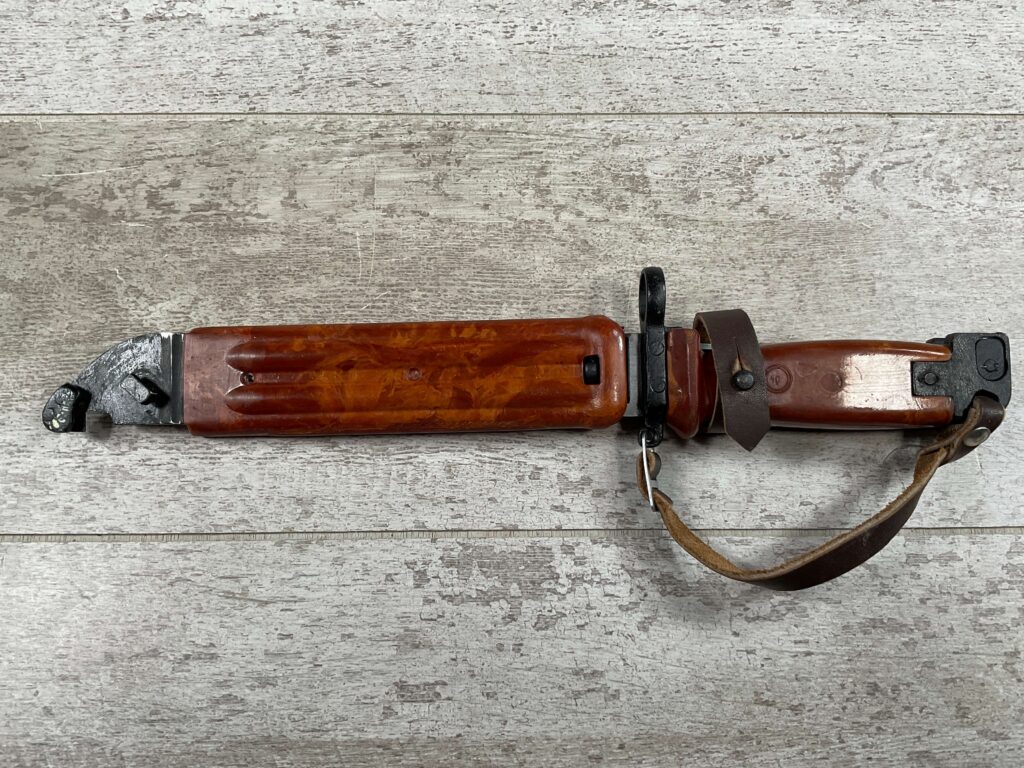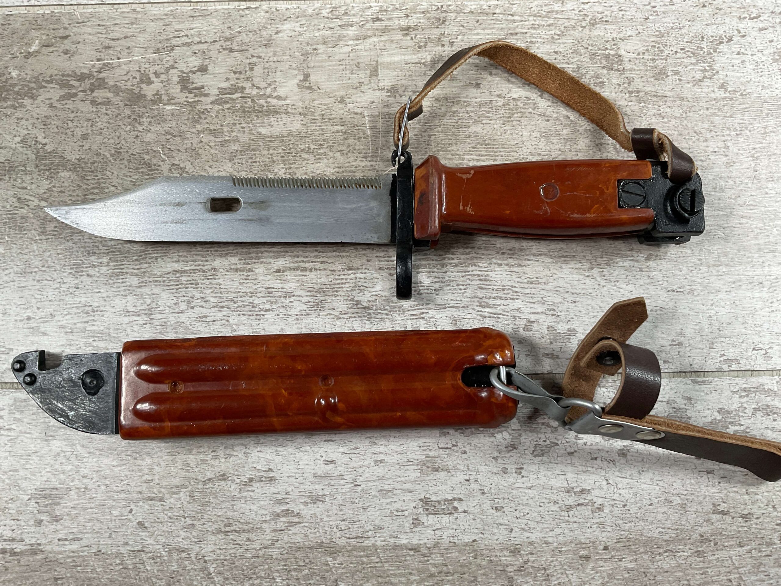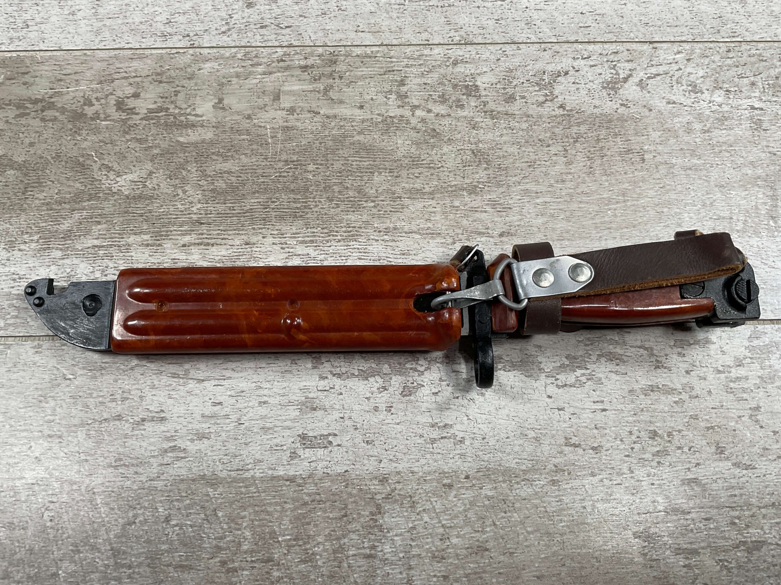 BULGARIAN AKM TYPE II KNIFE BAYONET W/RETENTION STRAP & BELT HANGER, SCABBARD IS REFERRED TO AS BAKELITE ALTHOUGH IT IS A POLYMER, EXC BROWN LEATHER BELT HANGER, EXC OVERALL CONDITION