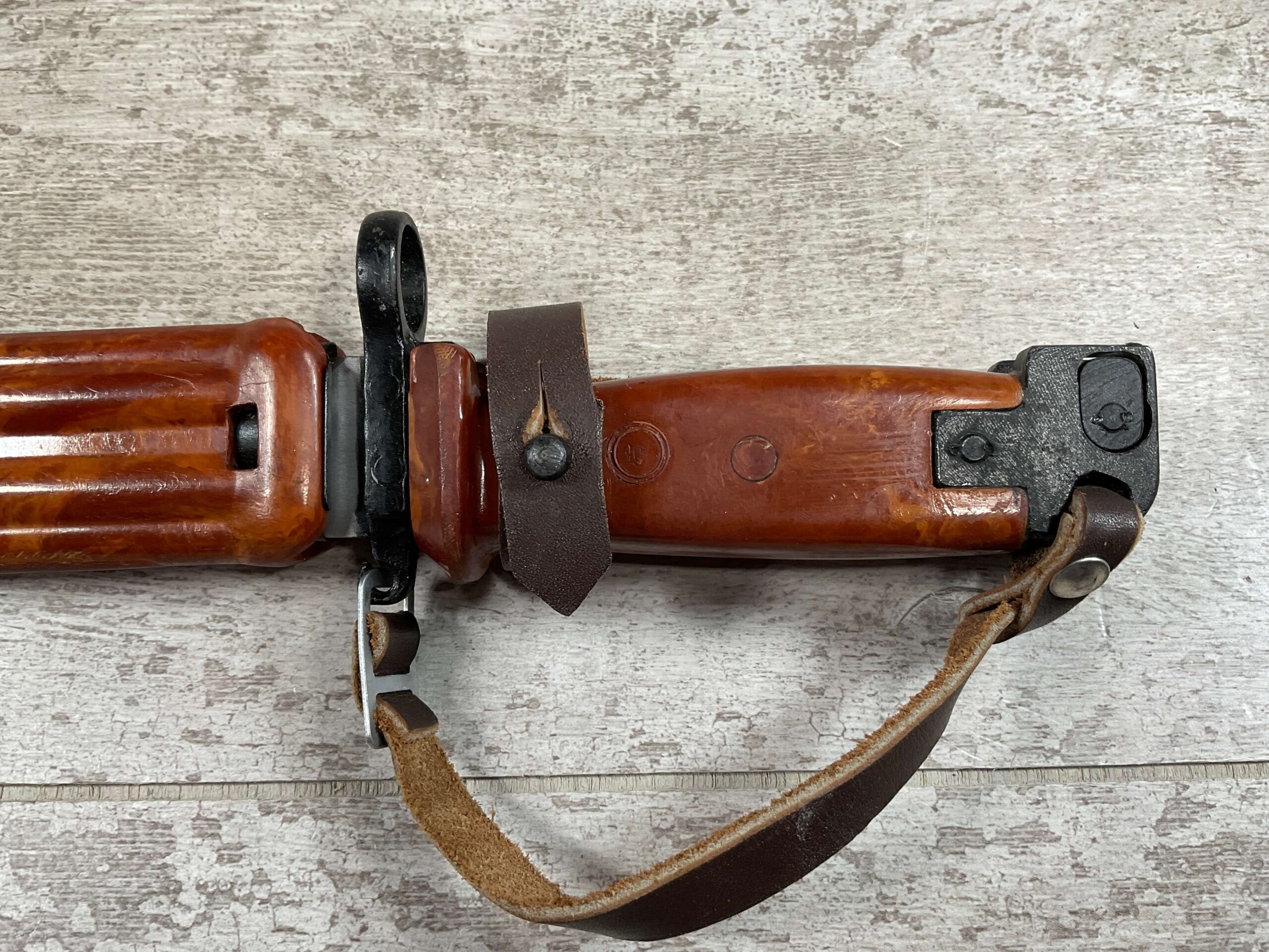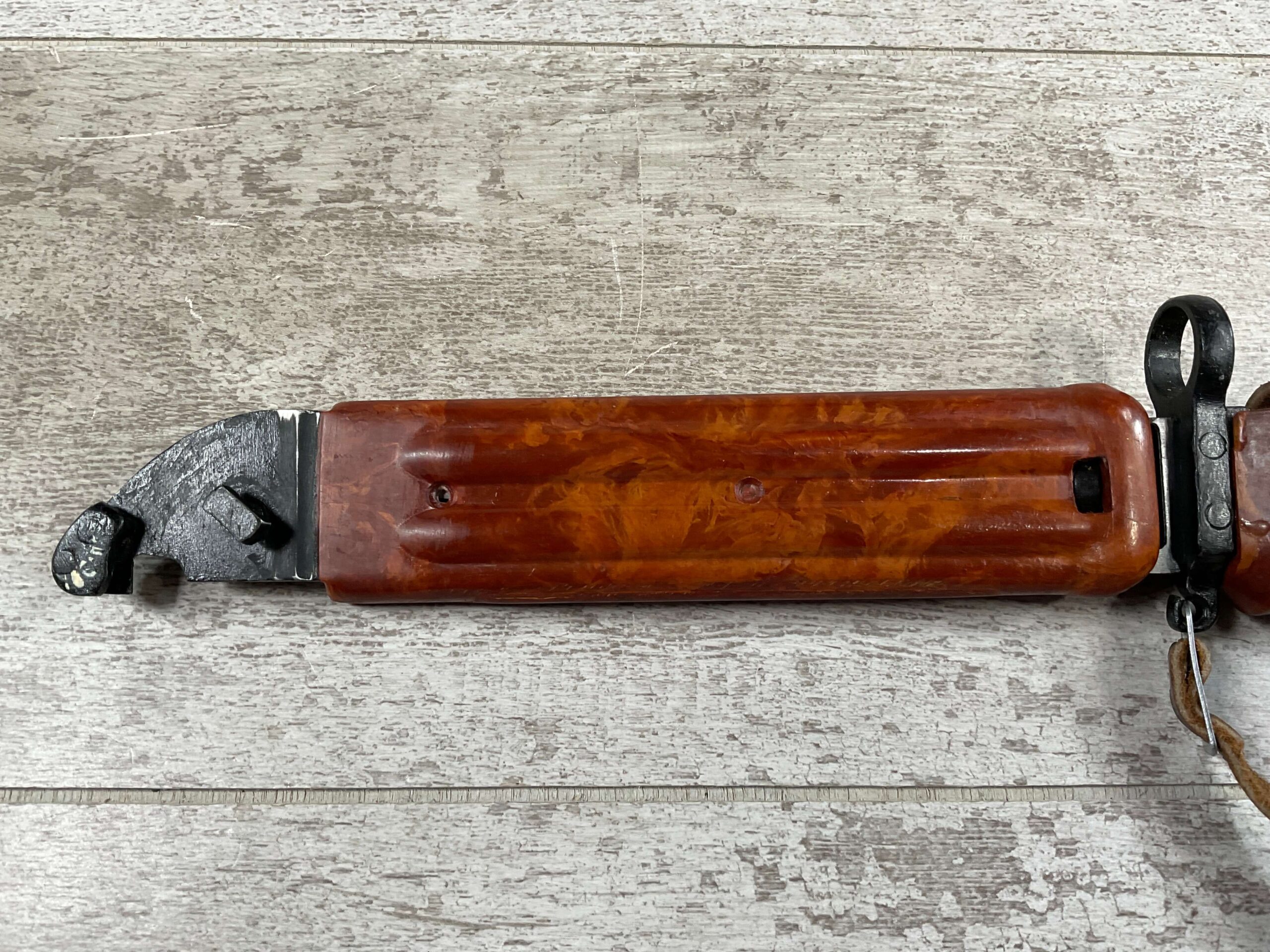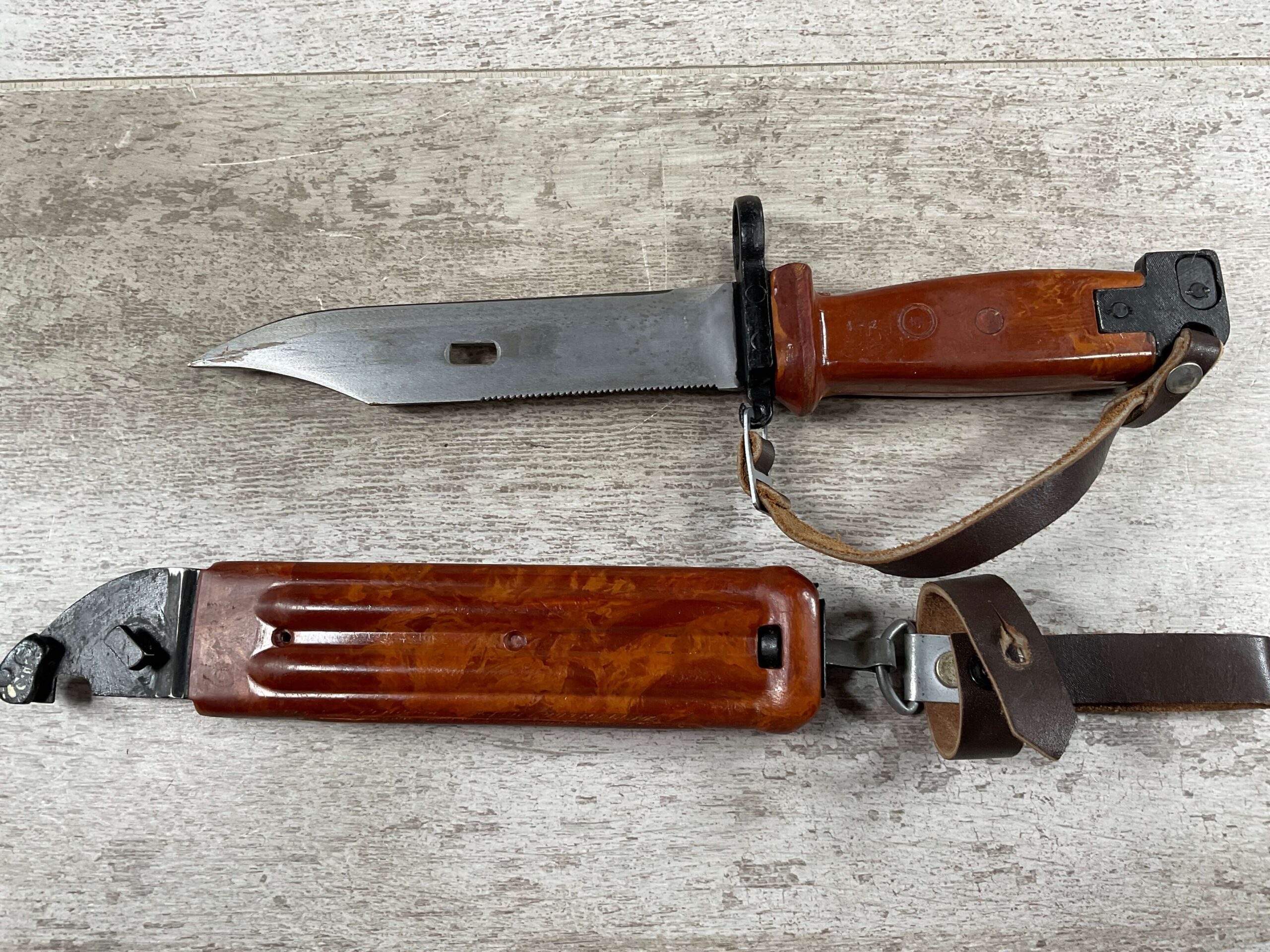 BULGARIAN AKM TYPE II KNIFE BAYONET W/RETENTION STRAP & BELT HANGER, SCABBARD IS REFERRED TO AS BAKELITE ALTHOUGH IT IS A POLYMER, EXC BROWN LEATHER BELT HANGER, EXC OVERALL CONDITION