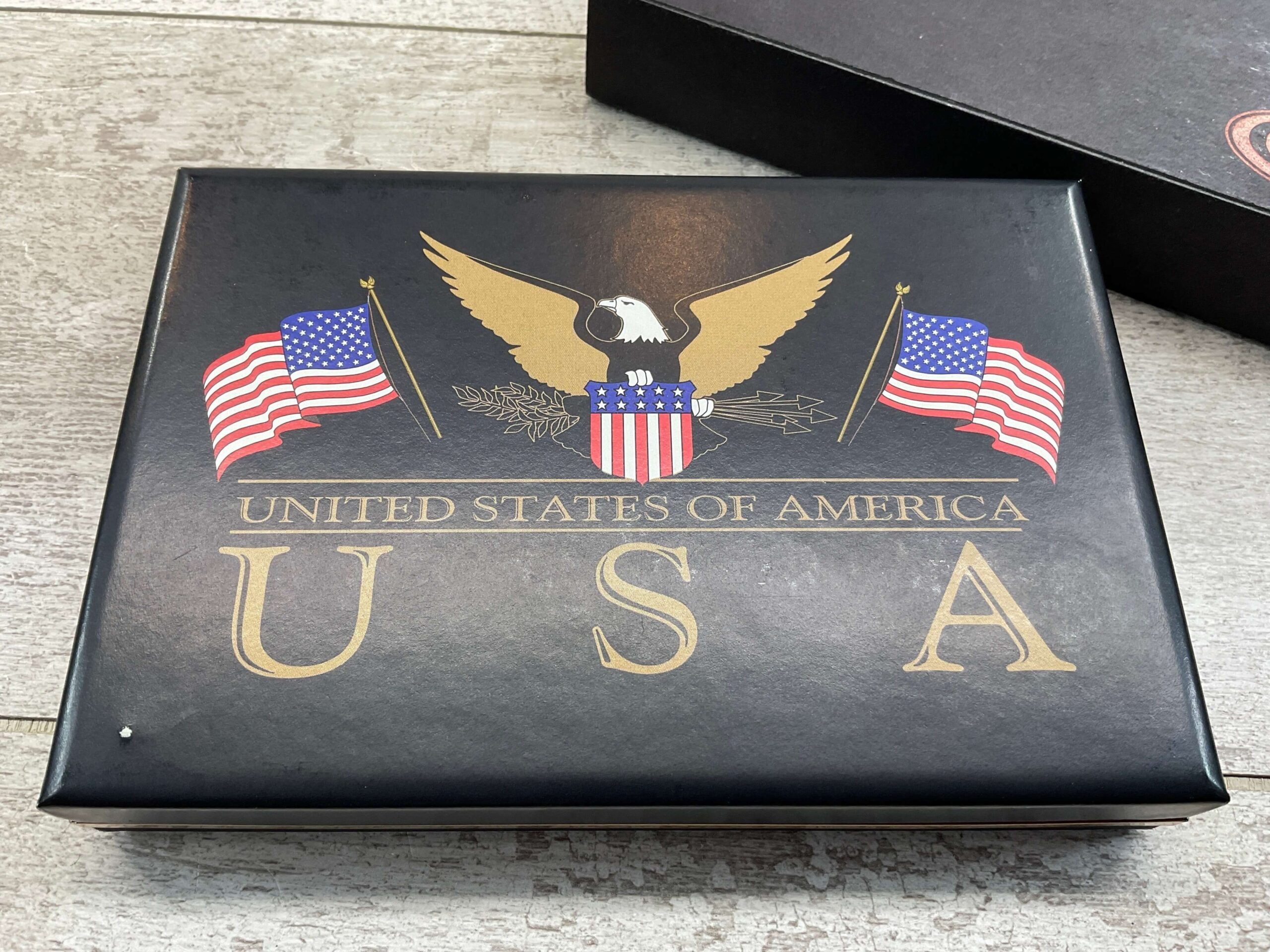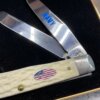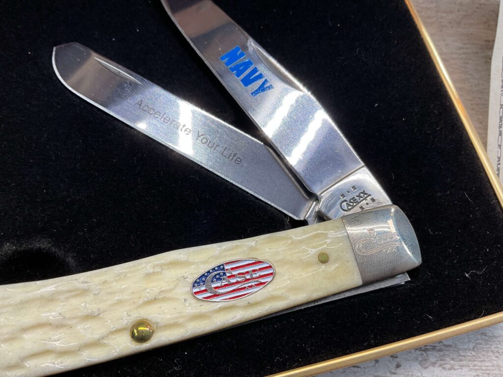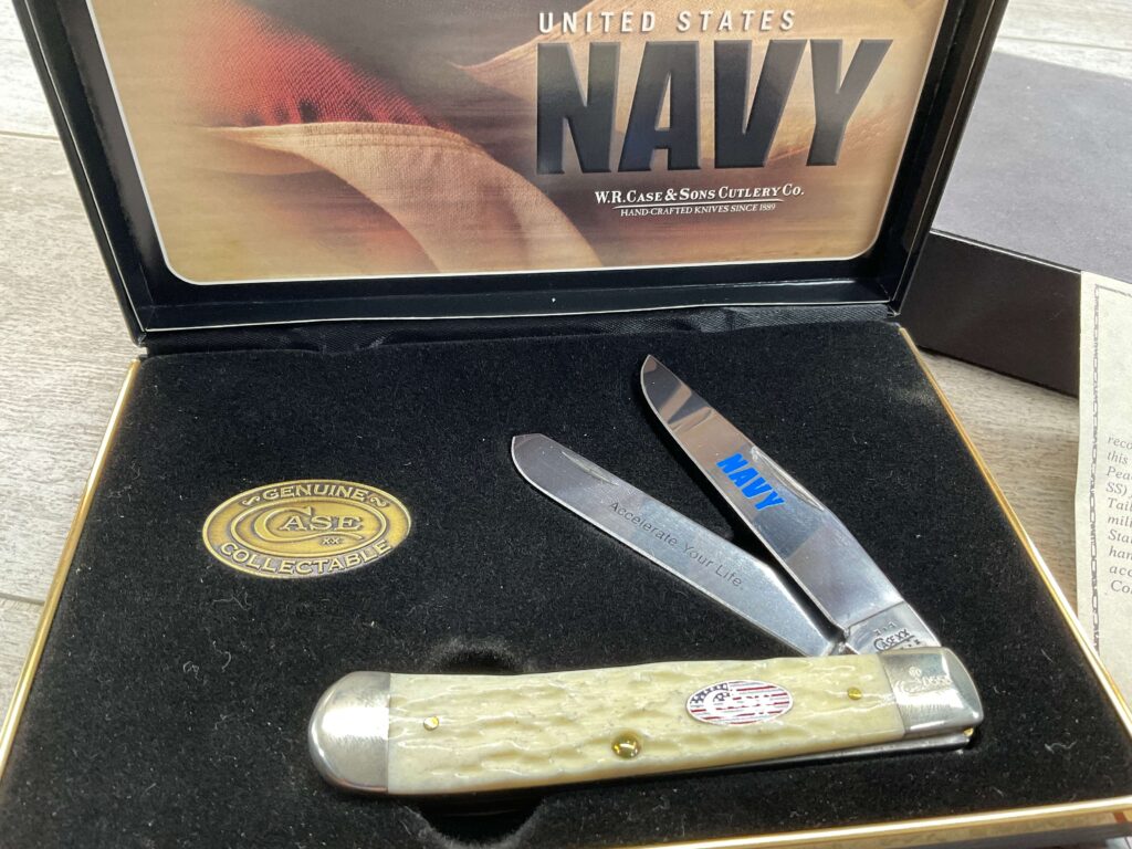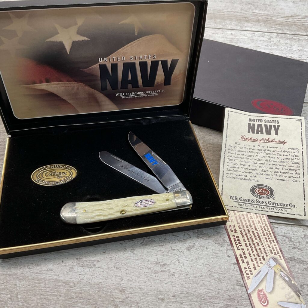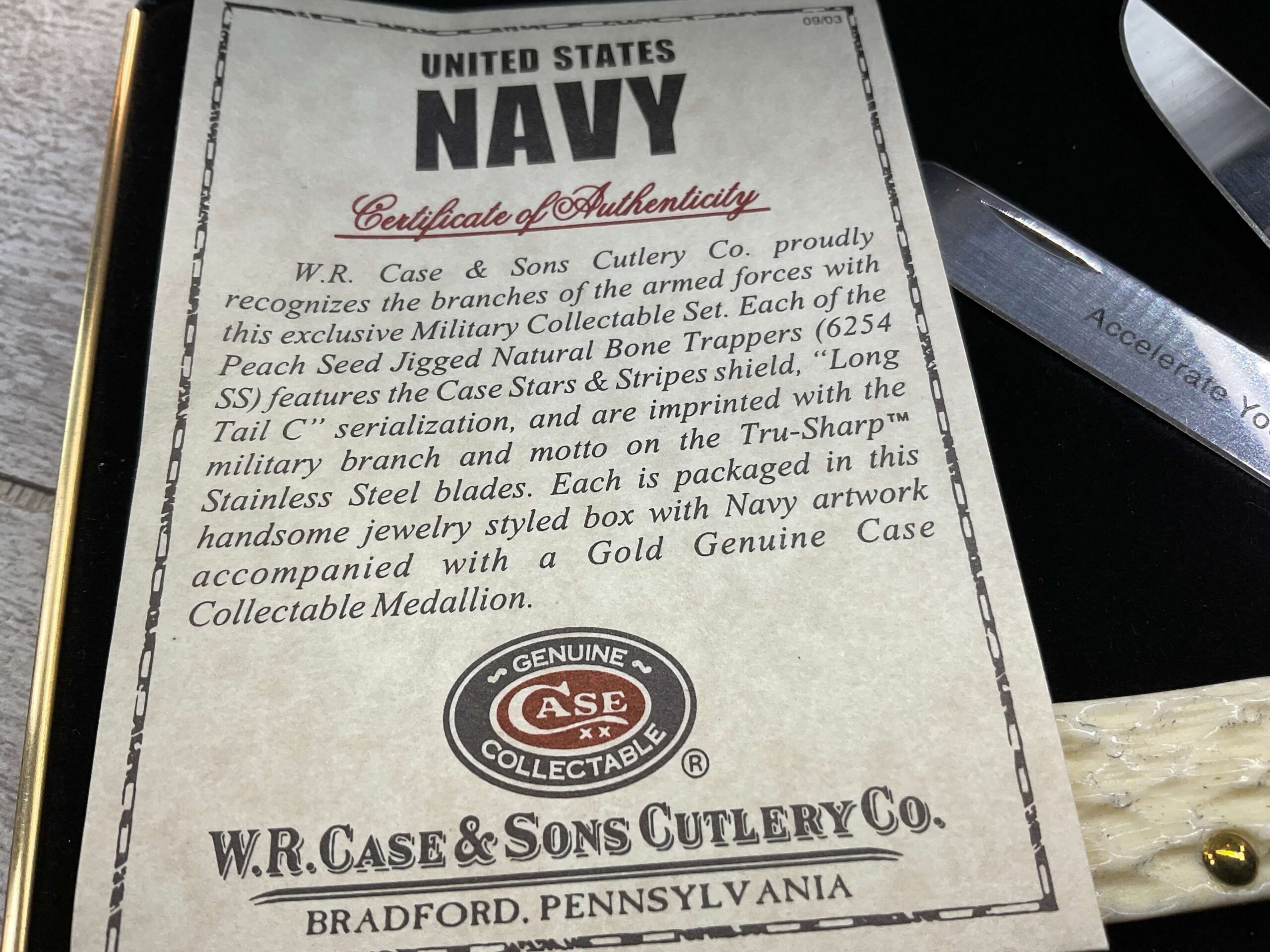 W.R. CASE & SONS CUTLERY CO. PROUDLY RECOGNIZES THE BRANCHES OF THE ARMED FORCES WITH THIS EXCLUSIZE MILITARY COLLECTABLE SET. EACH OF THE PEACH SEED JIGGERED NATURAL BONE TRAPPERS (6254SS) FEATURES THE CASE STARS AND STRIPES SHIELD. “LONG TAIL C” SERILIZATION AND ARE IMPRINTED WITH THE MILITARY BRANCH AND THE MOTTO ON THE TRU-SHARP STAINLESS STEEL BLADES. EACH IS PACKAGED IN A HANSOME JEWLERY STYLE BOX WITH NAVY ARTWORK ACCONPANIED WITH A GOLD GENUINE CASE COLLECTABLE MEDALLION.