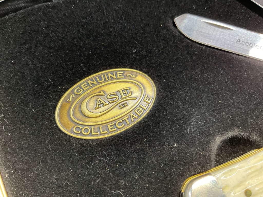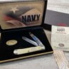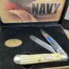 CASE MILITARY COLLECTION – NAVY, PEACH SEAD JIGGED NATURAL BONE TRAPPERS 6254SS KNIFE, BOX AND COVER SHEATH, TWO BLADE KNIFE FEATUREINGÂ “NAVY” AND “ACCELERATE YOUR LIFE” ON THE STAINLESS STEEL BLADES