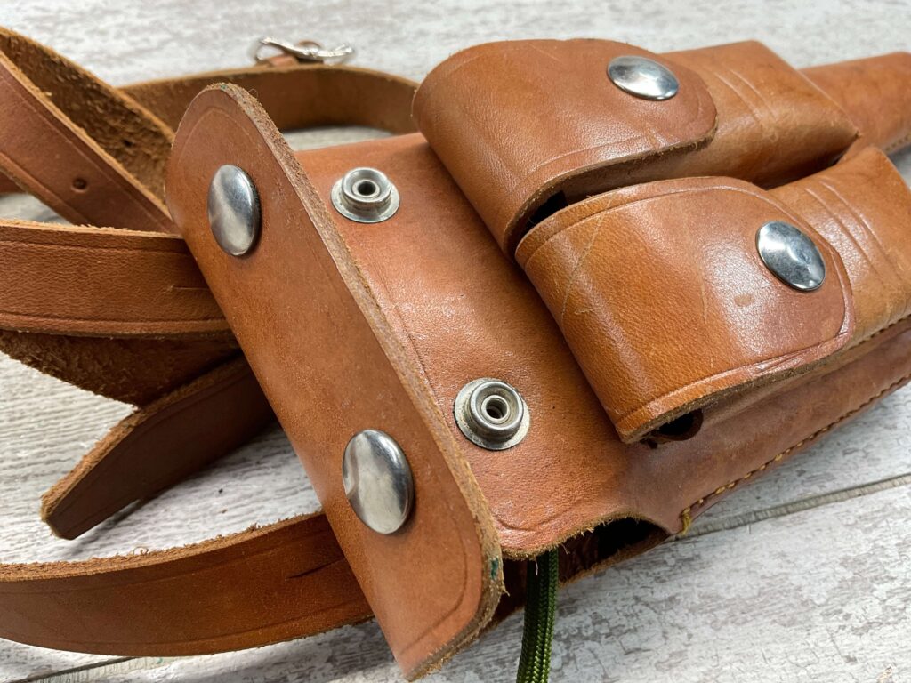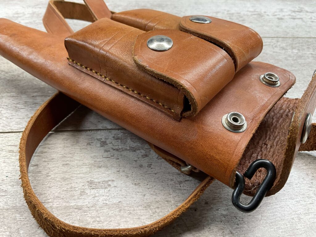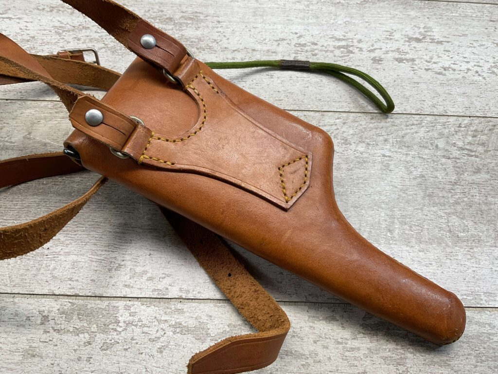 CHINESE IMPORT BOLO LEATHER HOLSTER W/ MAG POUCH, NO MARKINGS, LANYARD LOOP, LEATHER SHOULDER STRAP, CLEANING ROD, EXCELLENT OVERALL