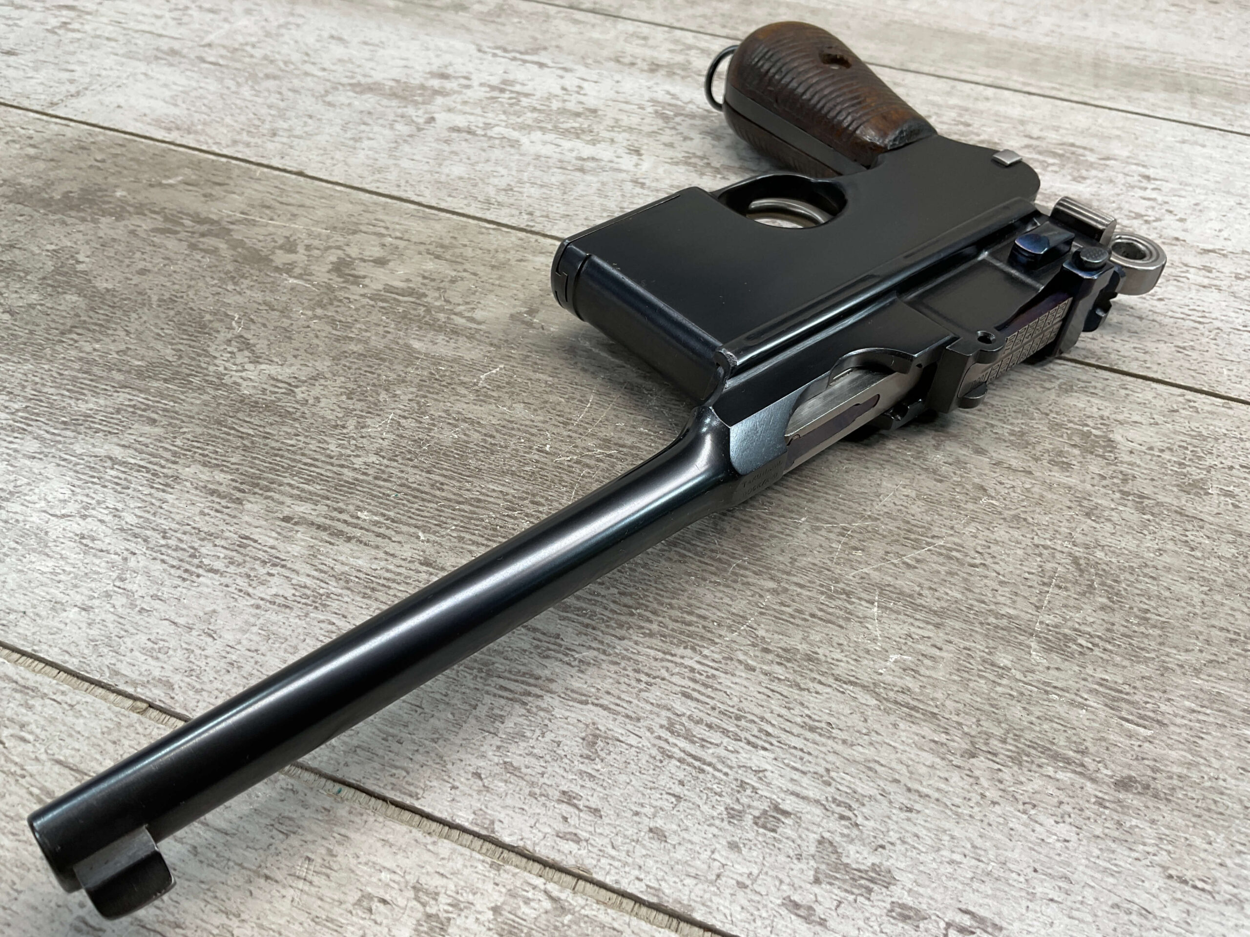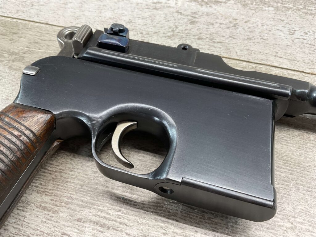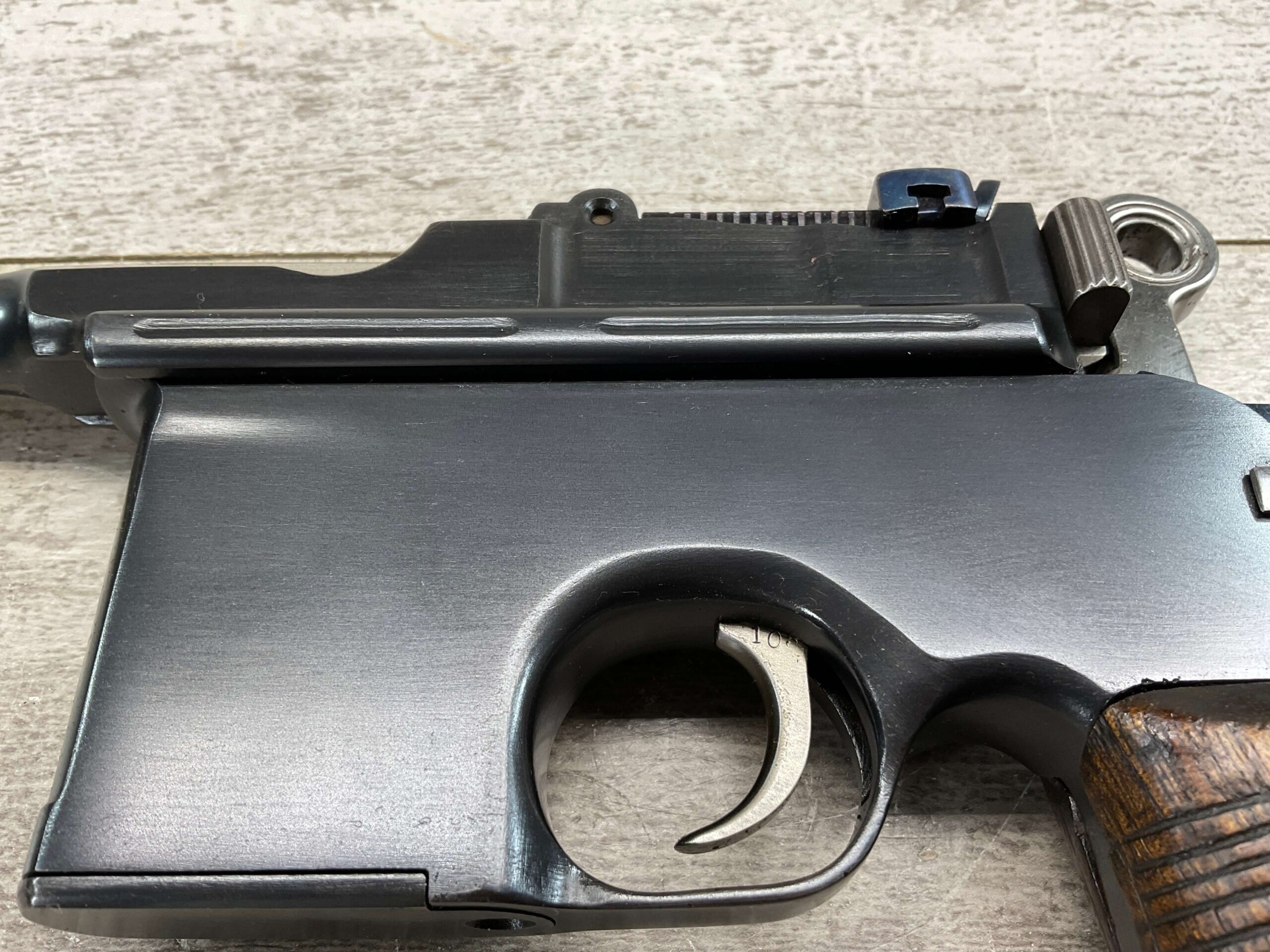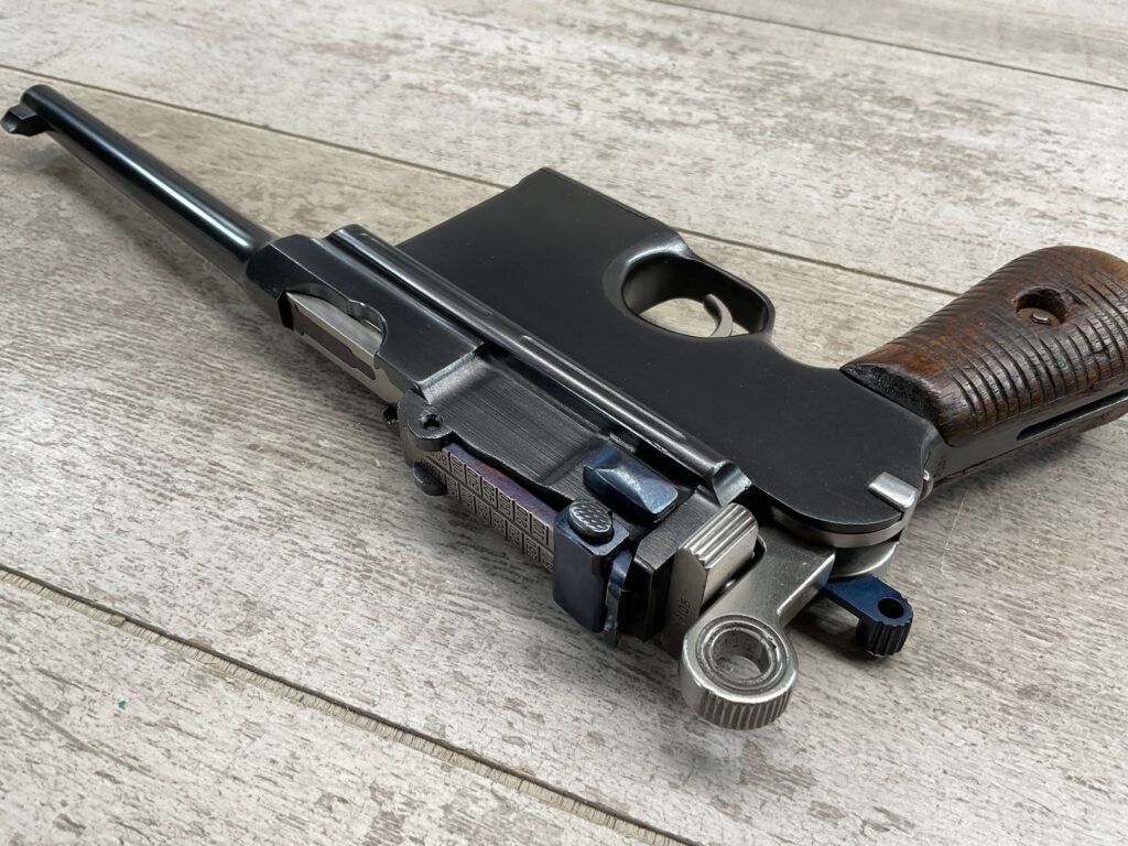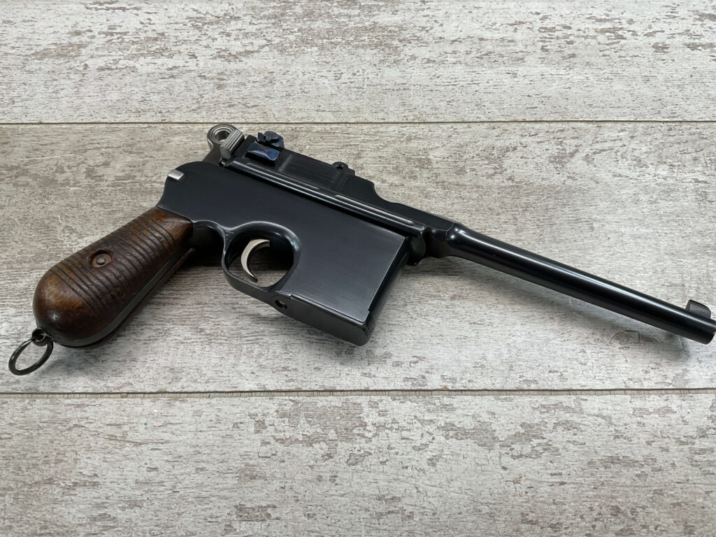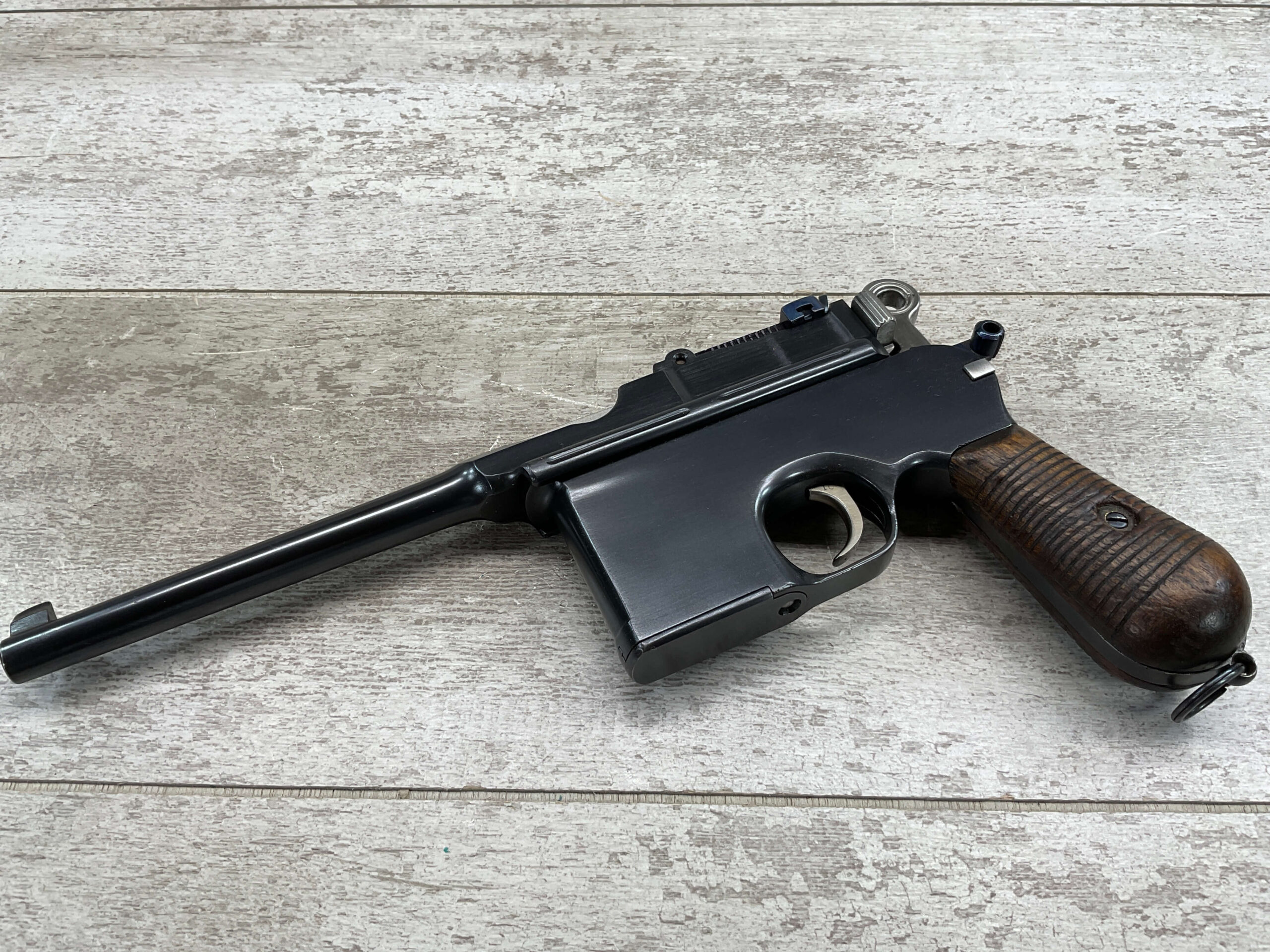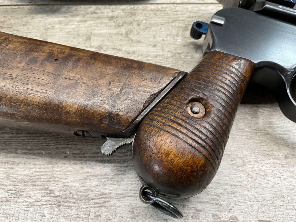 CHINESE TAKU NAVAL DOCKYARD C96 LARGE RING FLATSIDE PISTOL RIG, MATCHING #2105, 5.5″ BARREL, 98%+ BLUE, VG WOODEN GRIPS (UNMARKED) W/19 GROOVES, 50-1000 GRADUATED REAR SIGHT W/FIXED FRONT SIGHT, CHAMBER MARKED “TAKU NAVAL/DOCKYARD”, NO WAVES IN FINISH & HAS BEEN PROFESSIONALLY RESTORED, DARKER BORE W/ LIGHT FROSTING, 7.63mm, MAUSER BANNER MARKED WOODEN STOCK IN EXC CONDITION & FITS THE FIREARM PERFECTLY, LEATHER ALSO EXCELLENT, ORIGINAL CLEANING ROD INCLUDED, LANYARD RING, NOT SURE YOU’LL FIND ANOTHER IN THIS CONDITION!! GREAT INVESTMENT PIECE