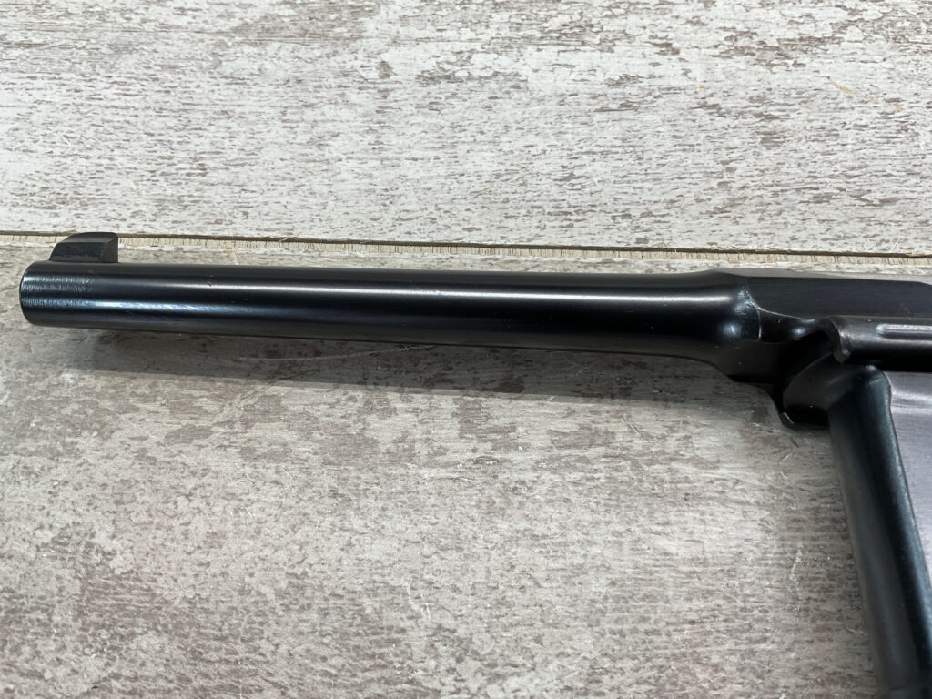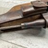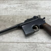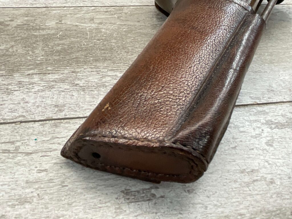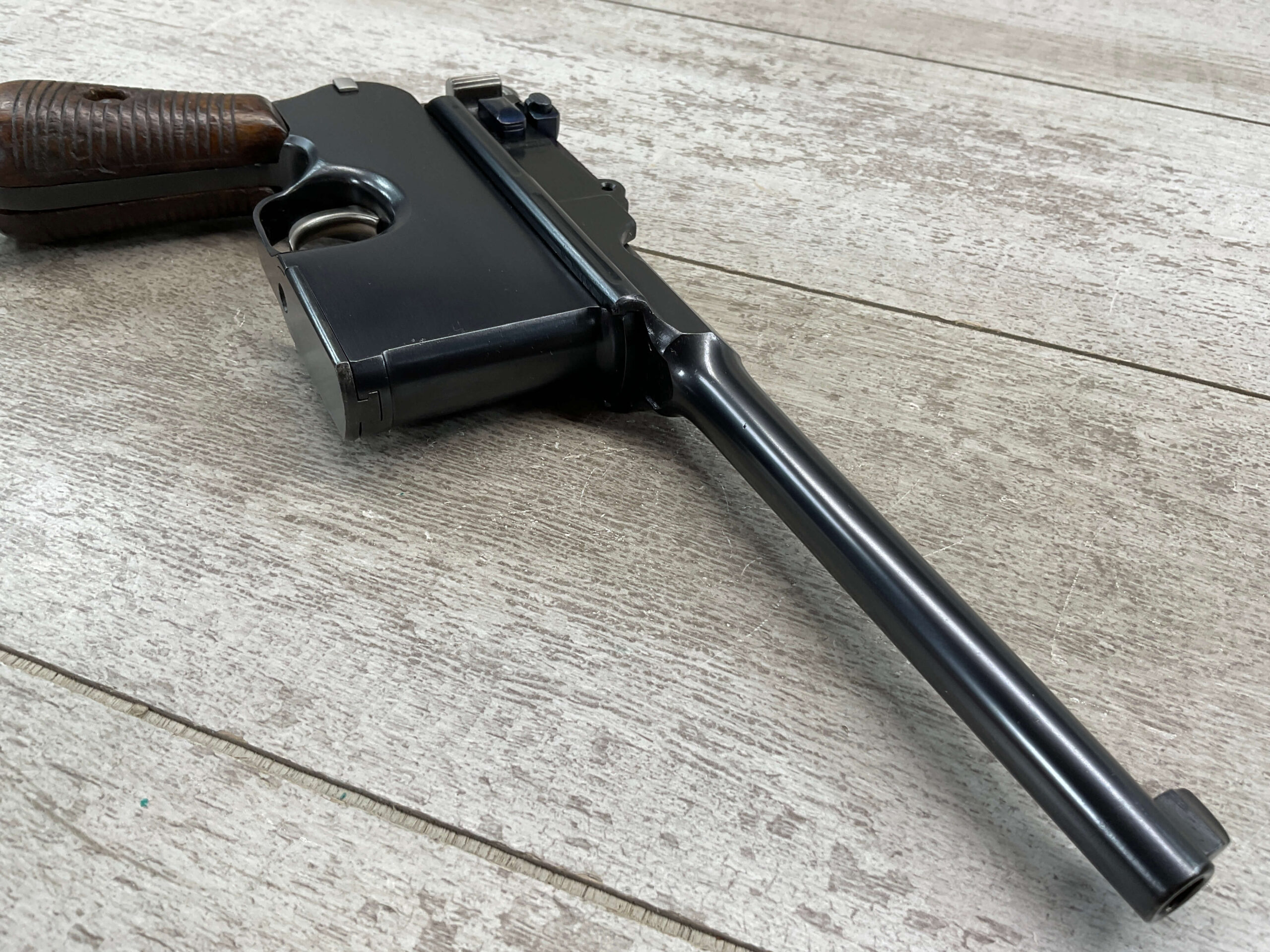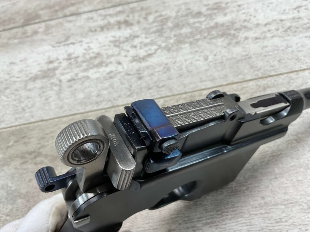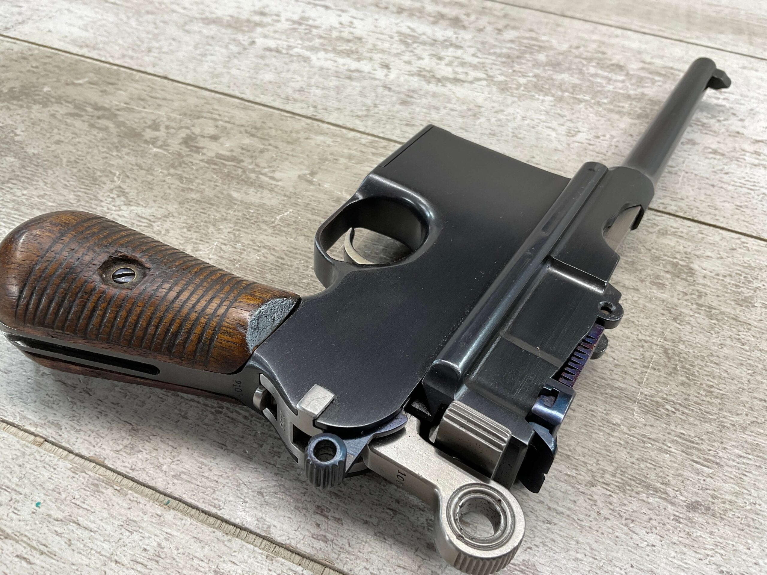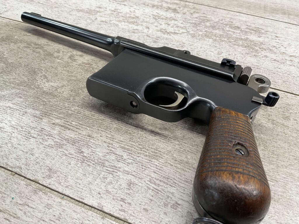 CHINESE TAKU NAVAL DOCKYARD C96 LARGE RING FLATSIDE PISTOL RIG, MATCHING #2105, 5.5″ BARREL, 98%+ BLUE, VG WOODEN GRIPS (UNMARKED) W/19 GROOVES, 50-1000 GRADUATED REAR SIGHT W/FIXED FRONT SIGHT, CHAMBER MARKED “TAKU NAVAL/DOCKYARD”, NO WAVES IN FINISH & HAS BEEN PROFESSIONALLY RESTORED, DARKER BORE W/ LIGHT FROSTING, 7.63mm, MAUSER BANNER MARKED WOODEN STOCK IN EXC CONDITION & FITS THE FIREARM PERFECTLY, LEATHER ALSO EXCELLENT, ORIGINAL CLEANING ROD INCLUDED, LANYARD RING, NOT SURE YOU’LL FIND ANOTHER IN THIS CONDITION!! GREAT INVESTMENT PIECE