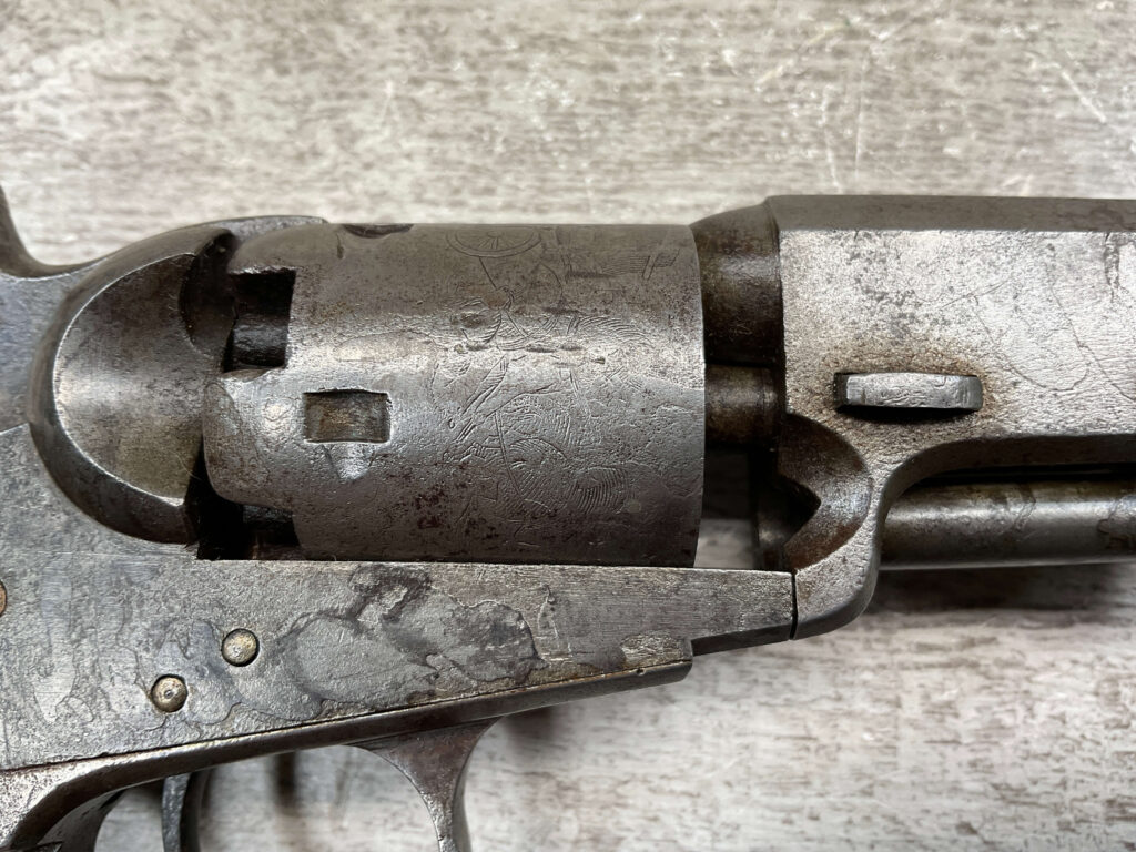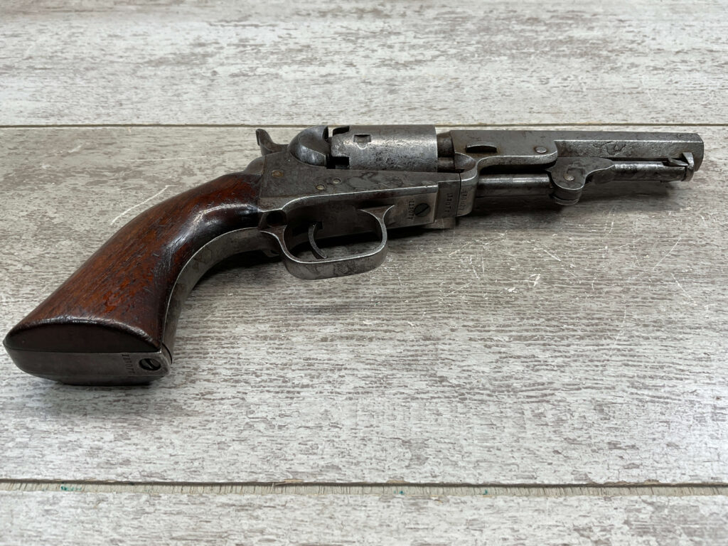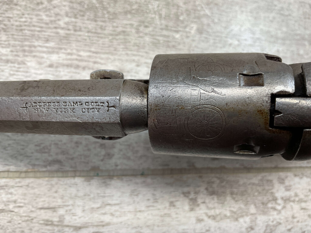 COLT 1849 STAGE COACH .31 CAL ANTIQUE REVOLVER, 1856 MFR #113077, .31 CAL, ALL MATCHING, 4″ OCTAGON BARREL, PARTIAL STAGE COACH CYLINDER SCENE, GREY PATINA, VG WALNUT SMOOTH GRIPS, NOT A REPRODUCTION, OVERALL CONDITION AS SEEN IN PHOTOS.