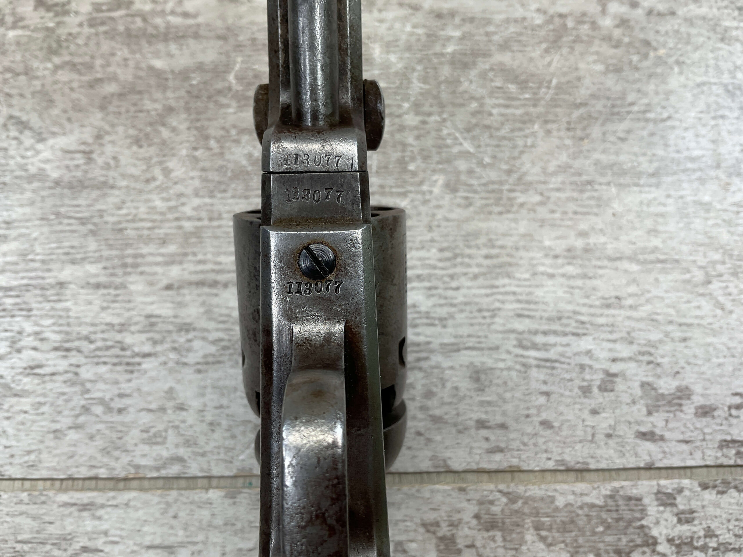 COLT 1849 STAGE COACH .31 CAL ANTIQUE REVOLVER, 1856 MFR #113077, .31 CAL, ALL MATCHING, 4″ OCTAGON BARREL, PARTIAL STAGE COACH CYLINDER SCENE, GREY PATINA, VG WALNUT SMOOTH GRIPS, NOT A REPRODUCTION, OVERALL CONDITION AS SEEN IN PHOTOS.