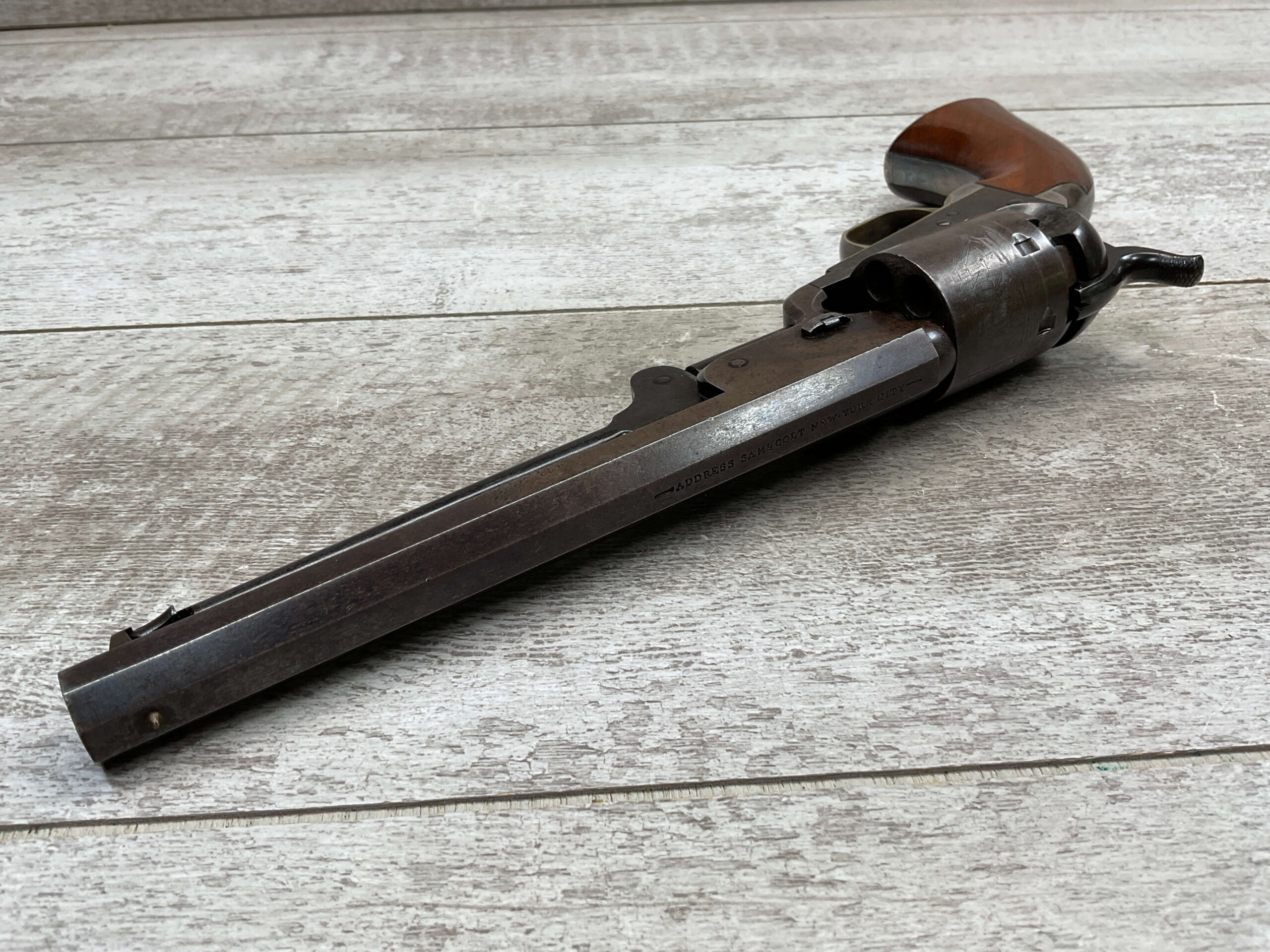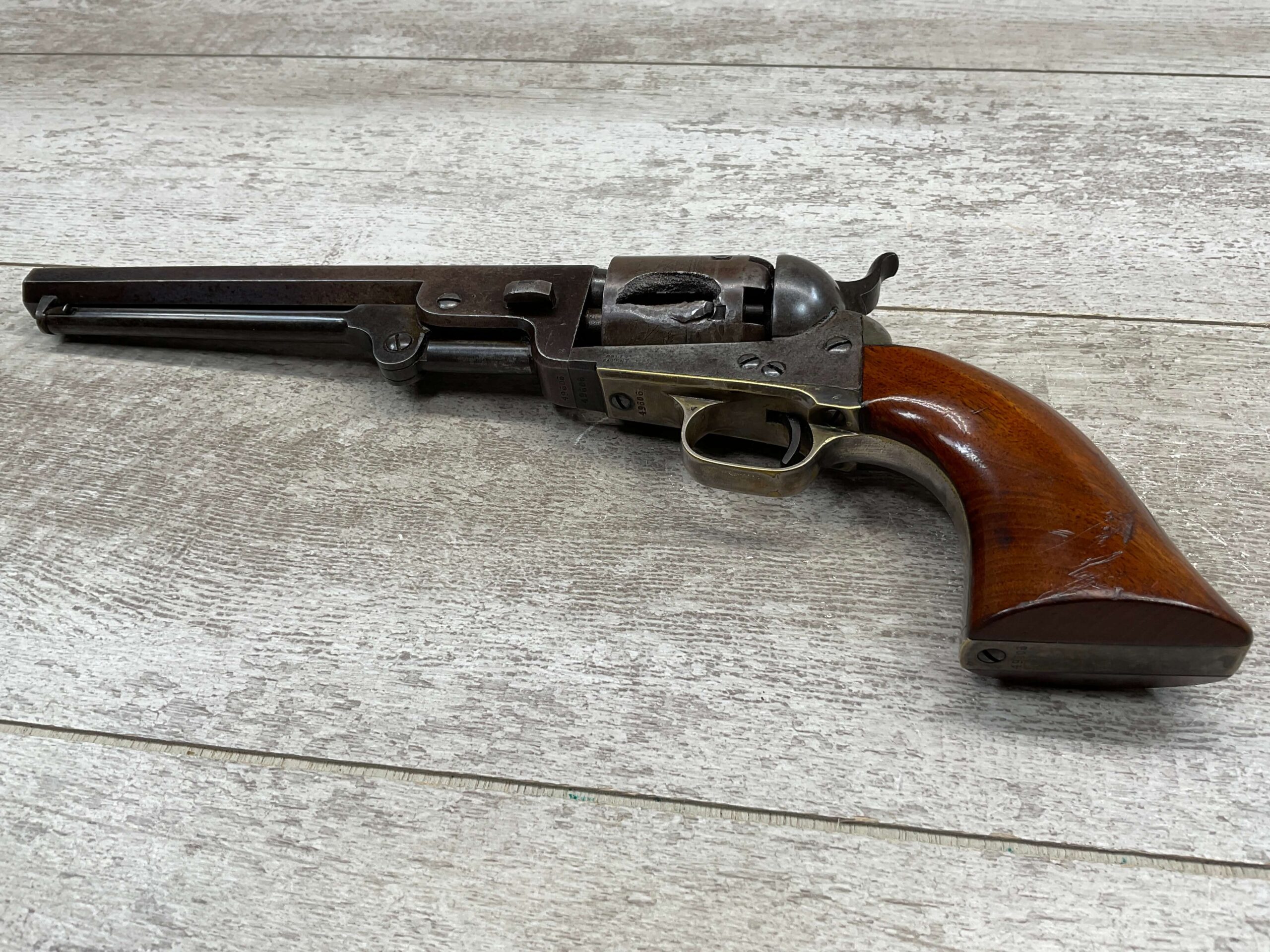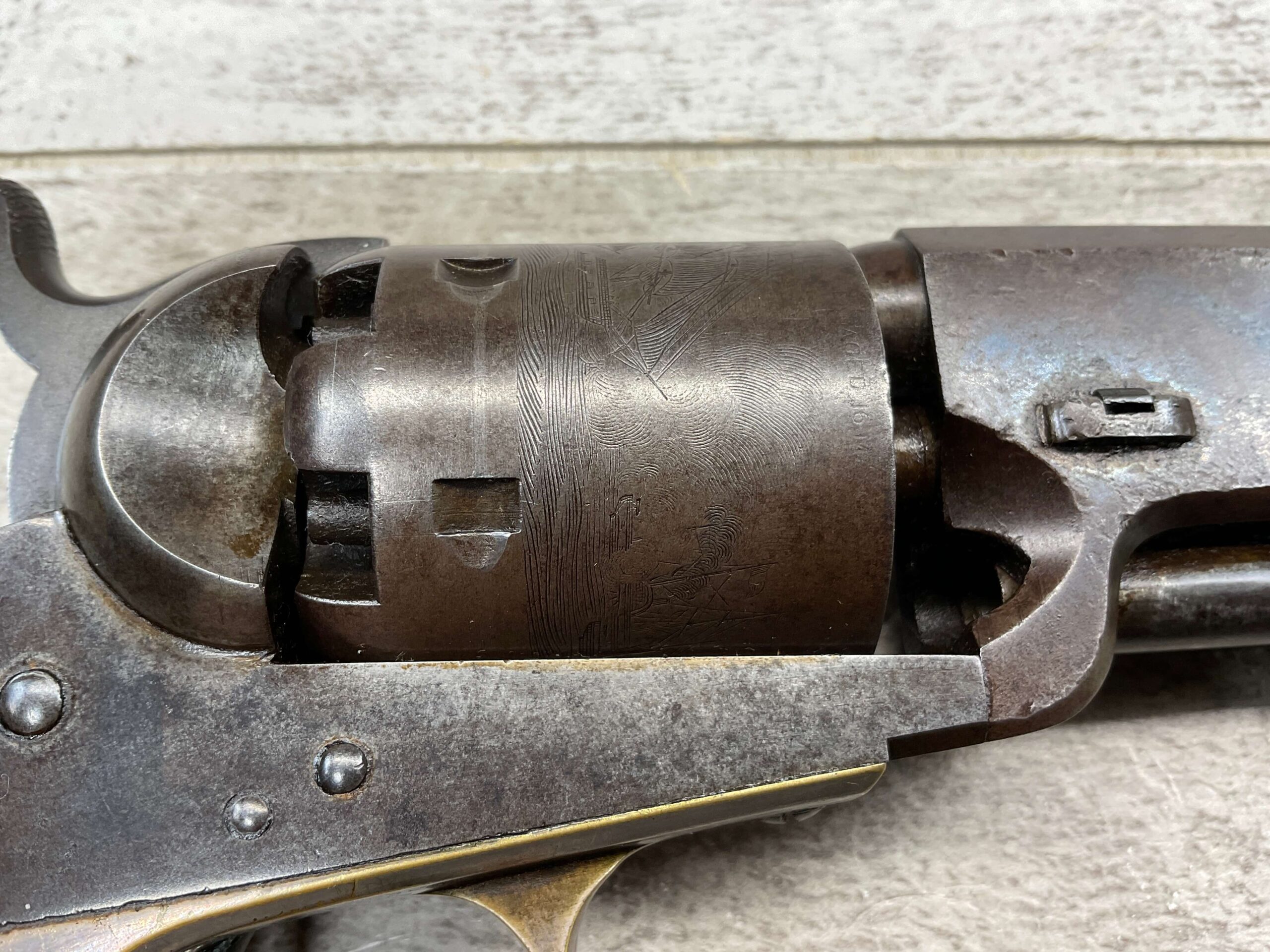 COLT 1851 NAVY .36 CAL ANTIQUE REVOLVER, 1856 MFR #49606, .36 CAL, ALL MATCHING W/ 7.5″ OCTAGON BARREL, LIGHT NAVY ENGAGEMENT CYLINDER SCENE VISIBLE W/ BLOWN CYLINDER (SEE PICS), BROWN PATINA W/ SOME ORIGINAL BLUE REMAINING, BRASS BACKSTRAP & TRIGGER GUARD, EXC SMOOTH WALNUT GRIPS, NON FUNCTIONING, NOT A REPRODUCTION, OVERALL CONDITION AS SEEN IN PHOTOS.