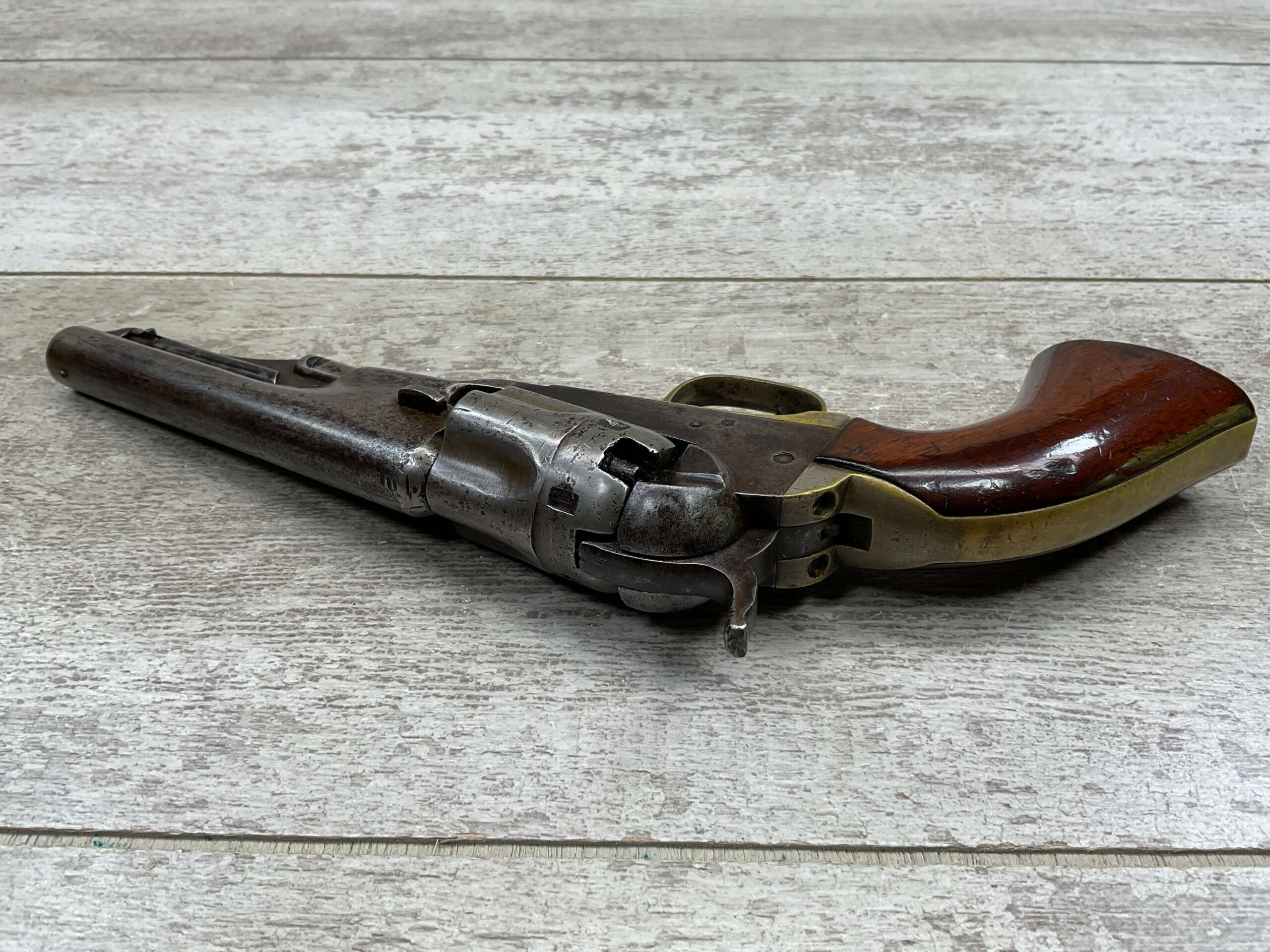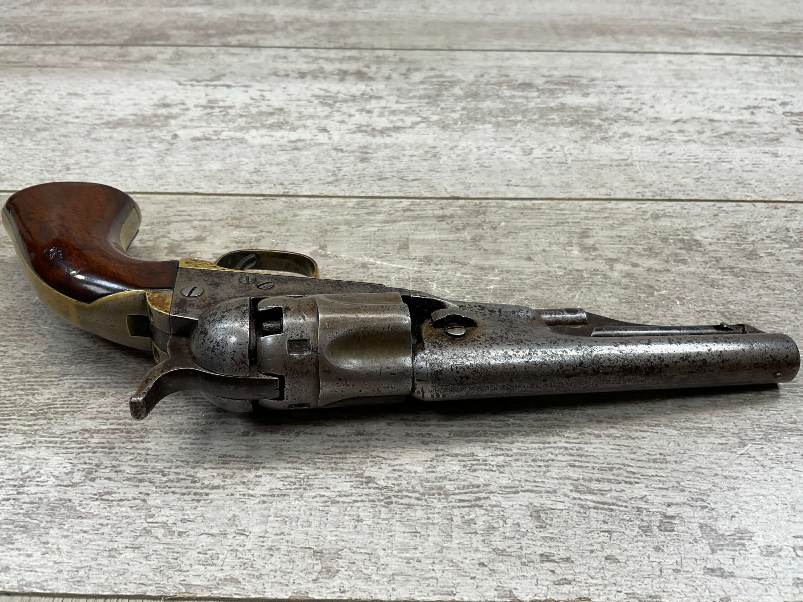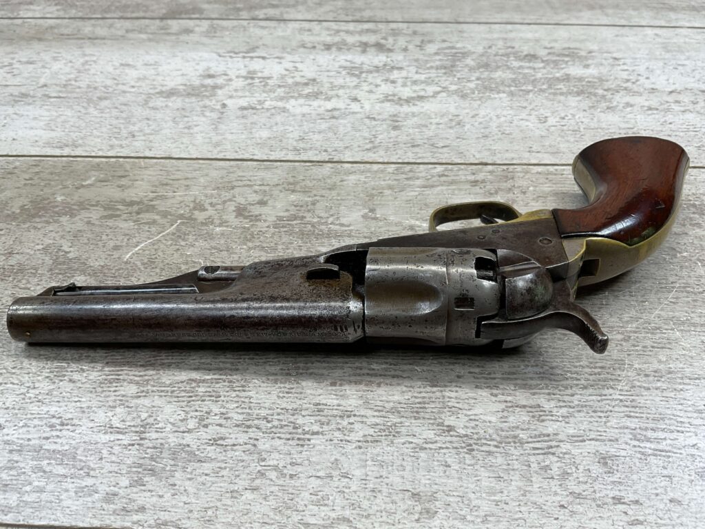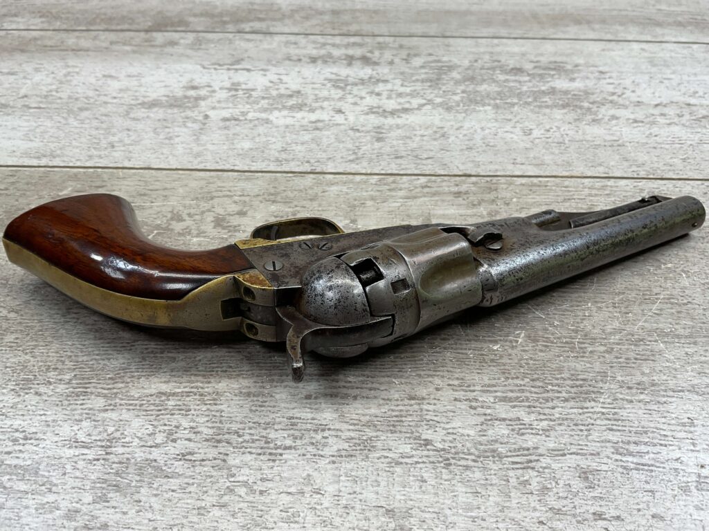 COLT 1862 POLICE .36 CAL ANTIQUE PERCUSSION REVOLVER, 1861 MFR #7153 CIVIL WAR ERA, 4 1/2″ ROUND BARREL, 5 SHOT FLUTED CYLINDER, EXC SMOOTH WALNUT GRIPS, ALL MATCHING, FULLY FUNCTIONING, BRASS TRIGGER GUARD & BACKSTRAP, MOST BLUING HAS TURNED GREY PATINA, NOT A REPRODUCTION, OVERALL CONDITION AS SEEN IN PHOTOS.