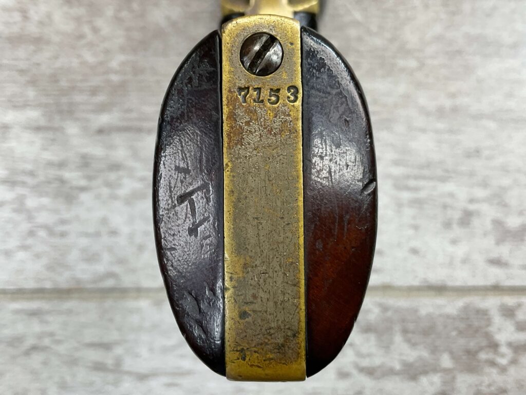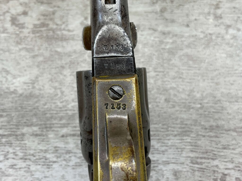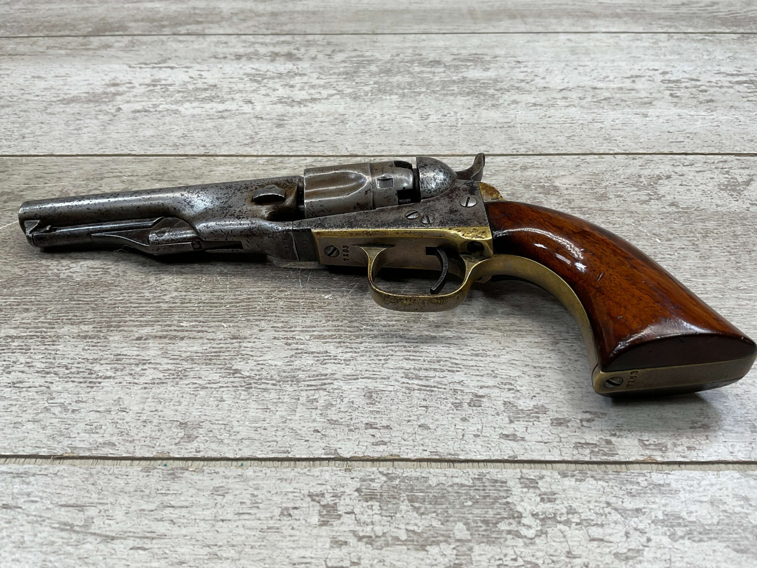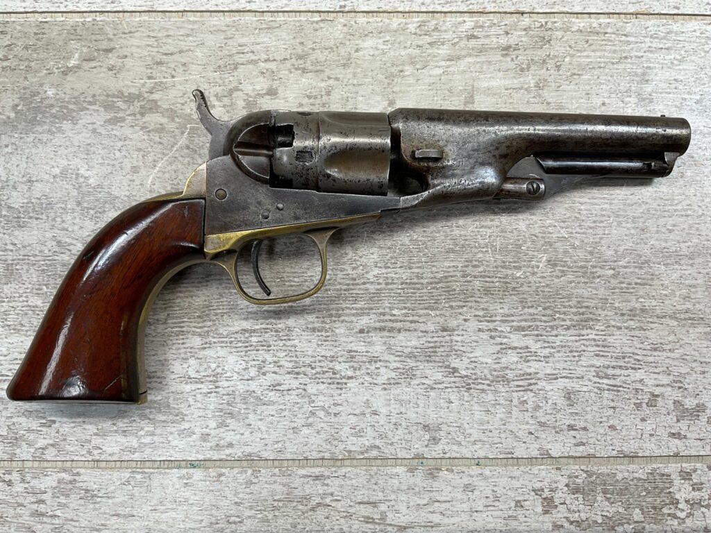 COLT 1862 POLICE .36 CAL ANTIQUE PERCUSSION REVOLVER, 1861 MFR #7153 CIVIL WAR ERA, 4 1/2″ ROUND BARREL, 5 SHOT FLUTED CYLINDER, EXC SMOOTH WALNUT GRIPS, ALL MATCHING, FULLY FUNCTIONING, BRASS TRIGGER GUARD & BACKSTRAP, MOST BLUING HAS TURNED GREY PATINA, NOT A REPRODUCTION, OVERALL CONDITION AS SEEN IN PHOTOS.
